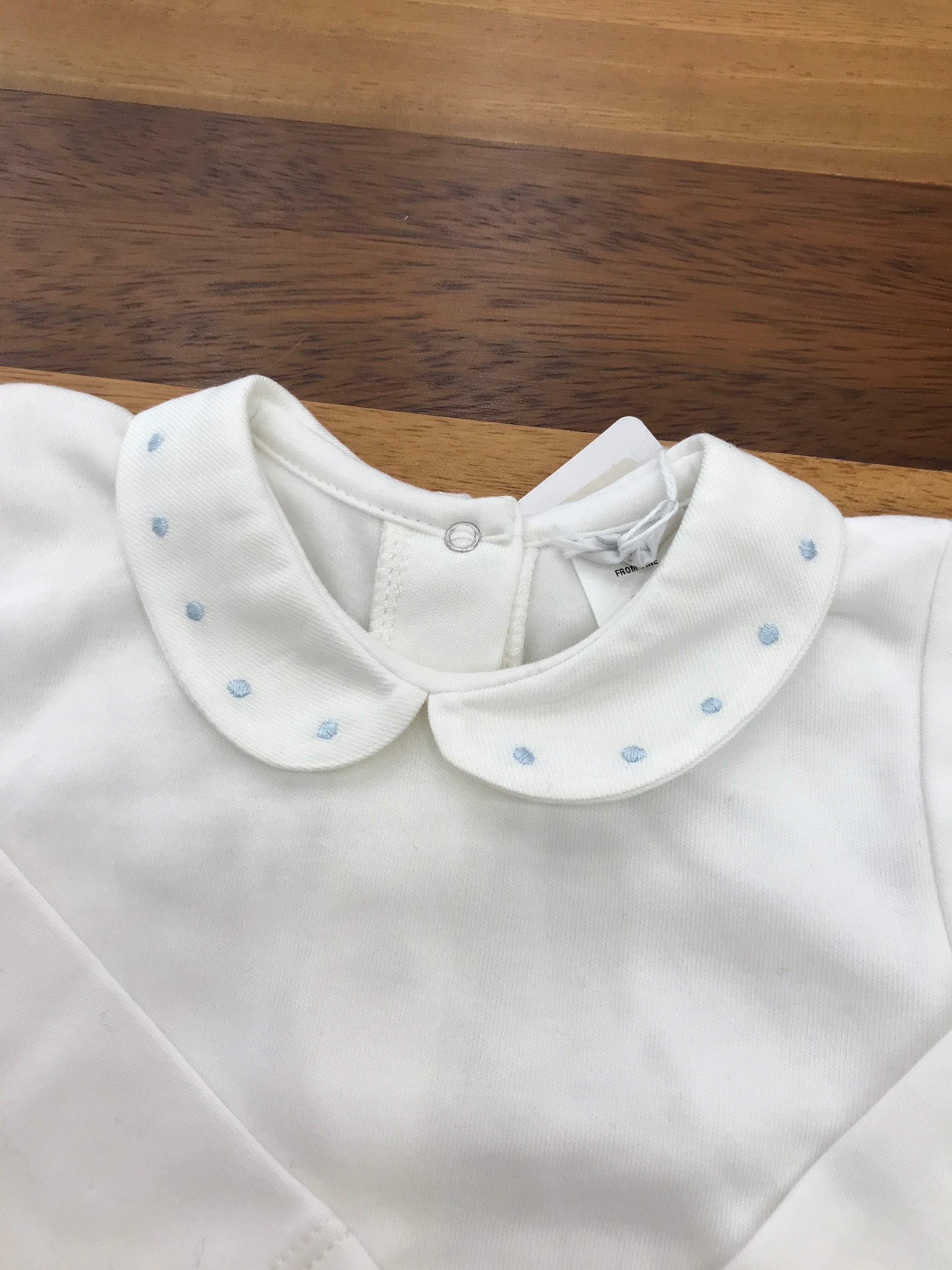 Body in caldo cotone a manica lunga, caratterizzato da un colletto impreziosito da pois celesti.