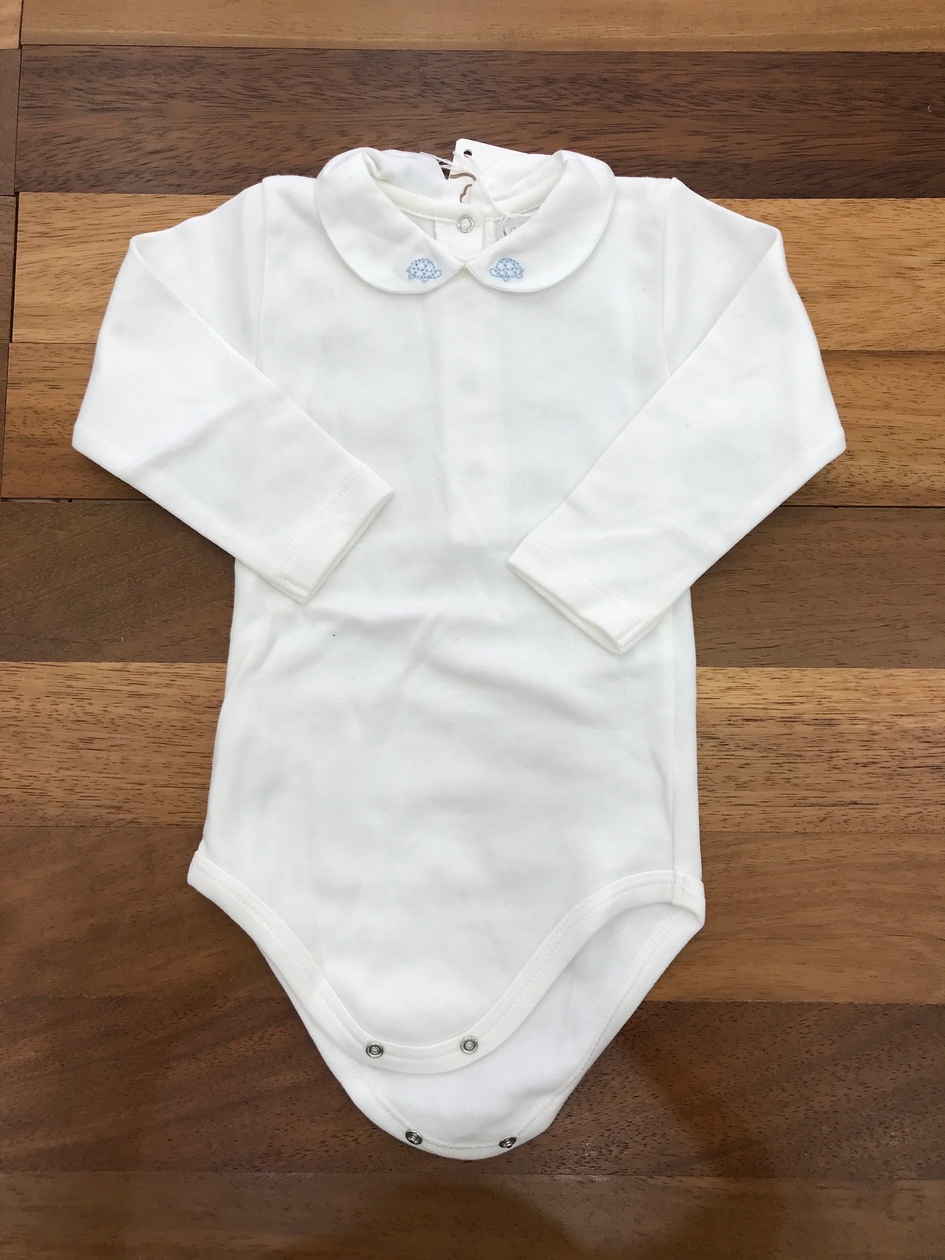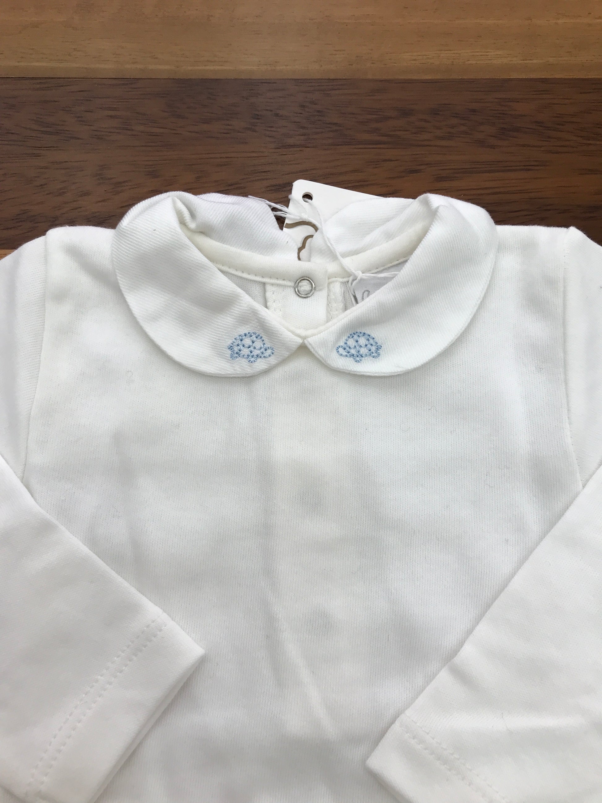 Questo body in caldo cotone è caratterizzato da maniche lunghe e un colletto impreziosito da due piccole tartarughe ricamate in azzurro.