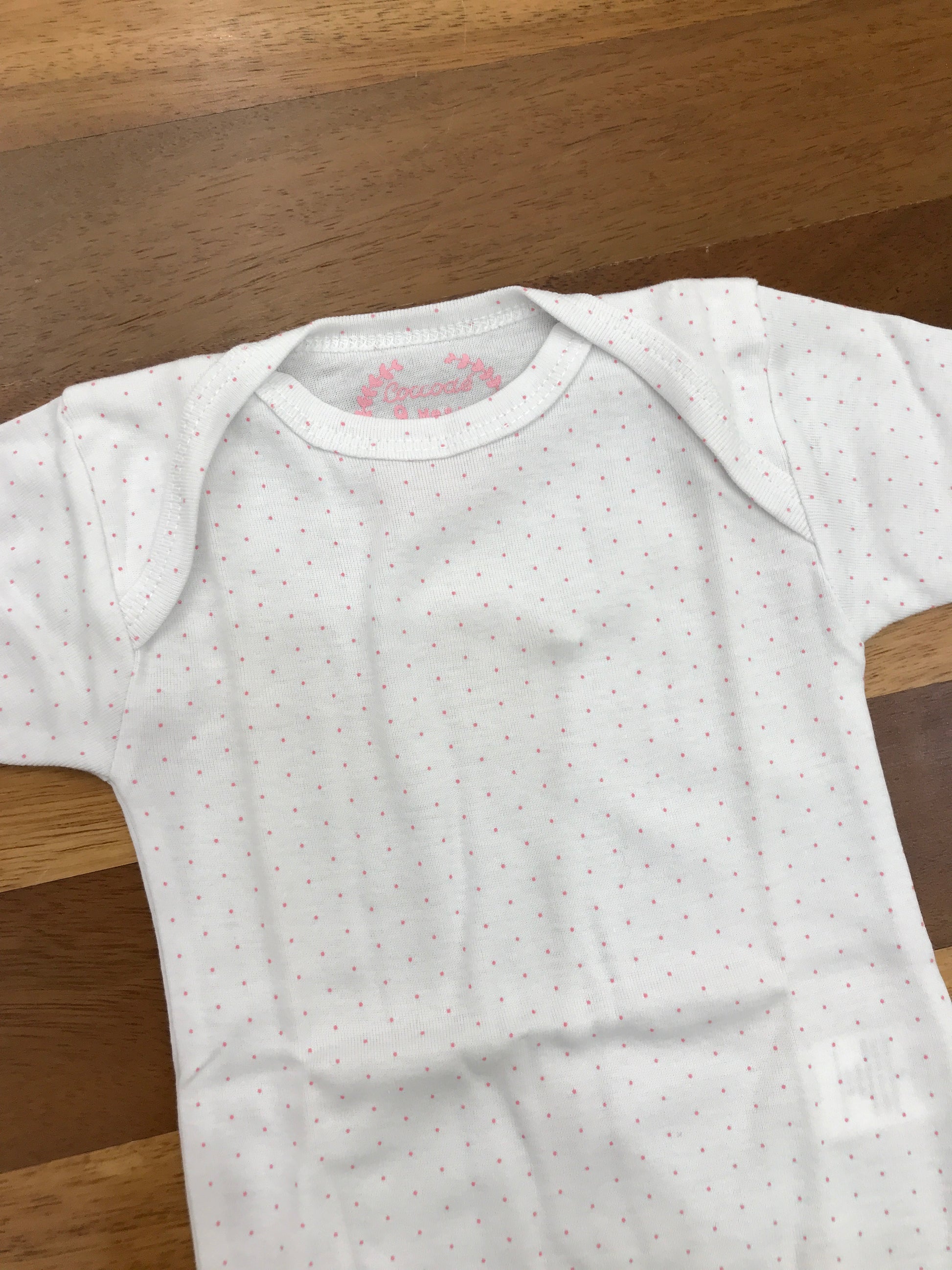 Delicato body in cotone caldo, caratterizzato da un elegante motivo a pois rosa su fondo bianco. Realizzato con materiali di qualità per garantire morbidezza e comfort durante tutto il giorno, ideale per i più piccoli che necessitano di capi pratici e raffinati.