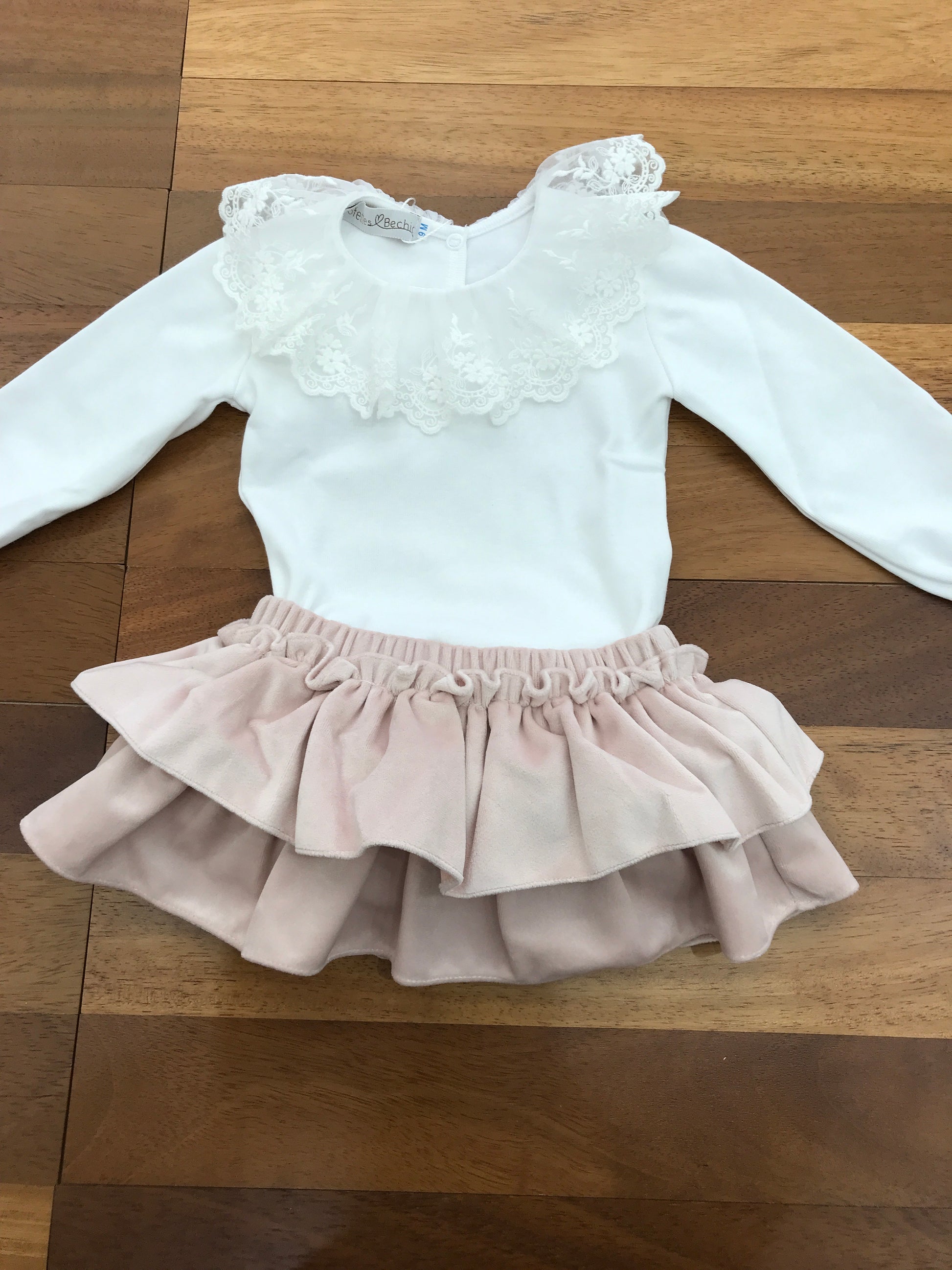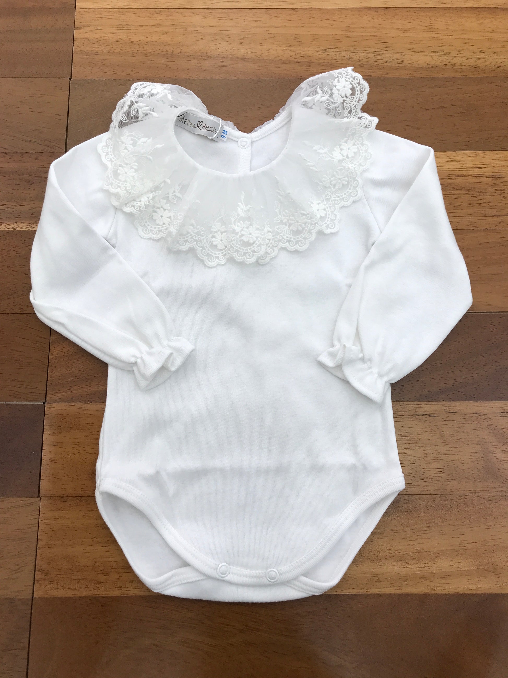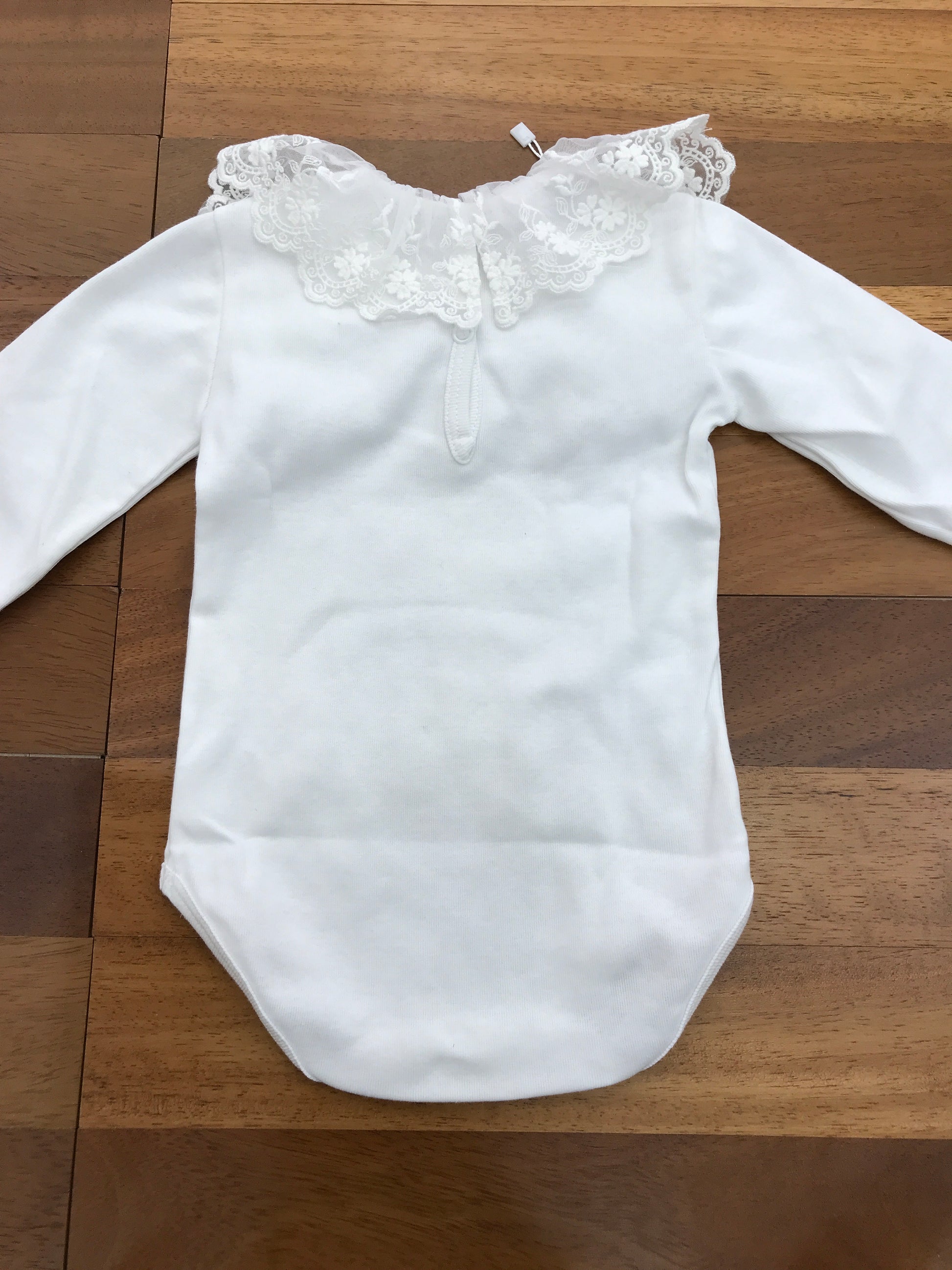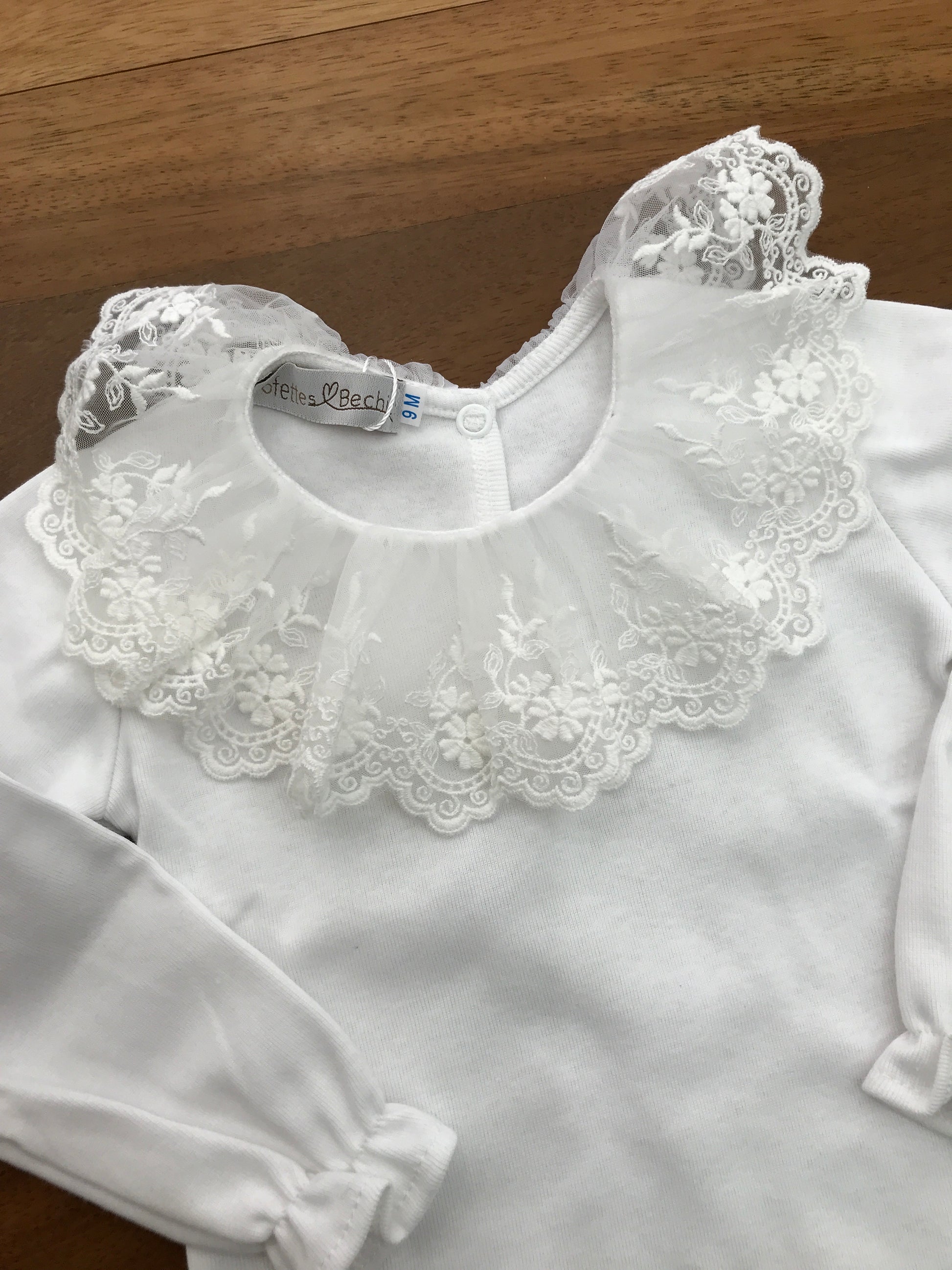 Body in caldo cotone, con collo decorato da pizzo smerlato e maniche rifinite con riccetto.