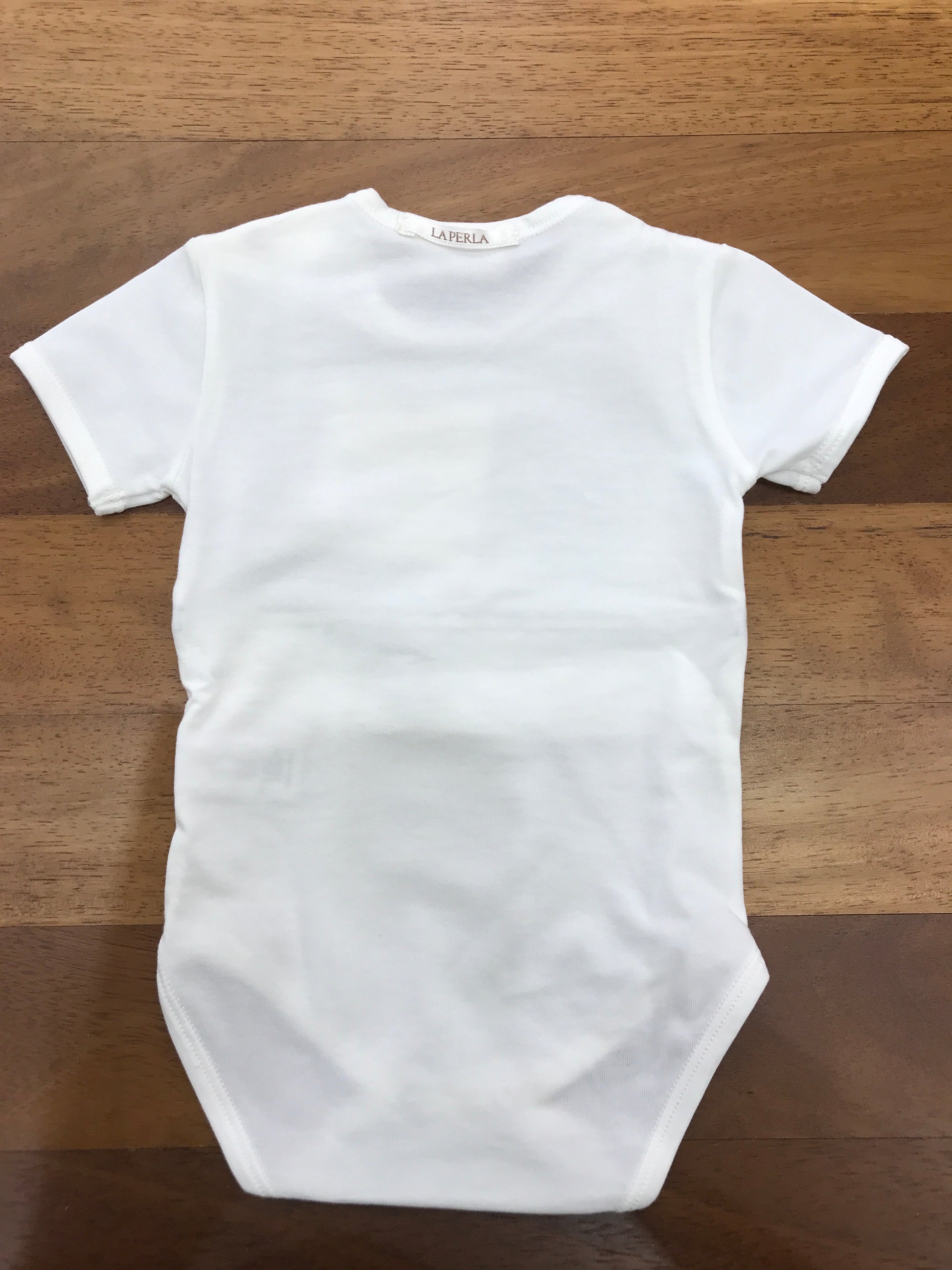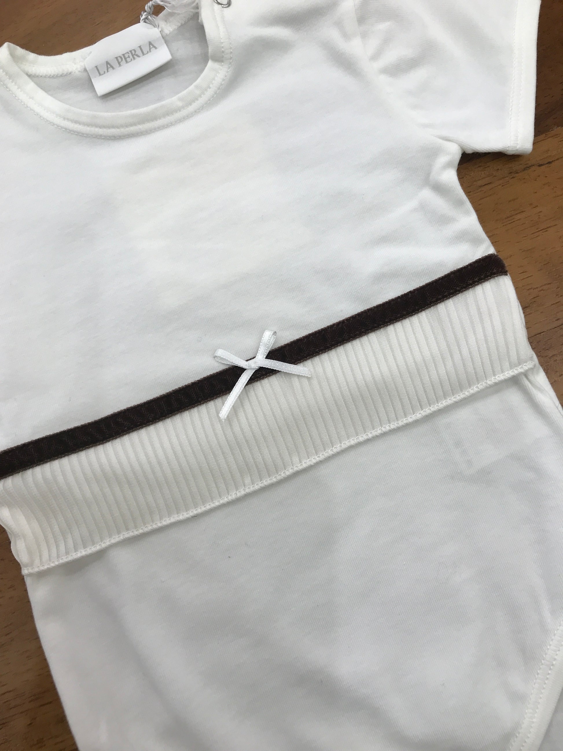 Body in caldo cotone a maniche lunghe color panna, caratterizzato da una fascia in velluto composta da due tonalità: marroncino e panna.
