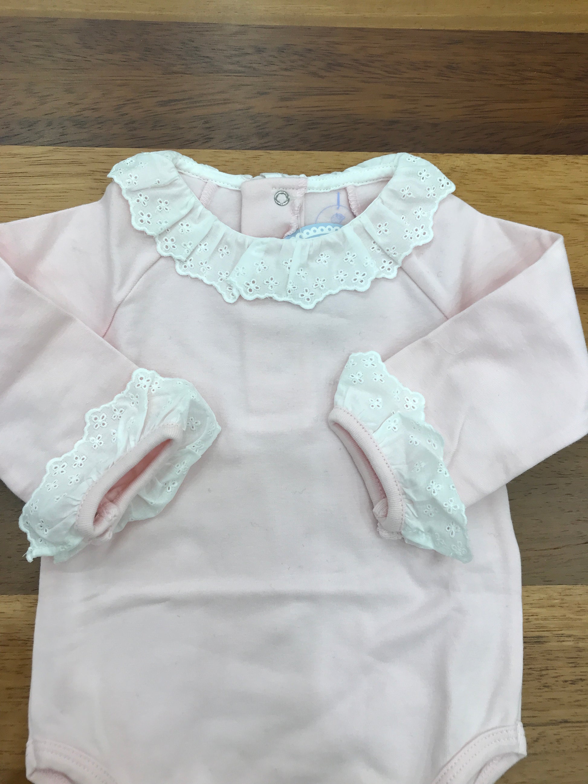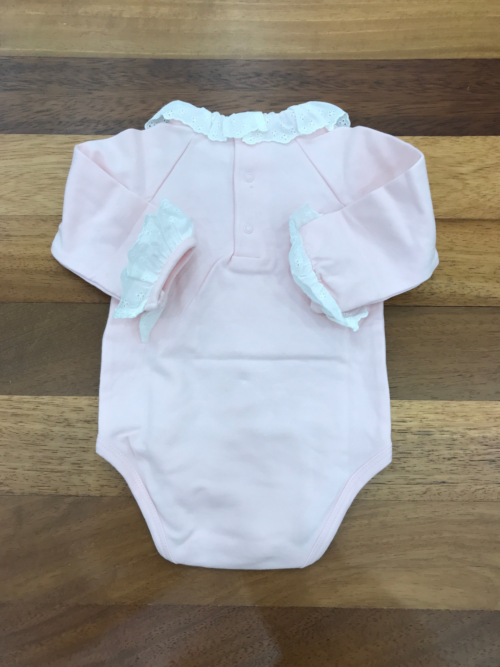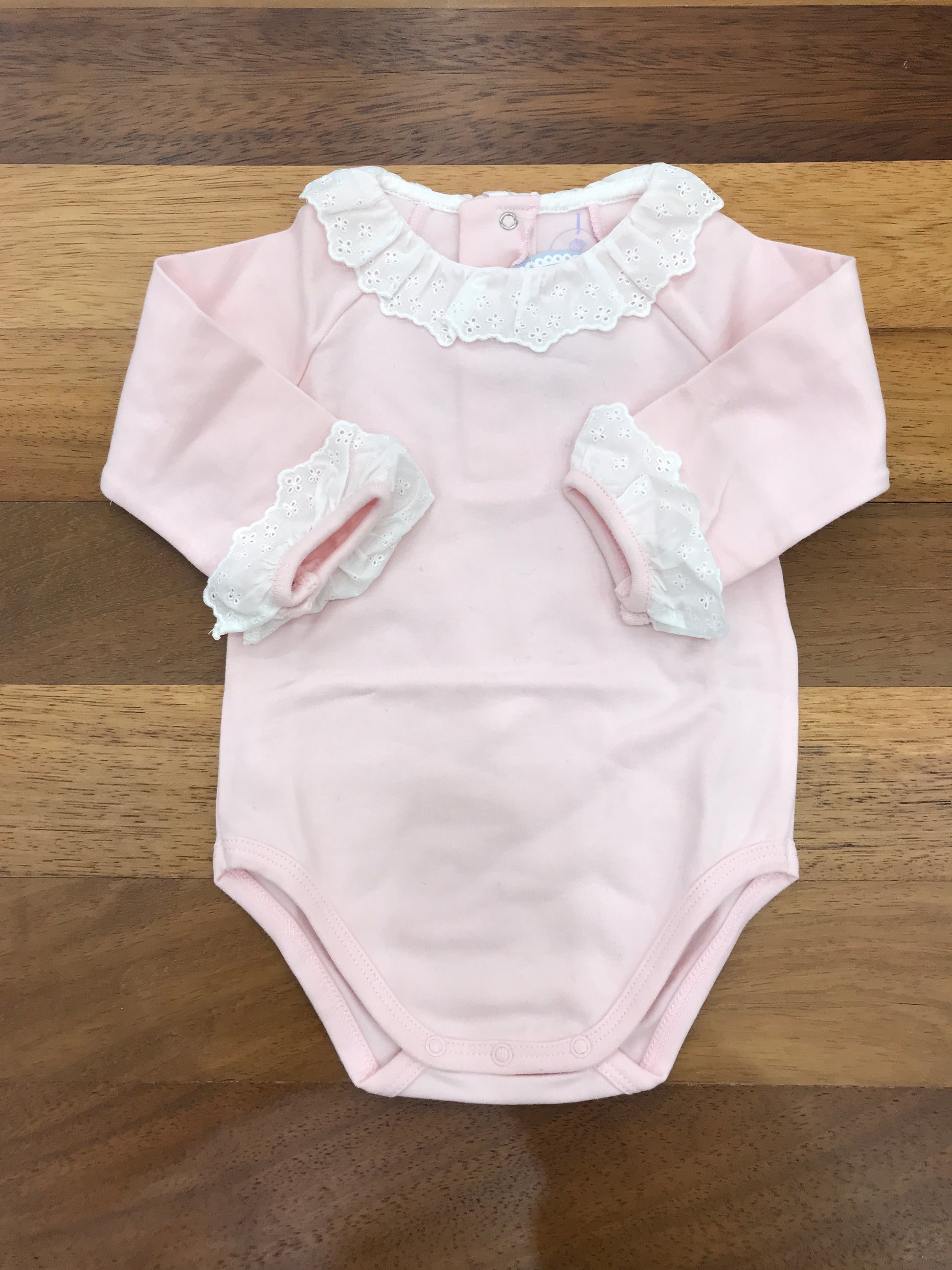 Body a maniche lunghe realizzato in caldo cotone rosa, impreziosito da un colletto in merletto e da dettagli in merletto posizionati vicino alle maniche.