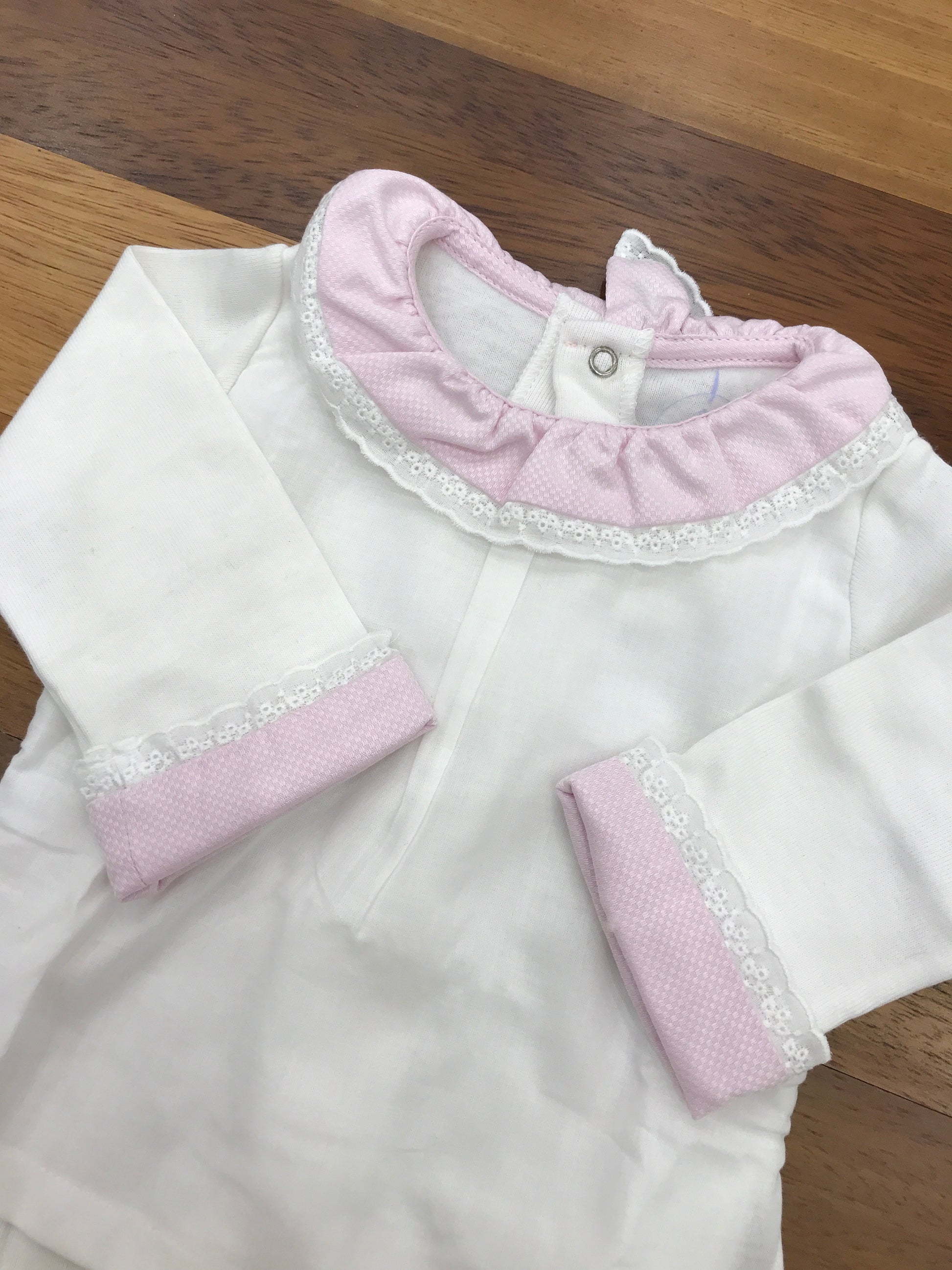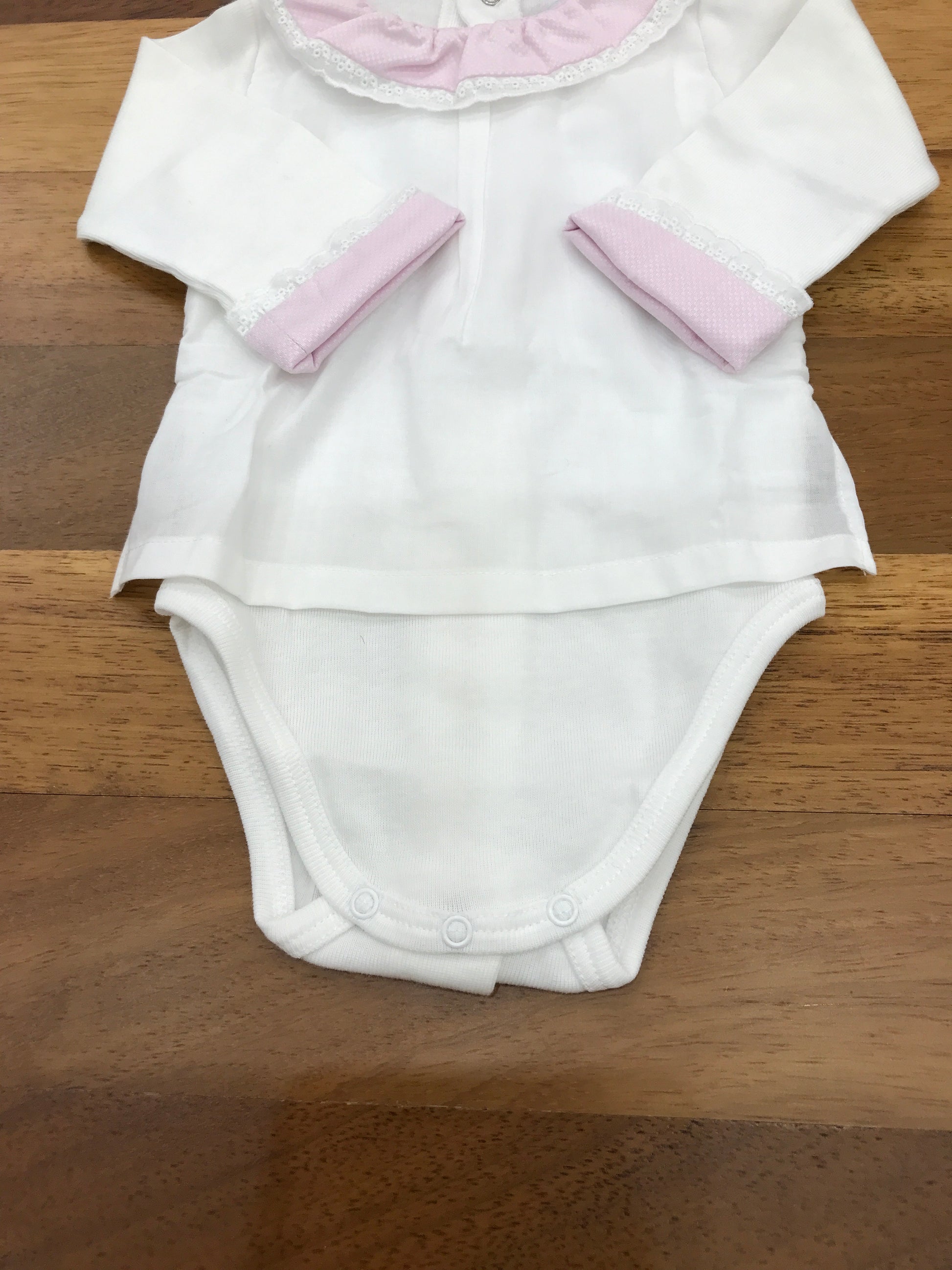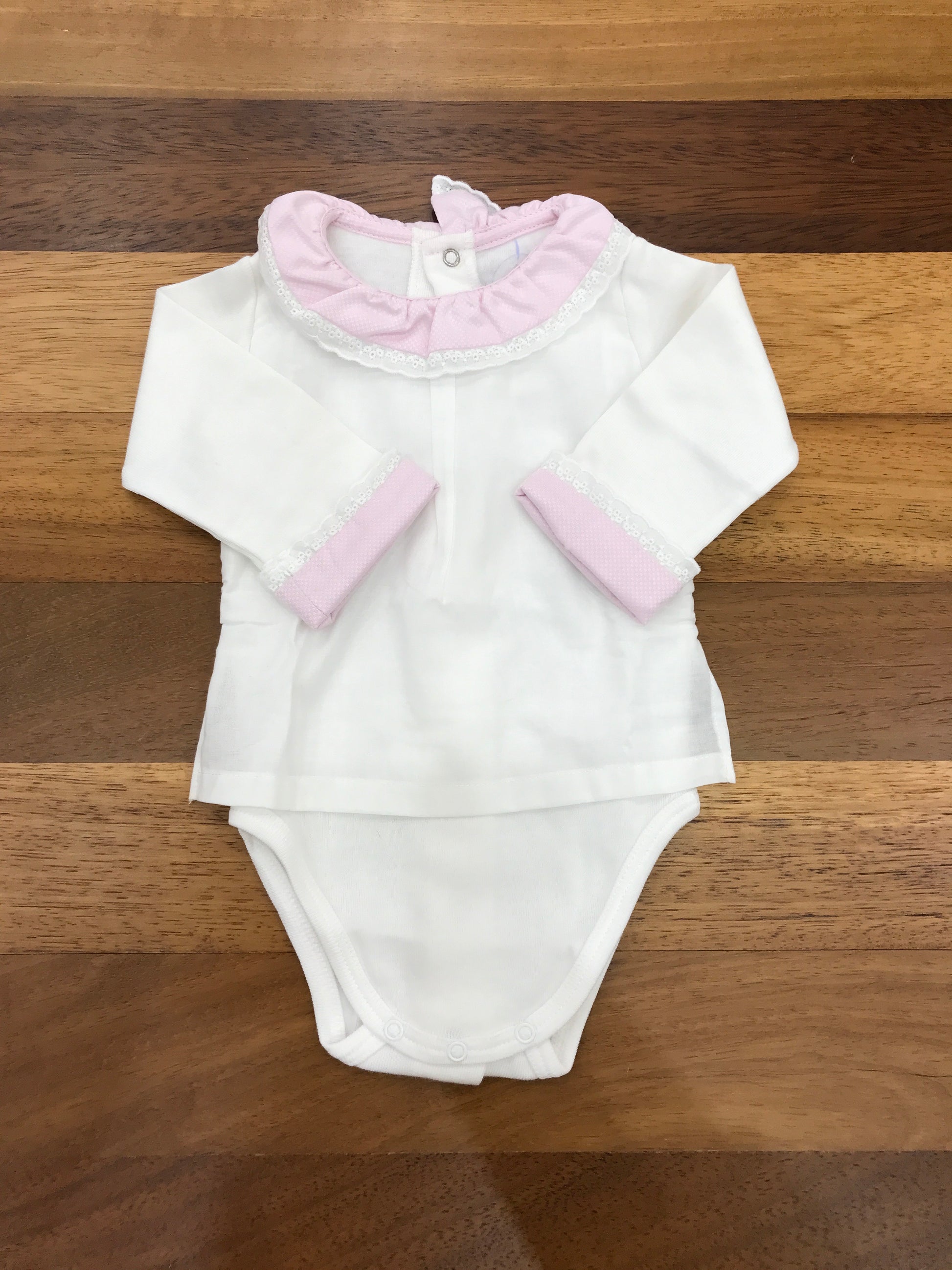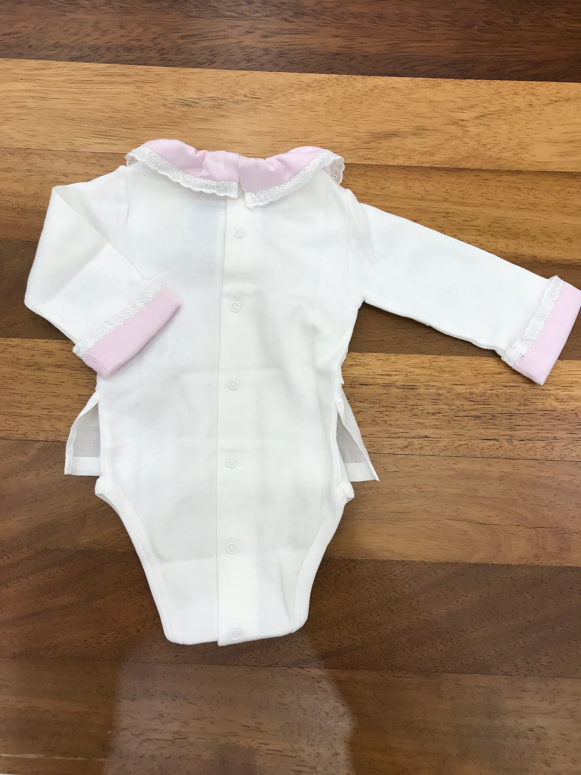 Body realizzato in caldo cotone con effetto camicia, presenta un colletto e maniche rosa con dettagli ai bordi.