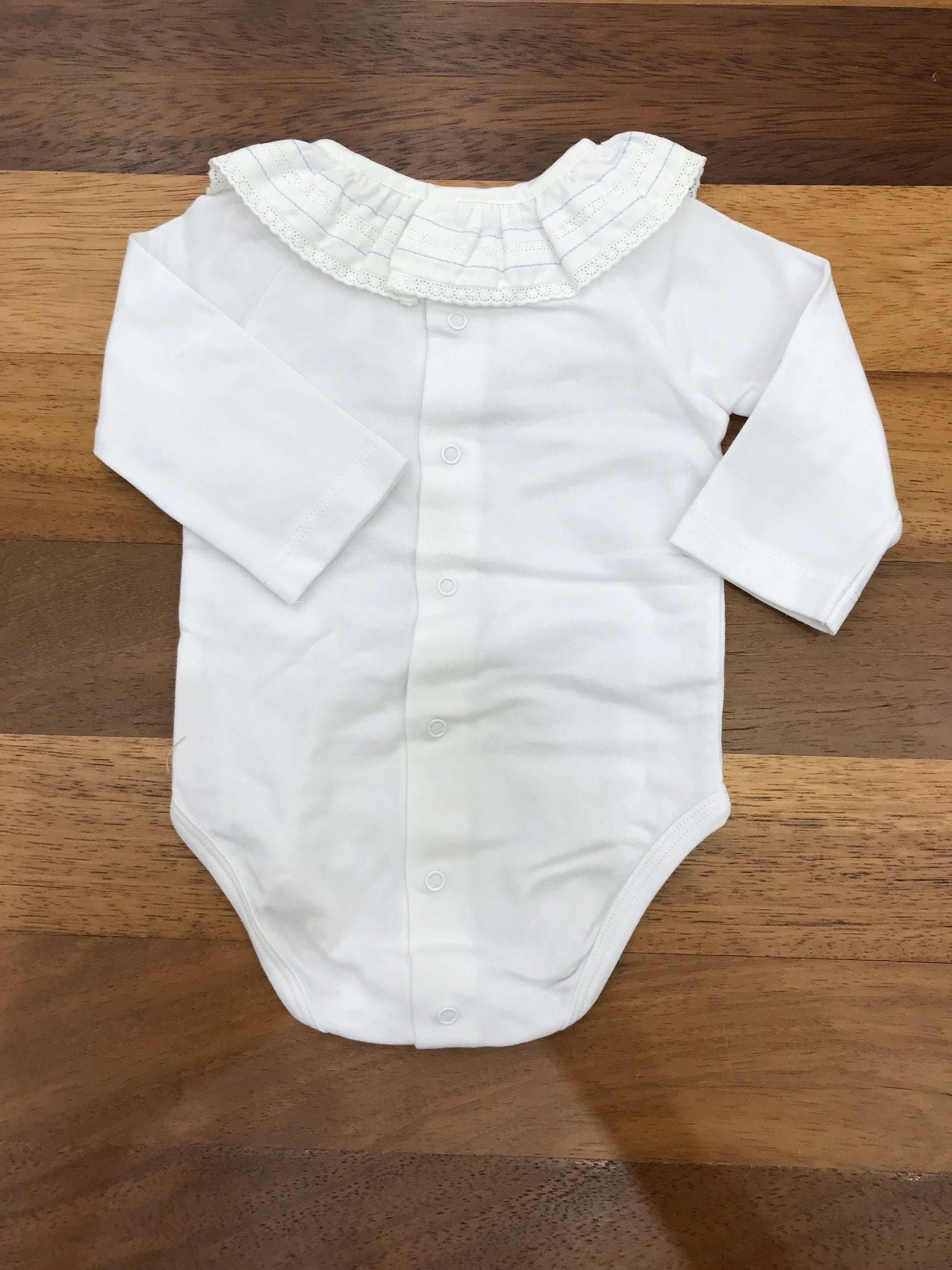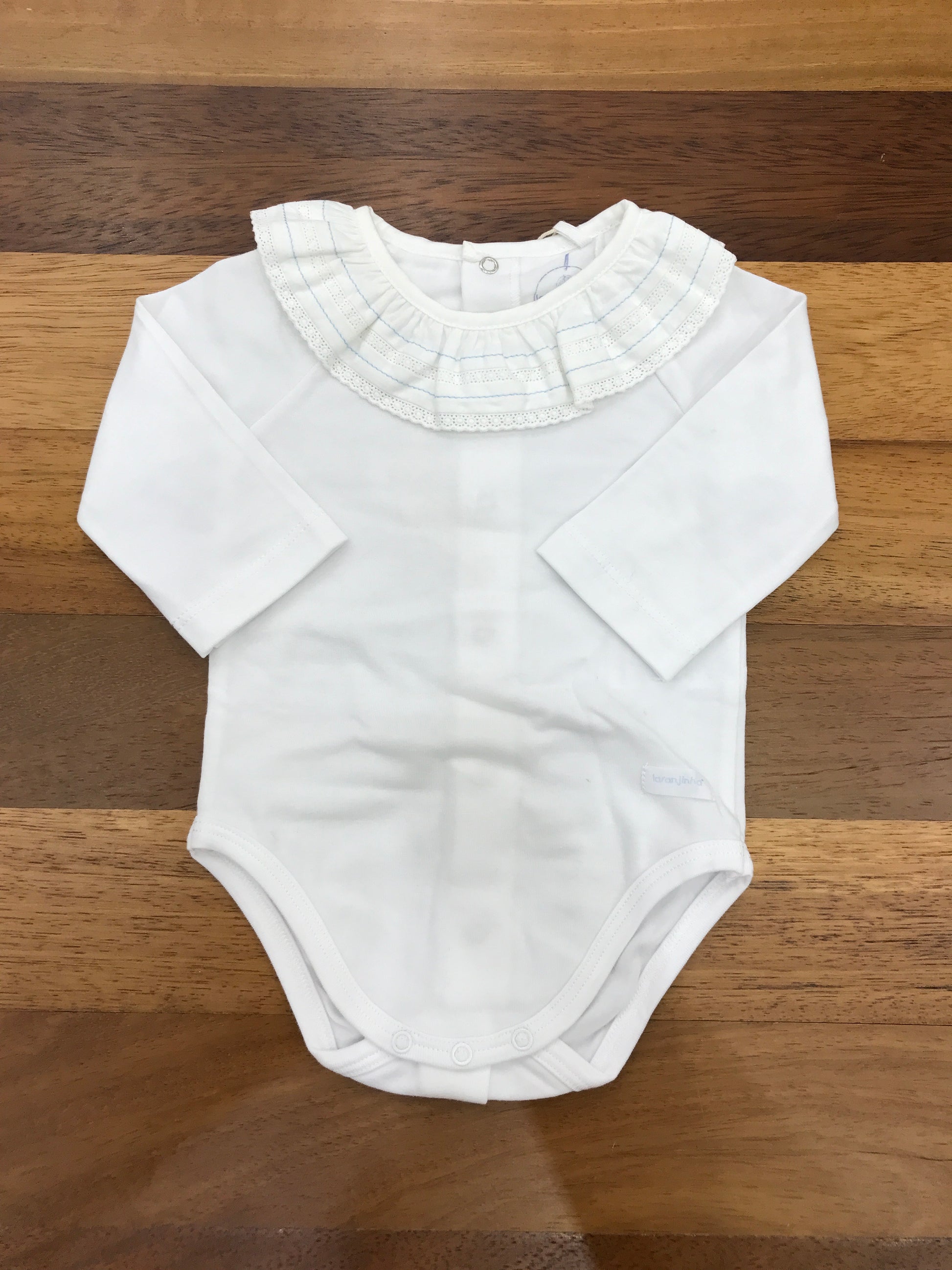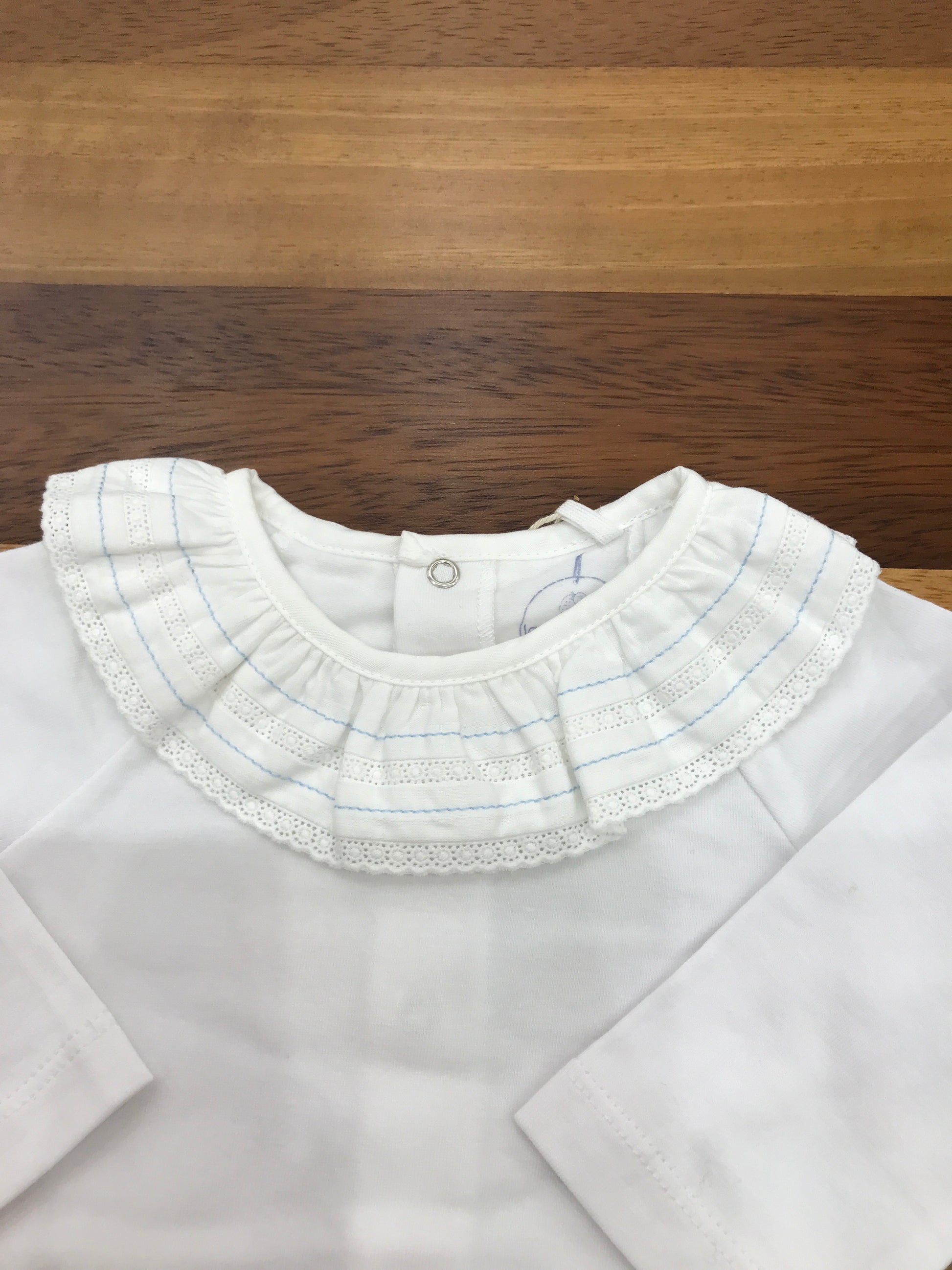 Body in morbido cotone caldo, bianco, a maniche lunghe, con colletto arricciato, ricamo elegante e dettagli celesti raffinati.
