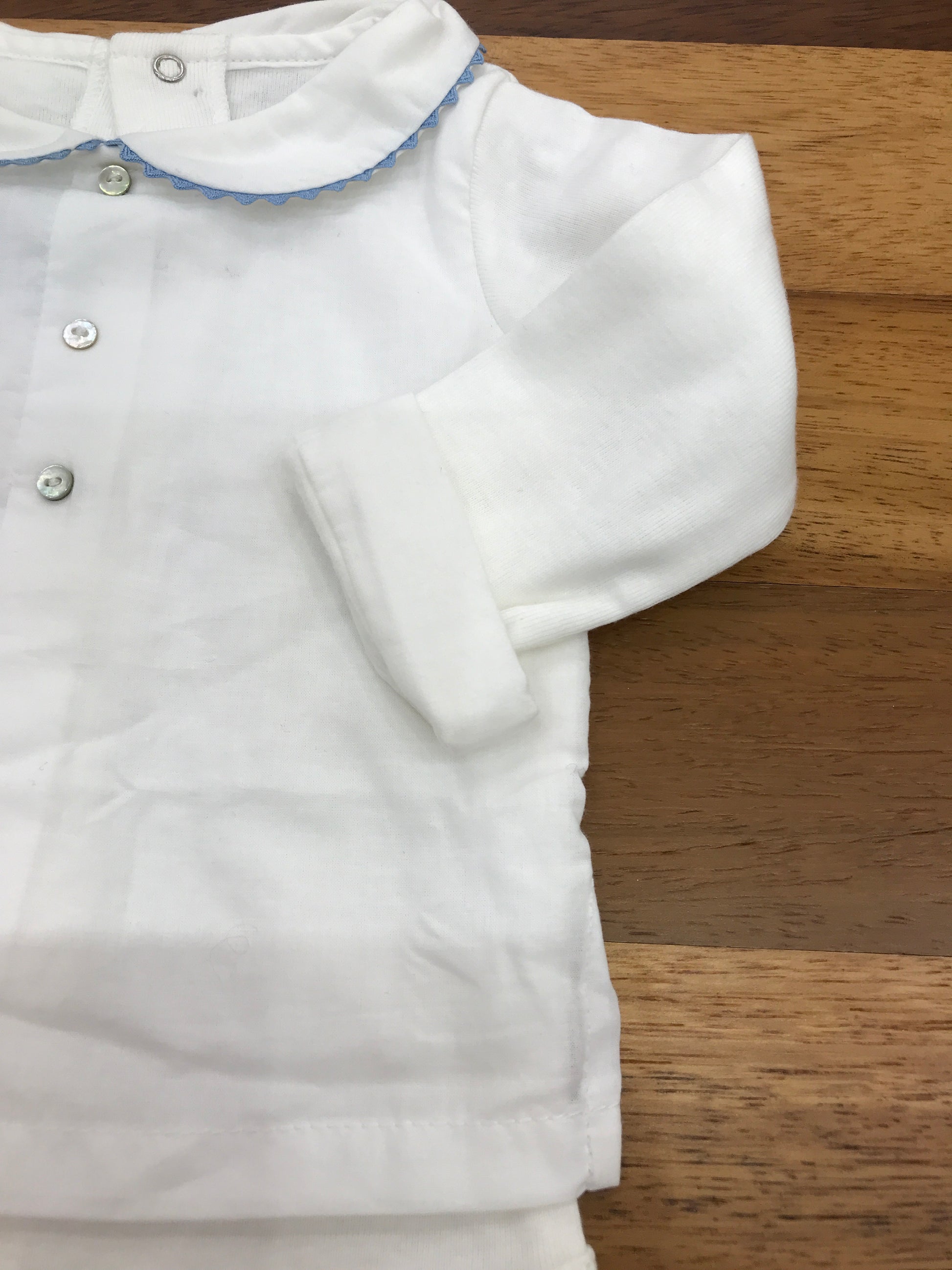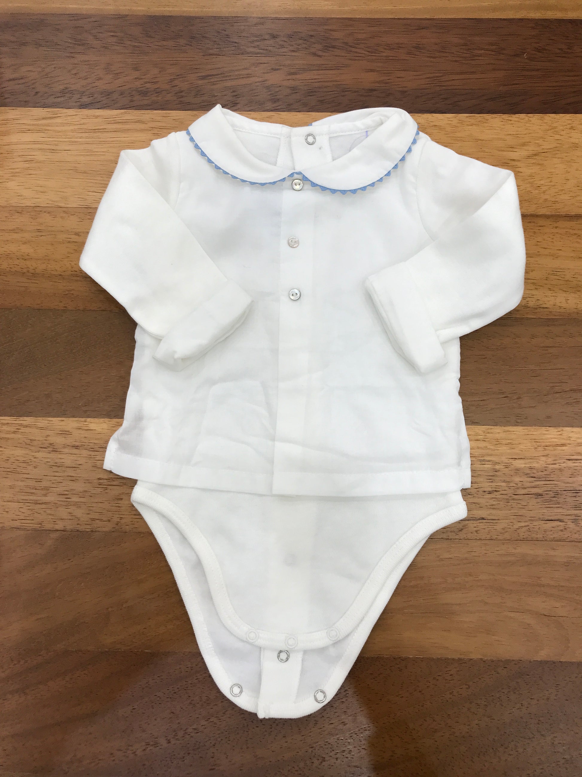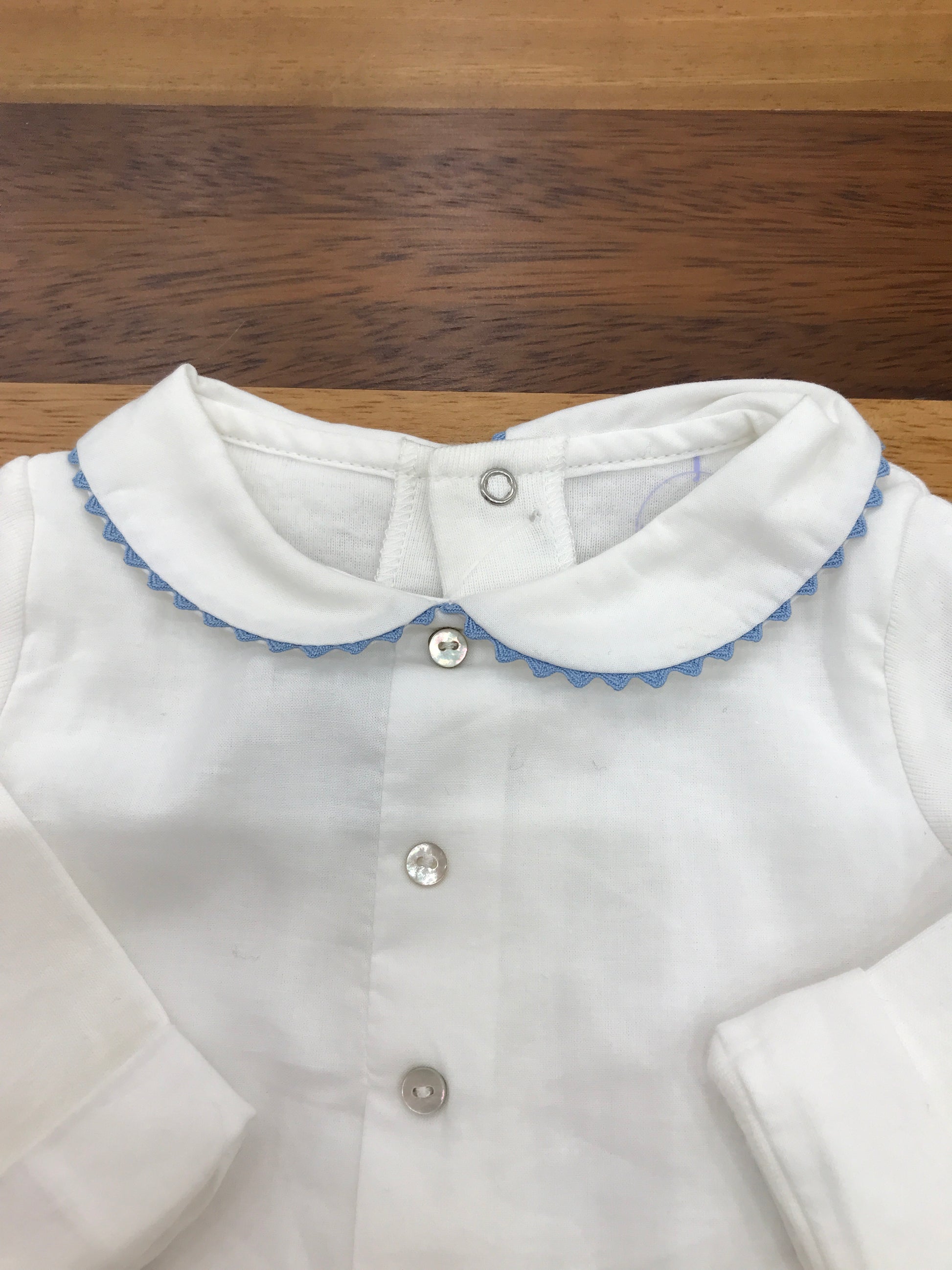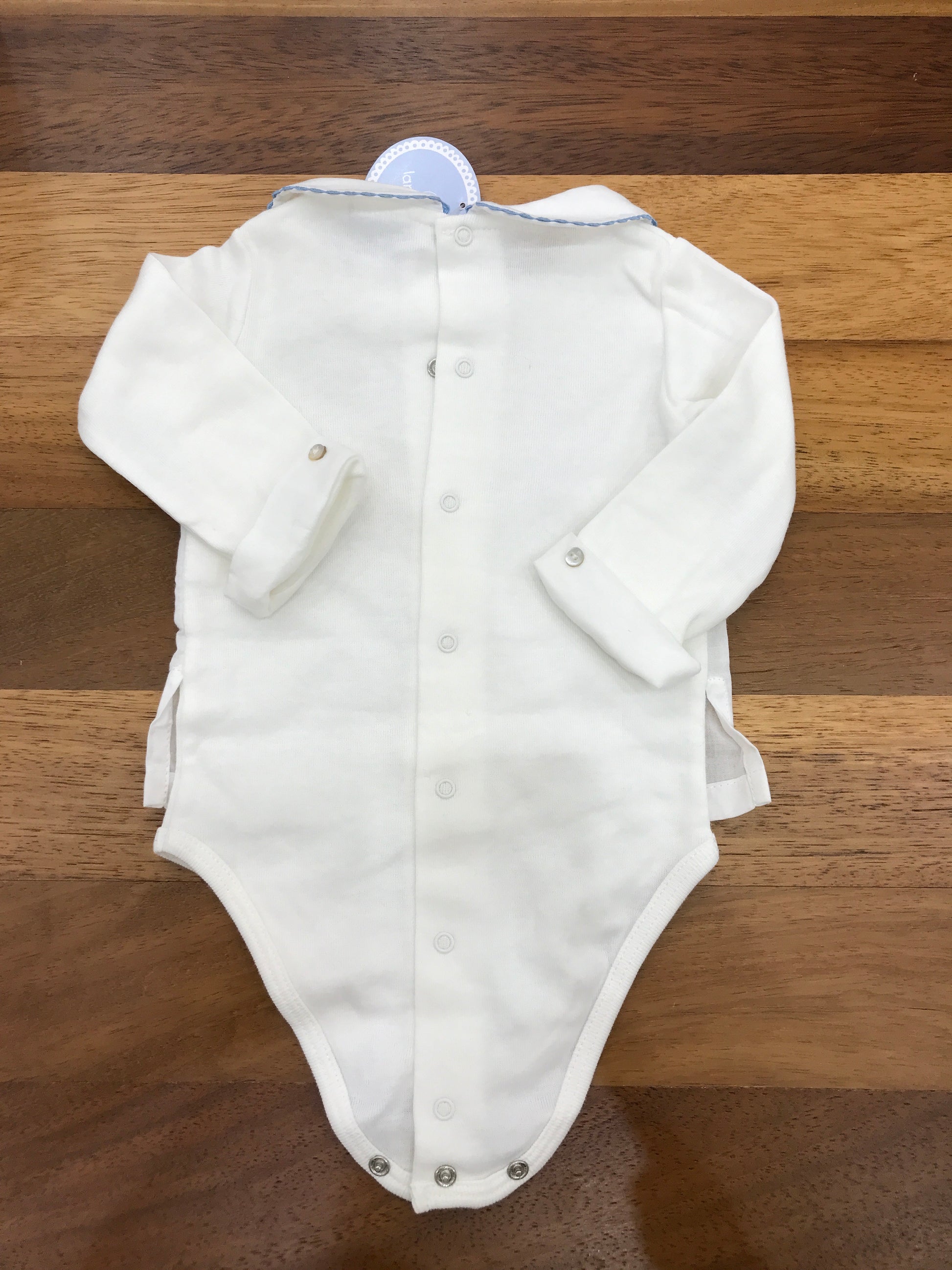Body a maniche lunghe in caldo cotone, con design ispirato a una camicia e colletto decorato da ricami celesti.