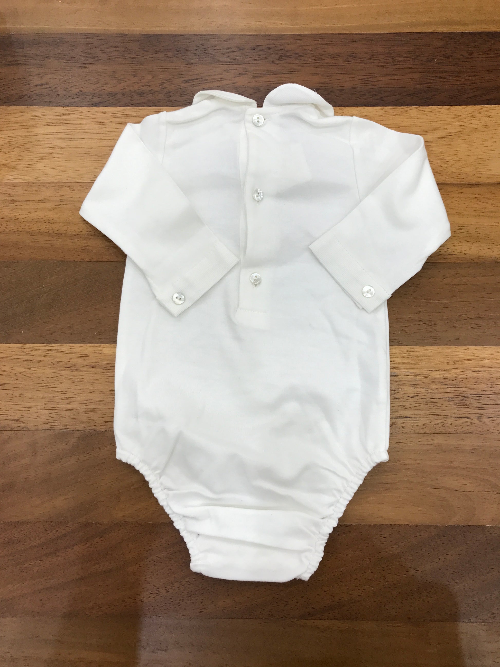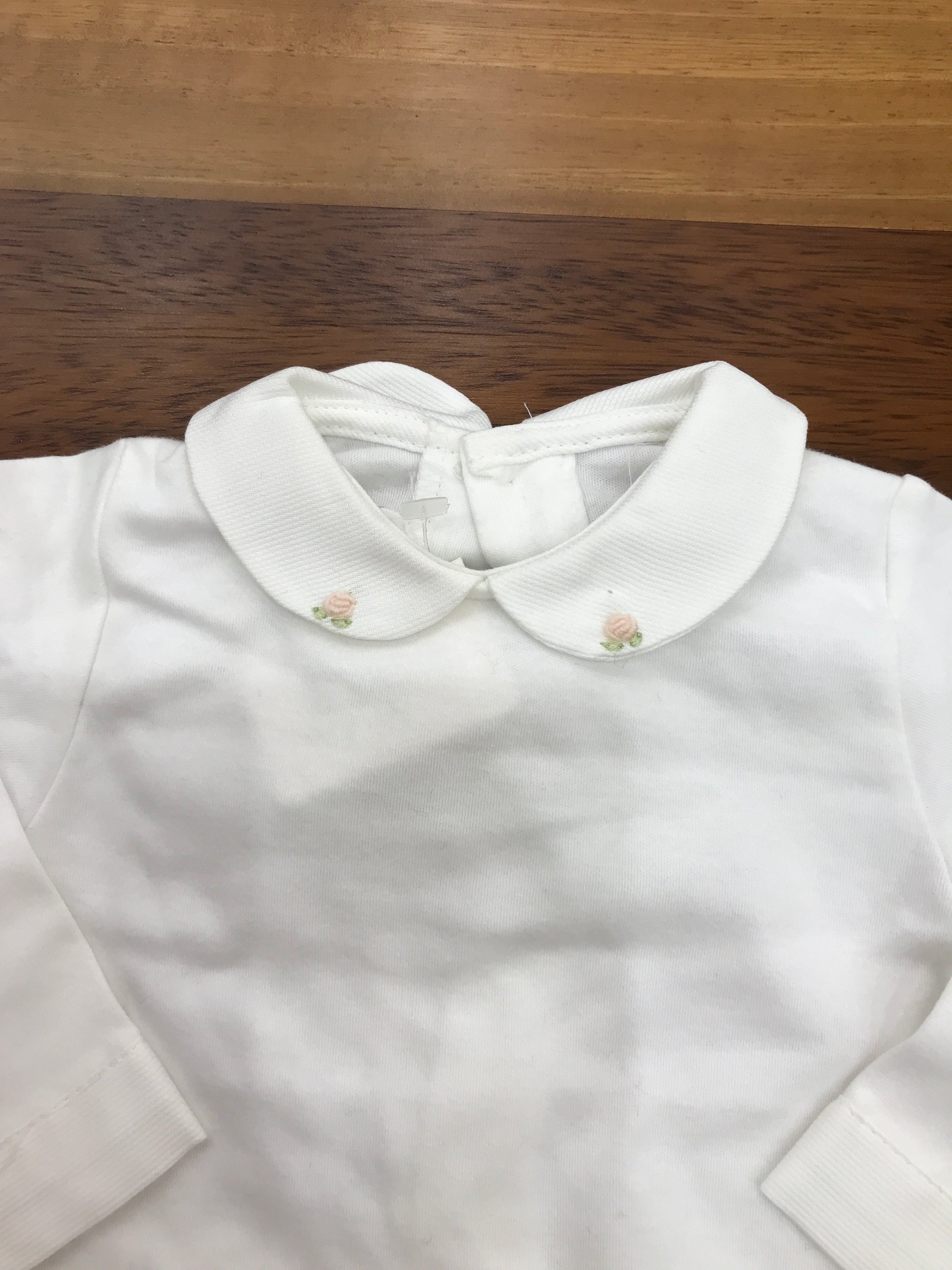 Body in caldo cotone a maniche lunghe, dotato di elastico sulle gambine e colletto con delicate roselline ricamate in rosa.