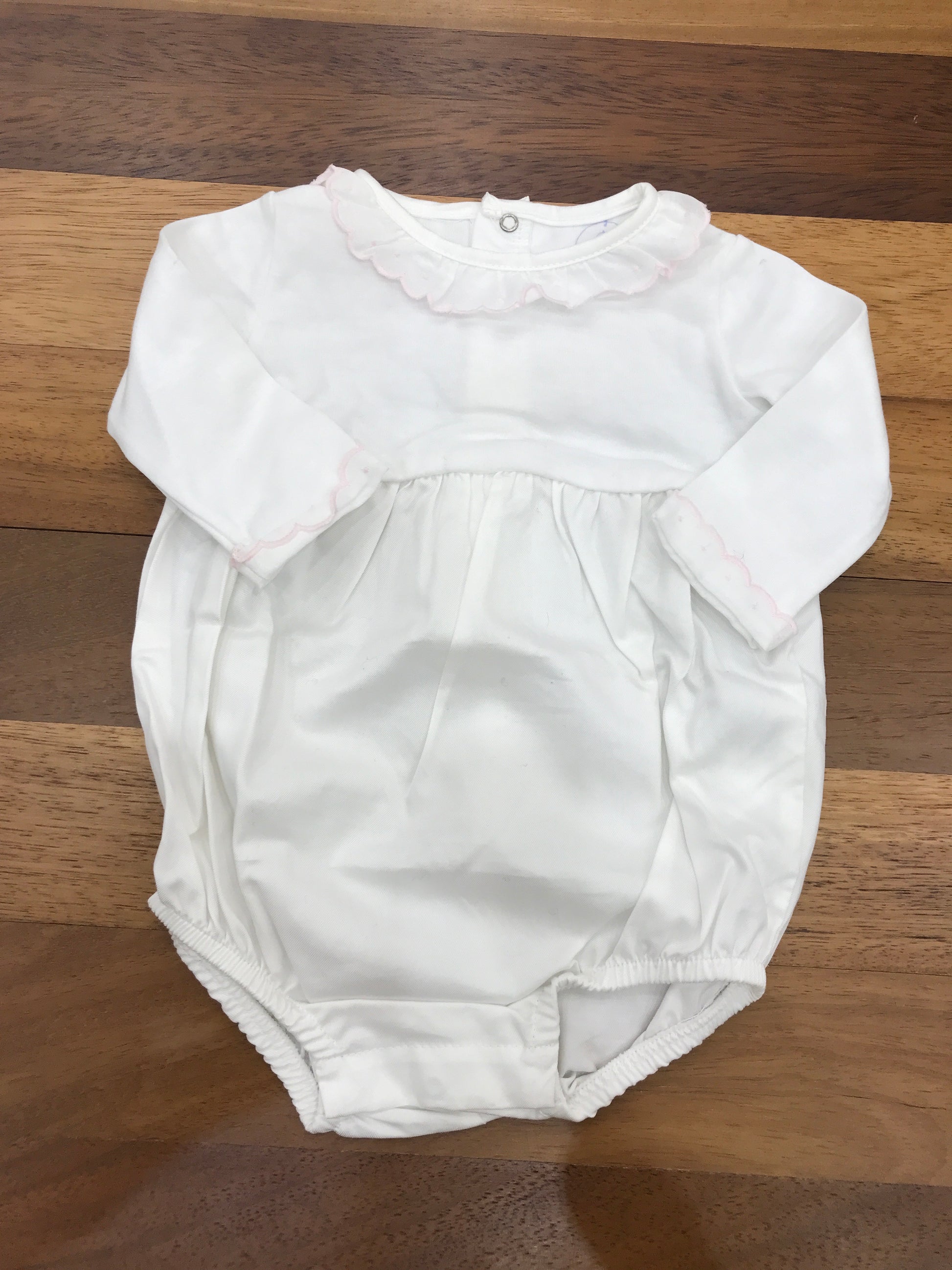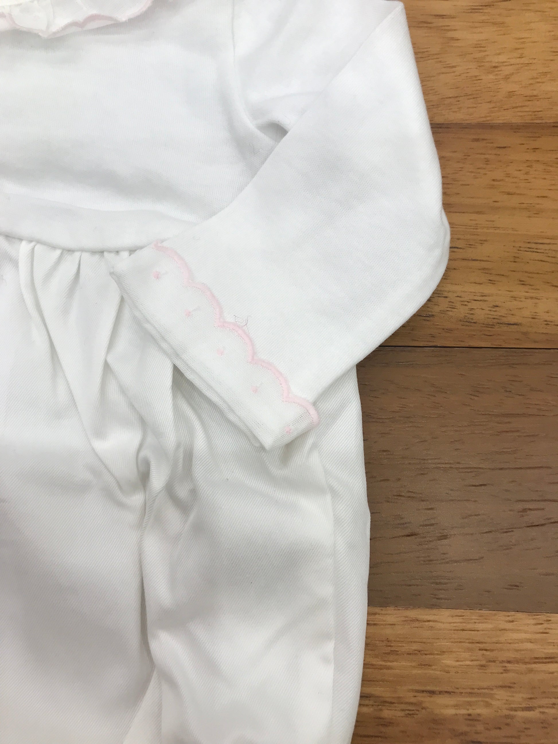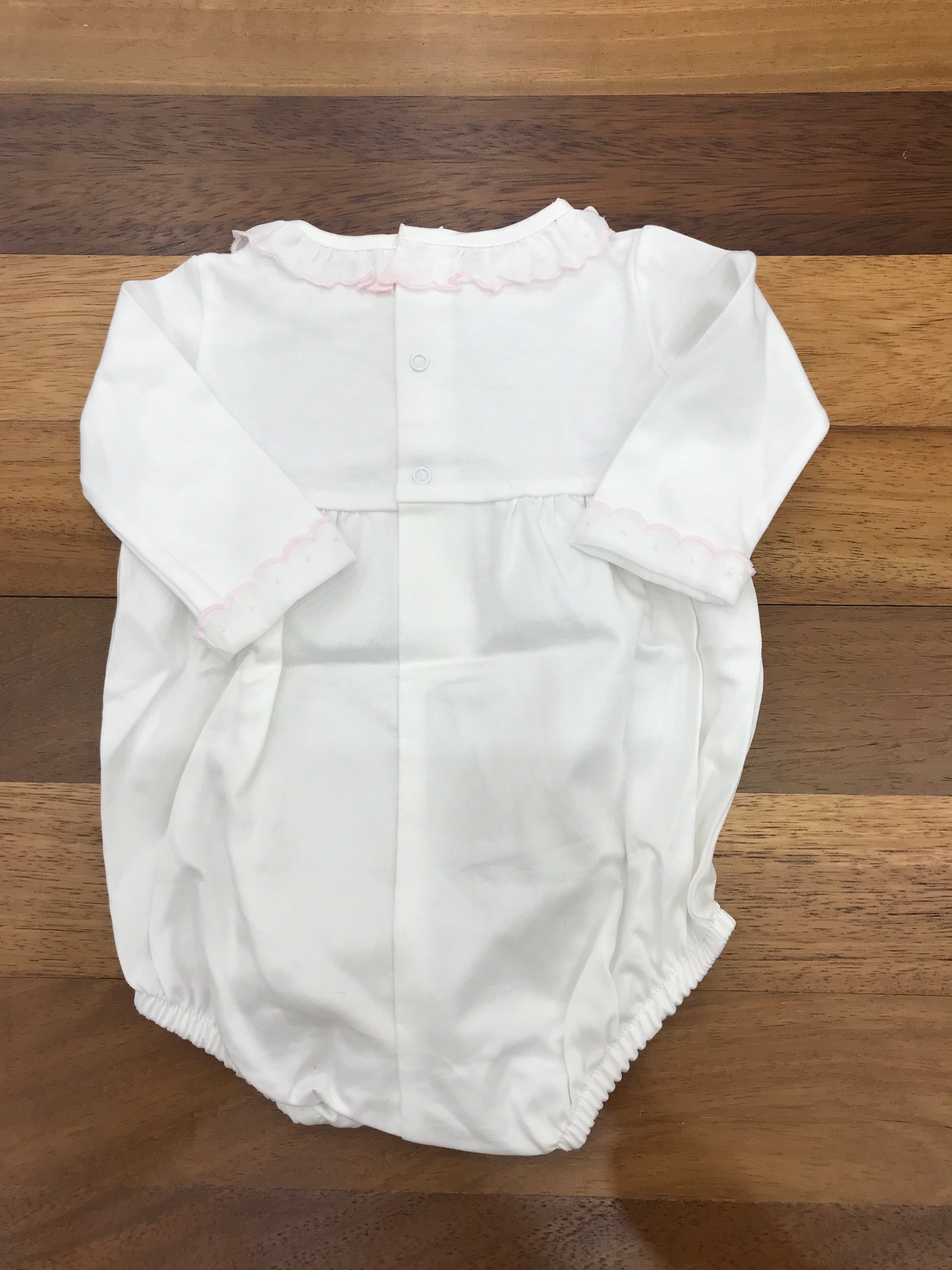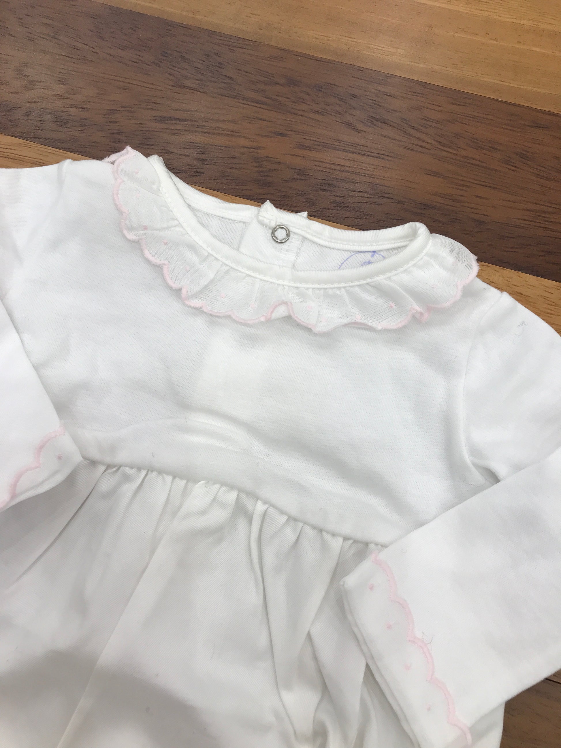 Realizzato in caldo cotone bianco, questo body presenta una leggera effetto sbuffo e dettagli ricamati in rosa sulle maniche e sul colletto, unendo comfort e raffinatezza in un capo esclusivo.