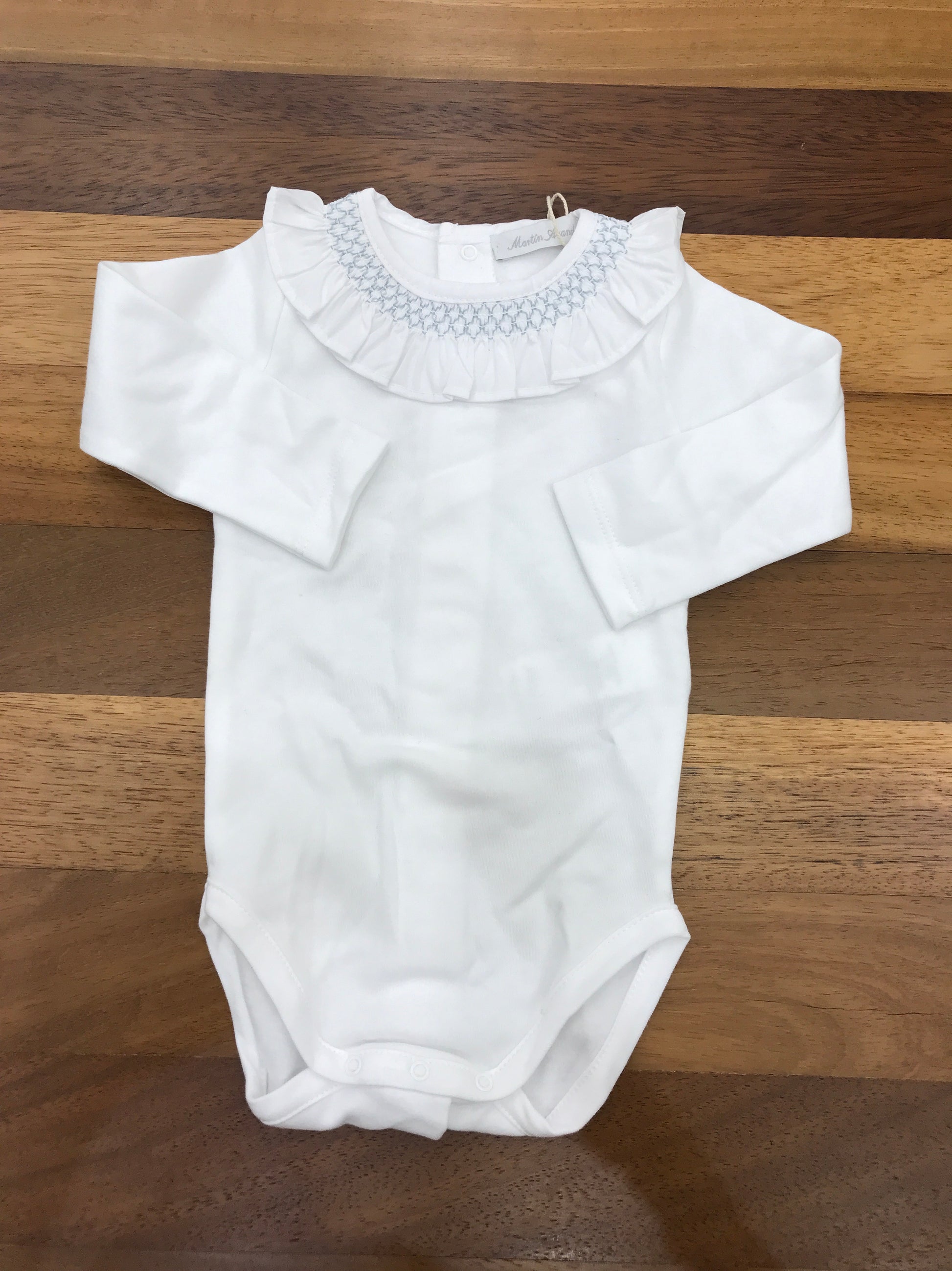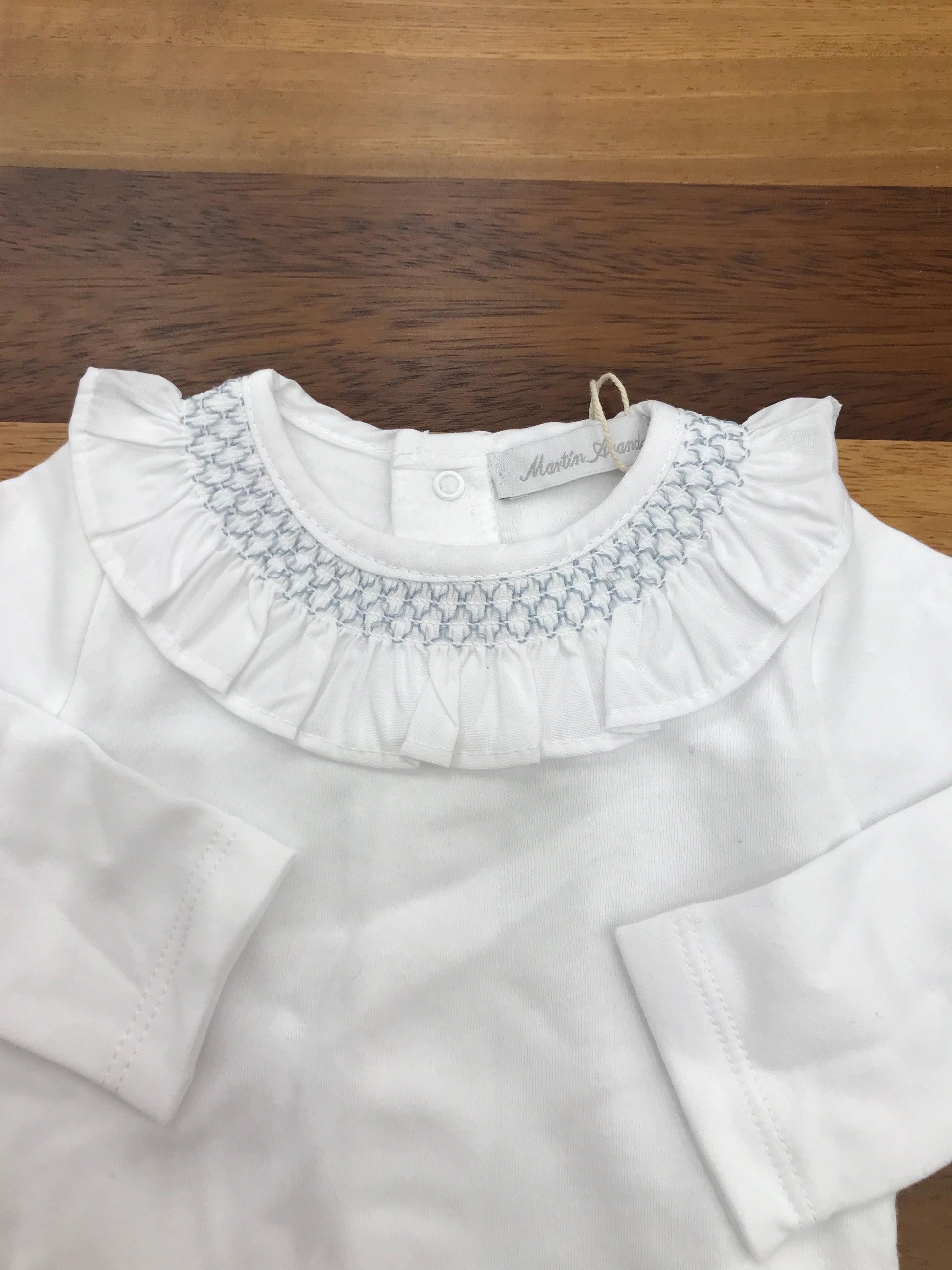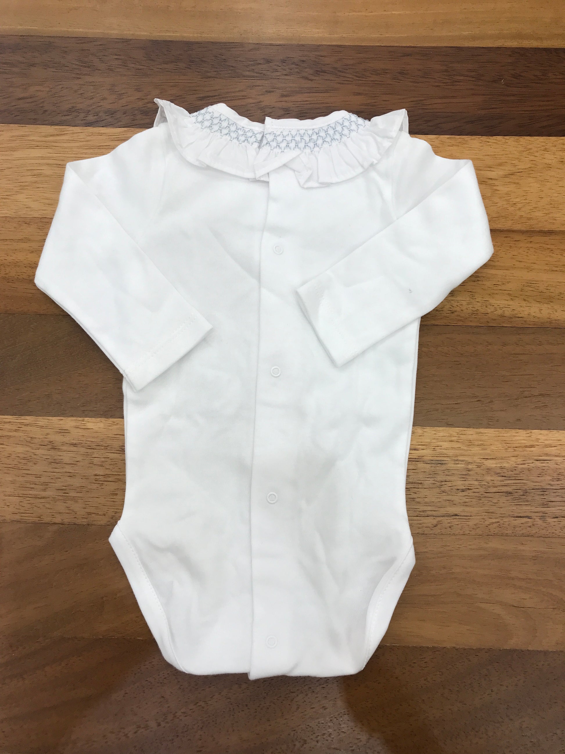 Body realizzato in caldo cotone, a maniche lunghe, con colletto arricciato a volant e dettagli in smock ricamato di colore celeste.