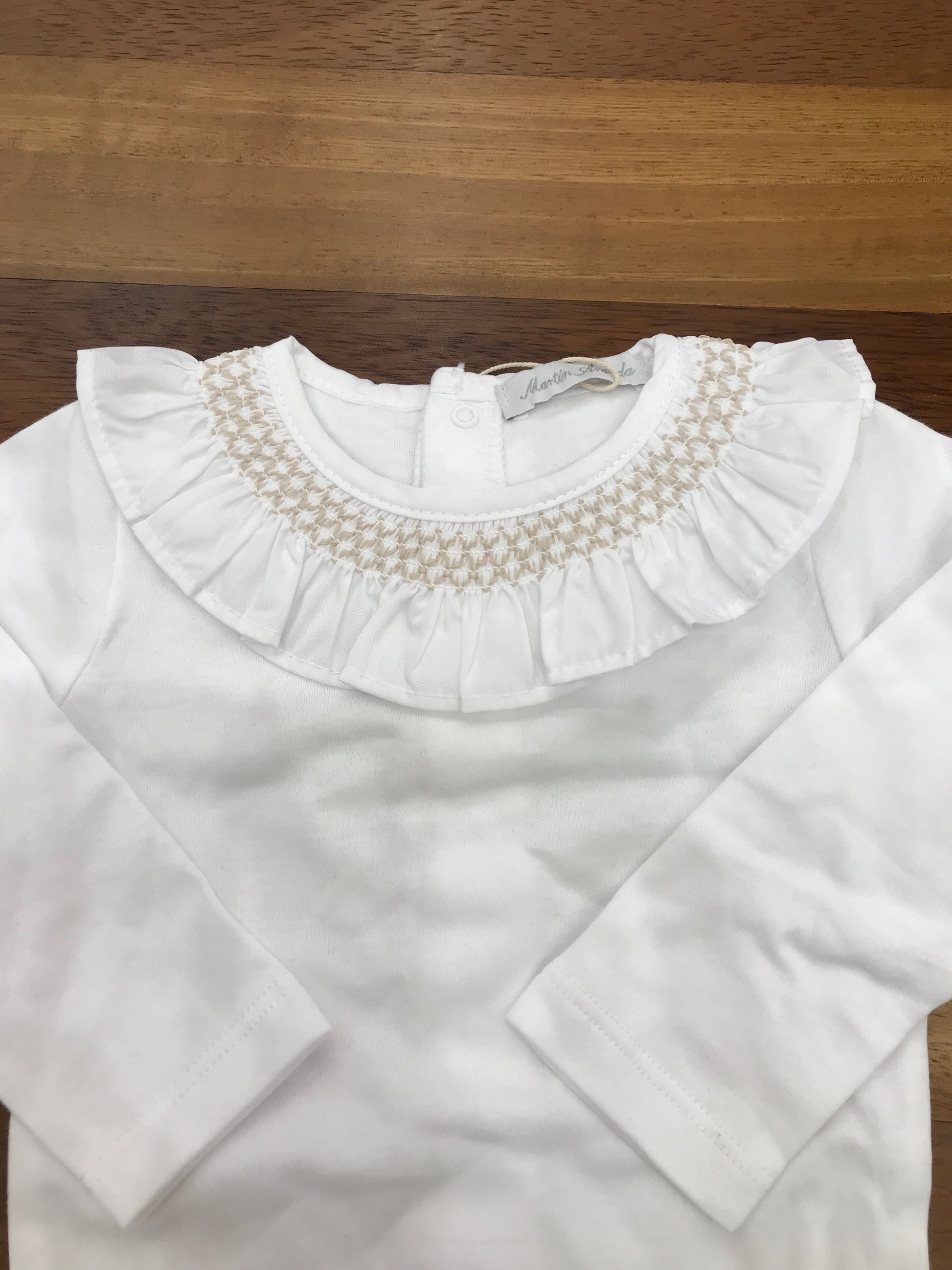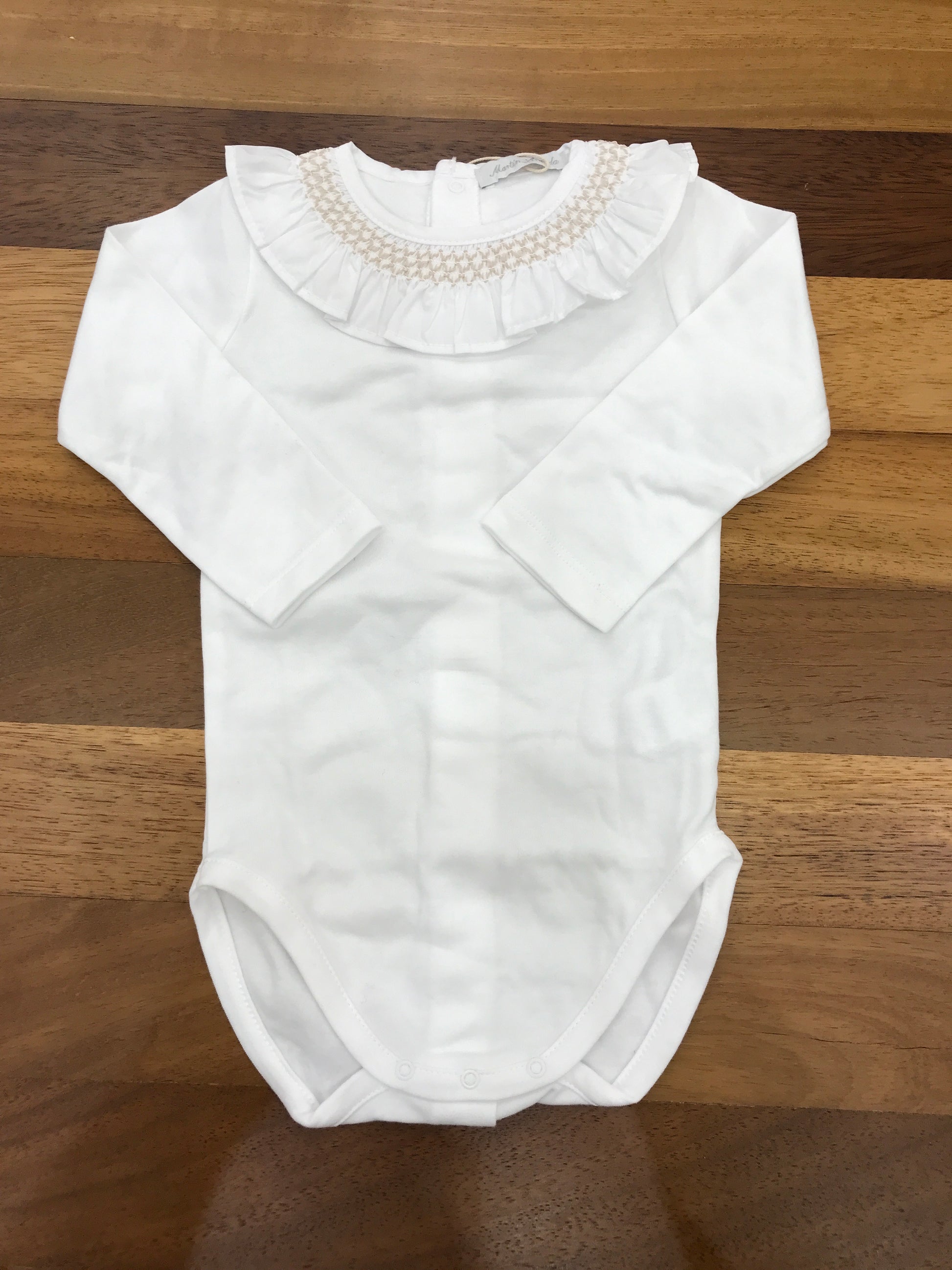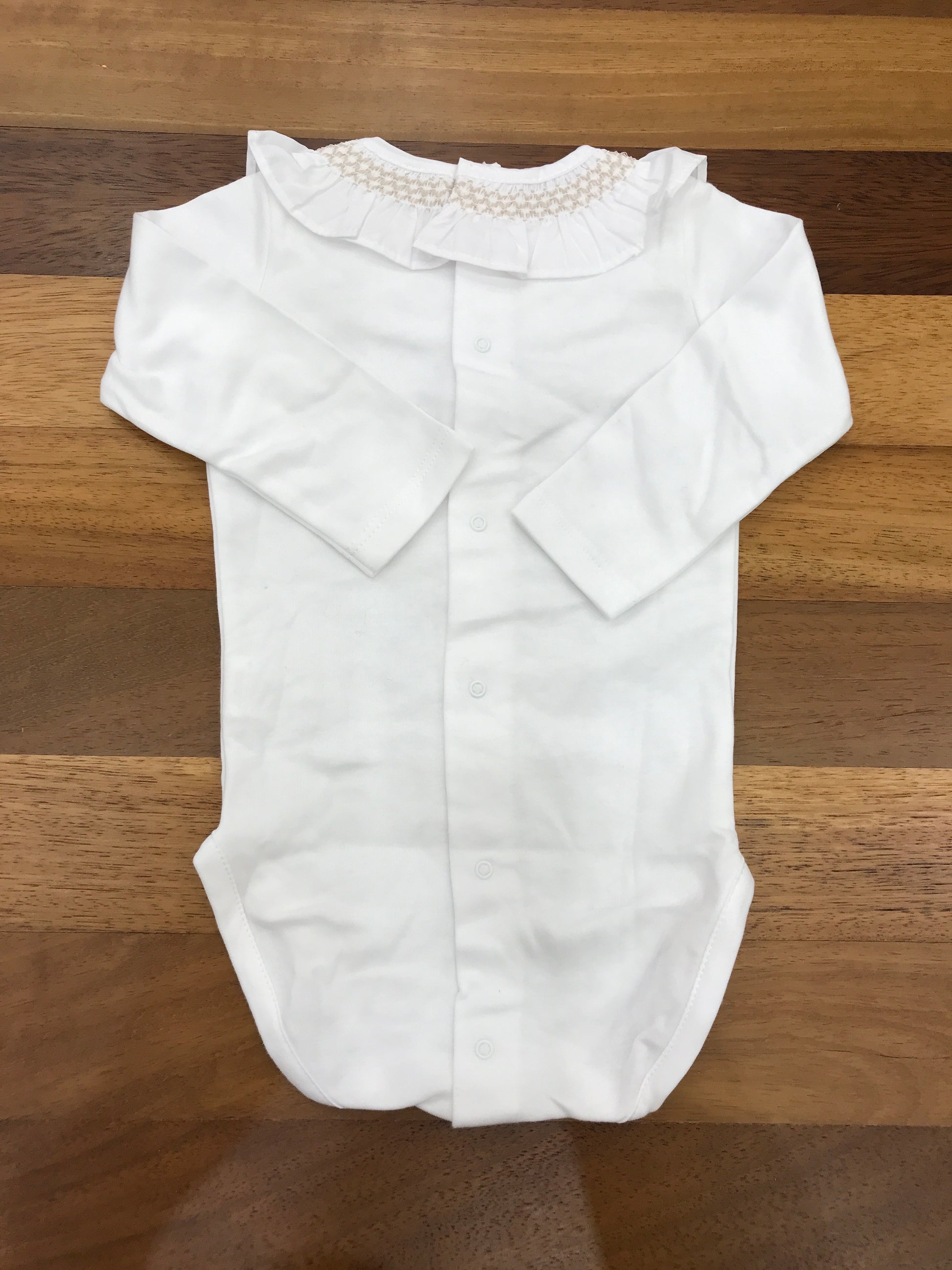 Body realizzato in caldo cotone, a maniche lunghe, con colletto arricciato a volant e dettagli in smock ricamato di colore beige.