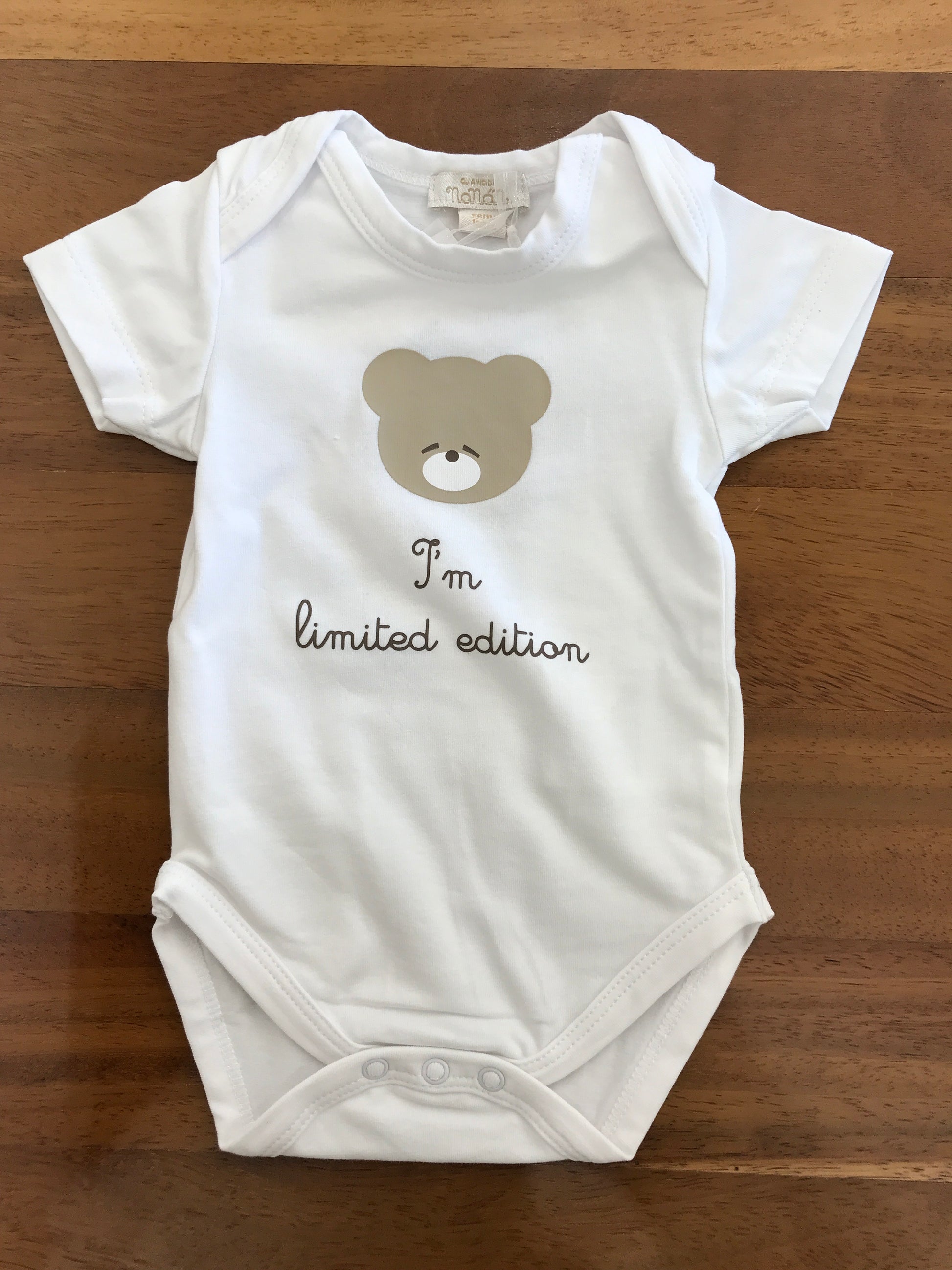 Adorabile body bianco impreziosito da dolce orsetto, con tenera scritta "i'm limited edition ". Abbottonatura inferiore.