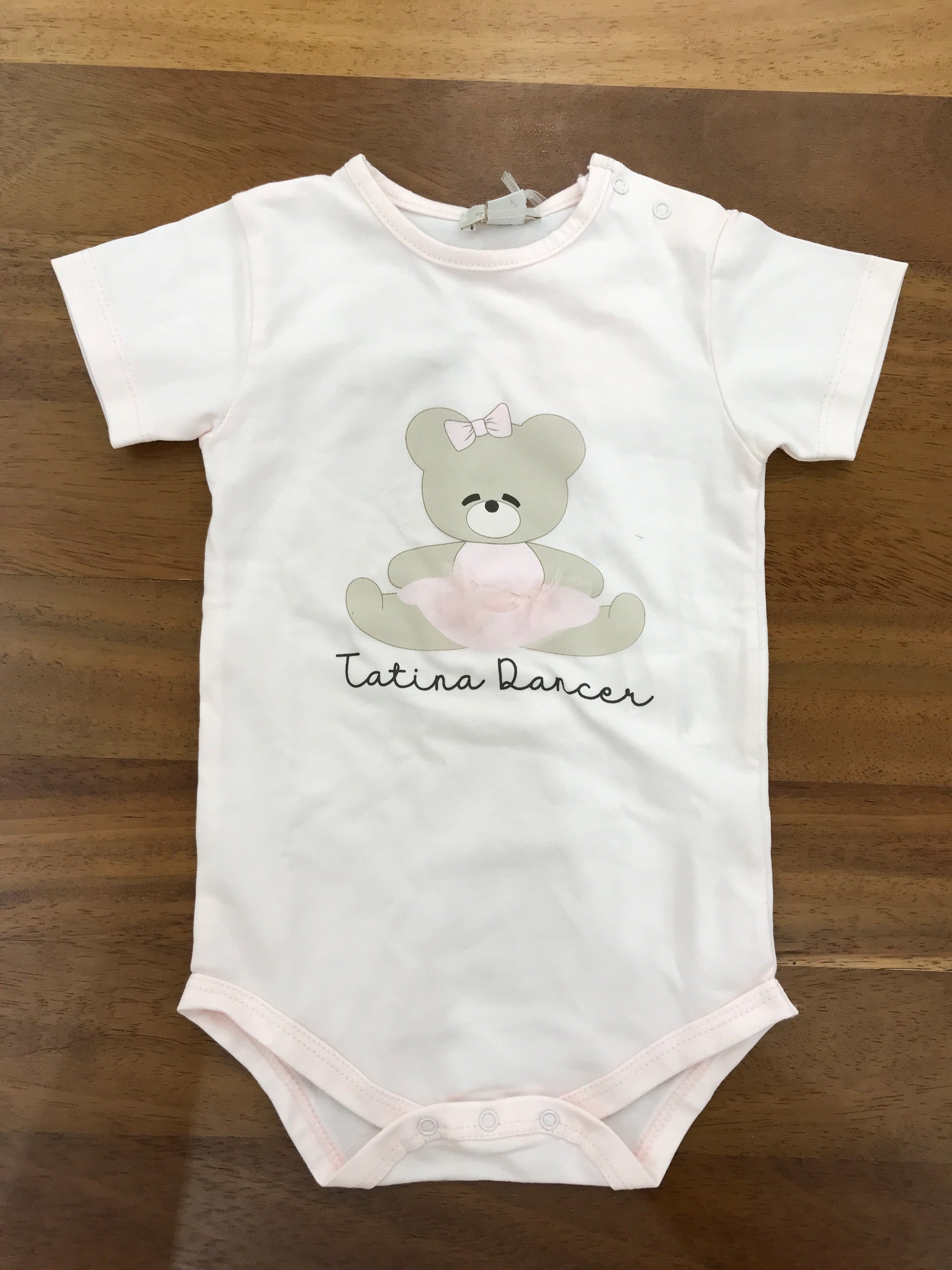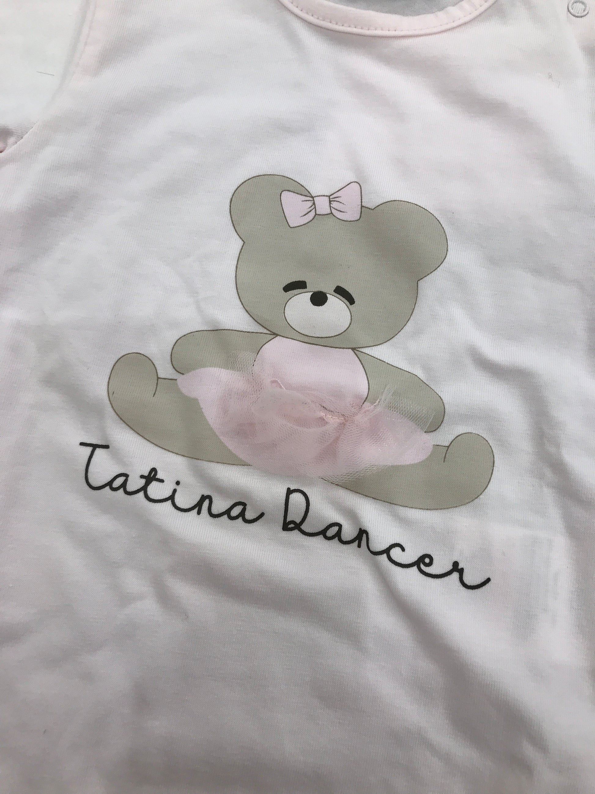 Realizzato in caldo cotone rosa, questo body si distingue per la delicata scritta "tatina dancer" sul davanti. Il design è arricchito da un dettaglio dolce e femminile: un orsetto con gonnellina in tulle che aggiunge un tocco di eleganza e morbidezza, ideale per un look confortevole e raffinato.