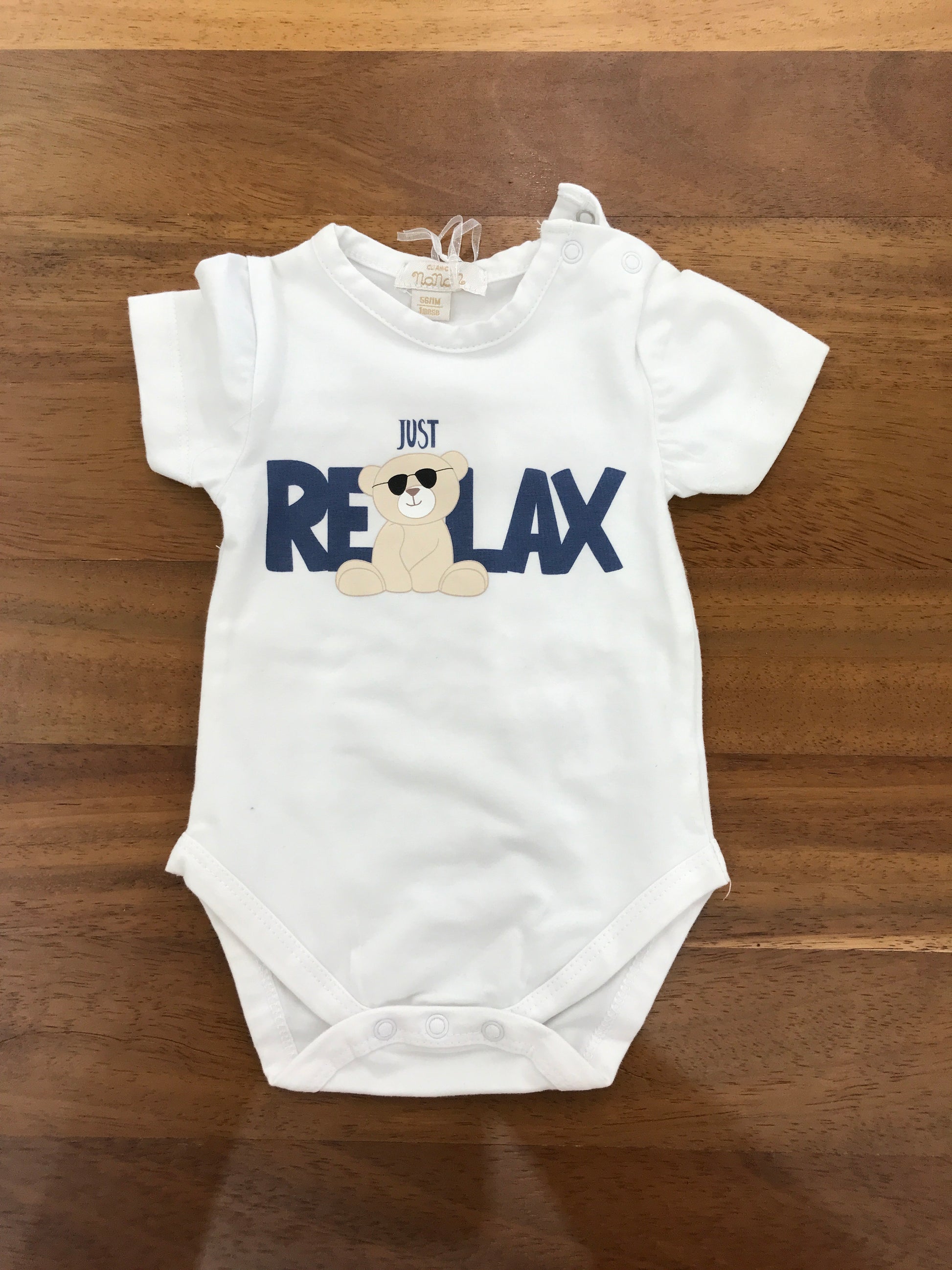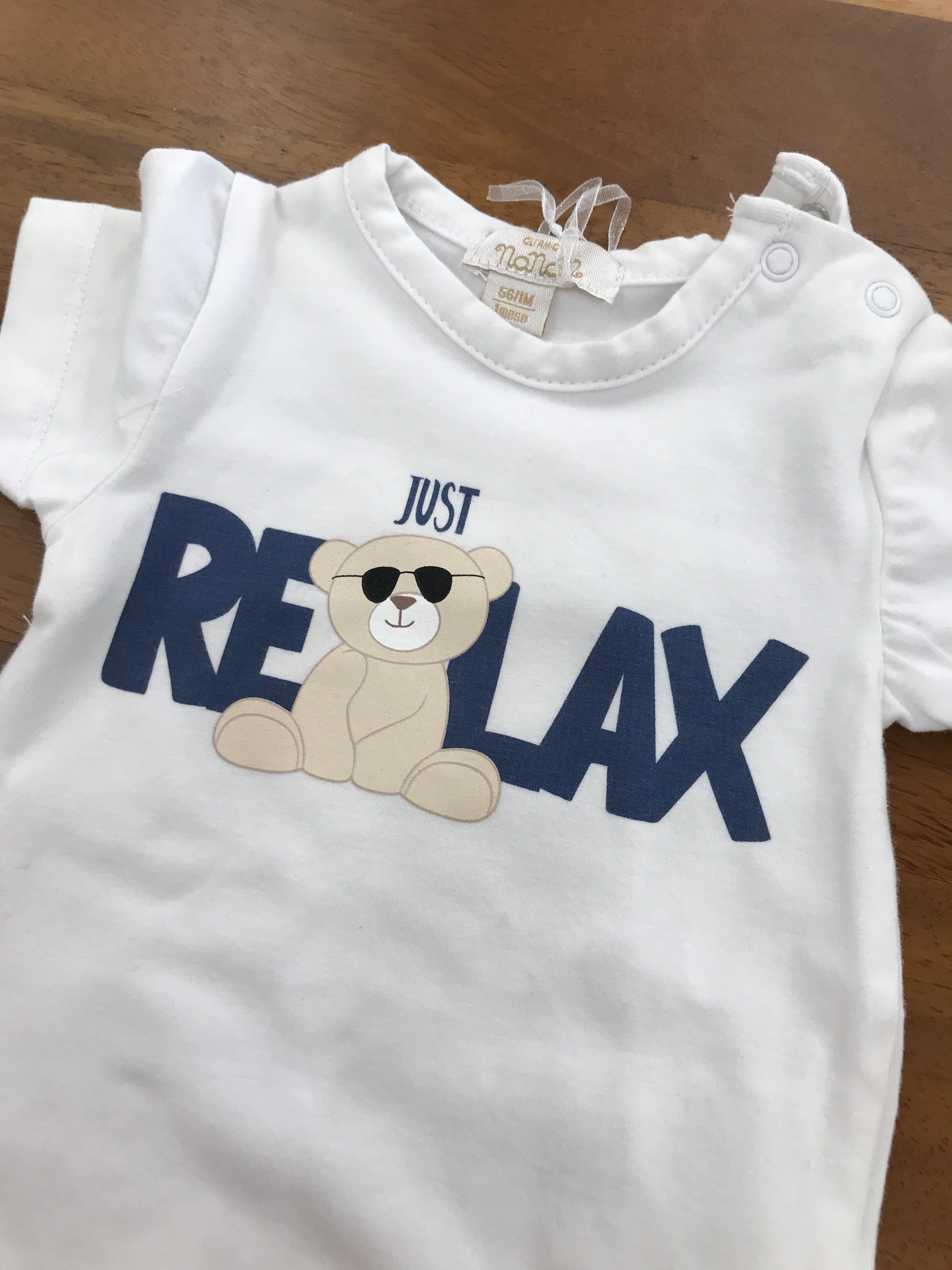 Body intimo di tonalità bianco, impreziosito dalla scritta "just relax" e decorato con l'immagine di un orsetto che indossa occhiali, un dettaglio che aggiunge un tocco di dolcezza e originalità al capo.