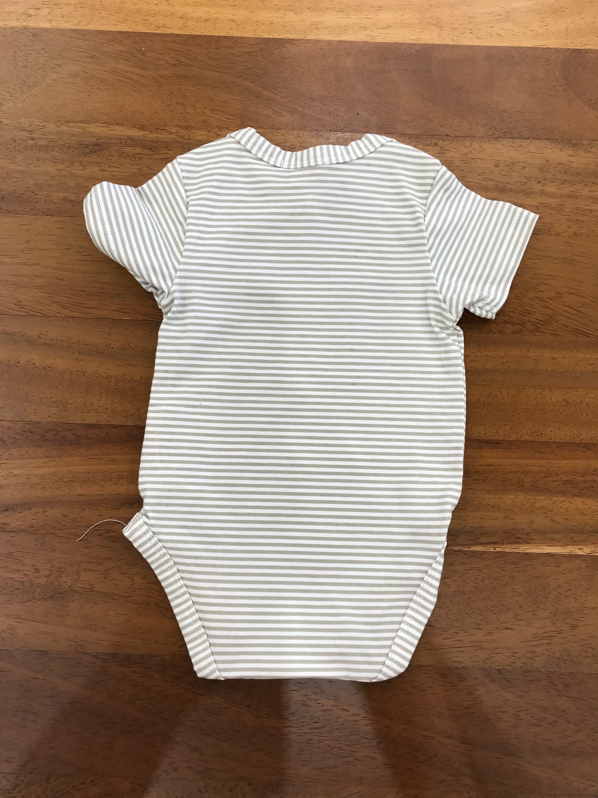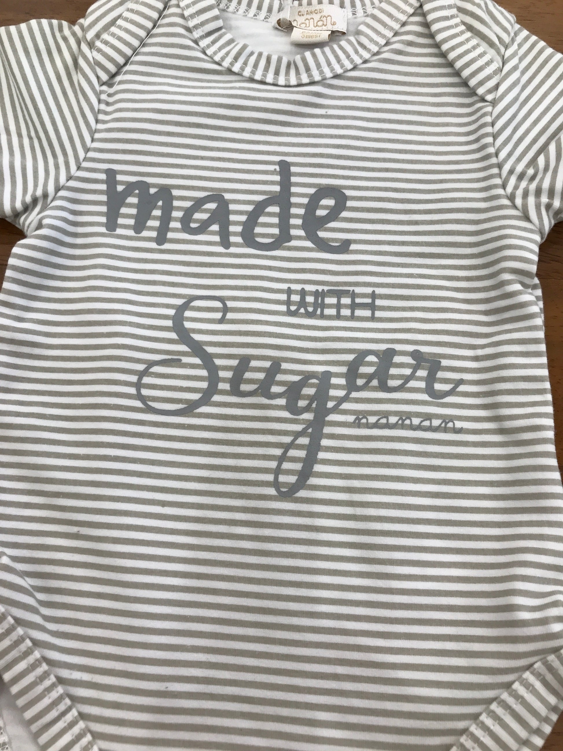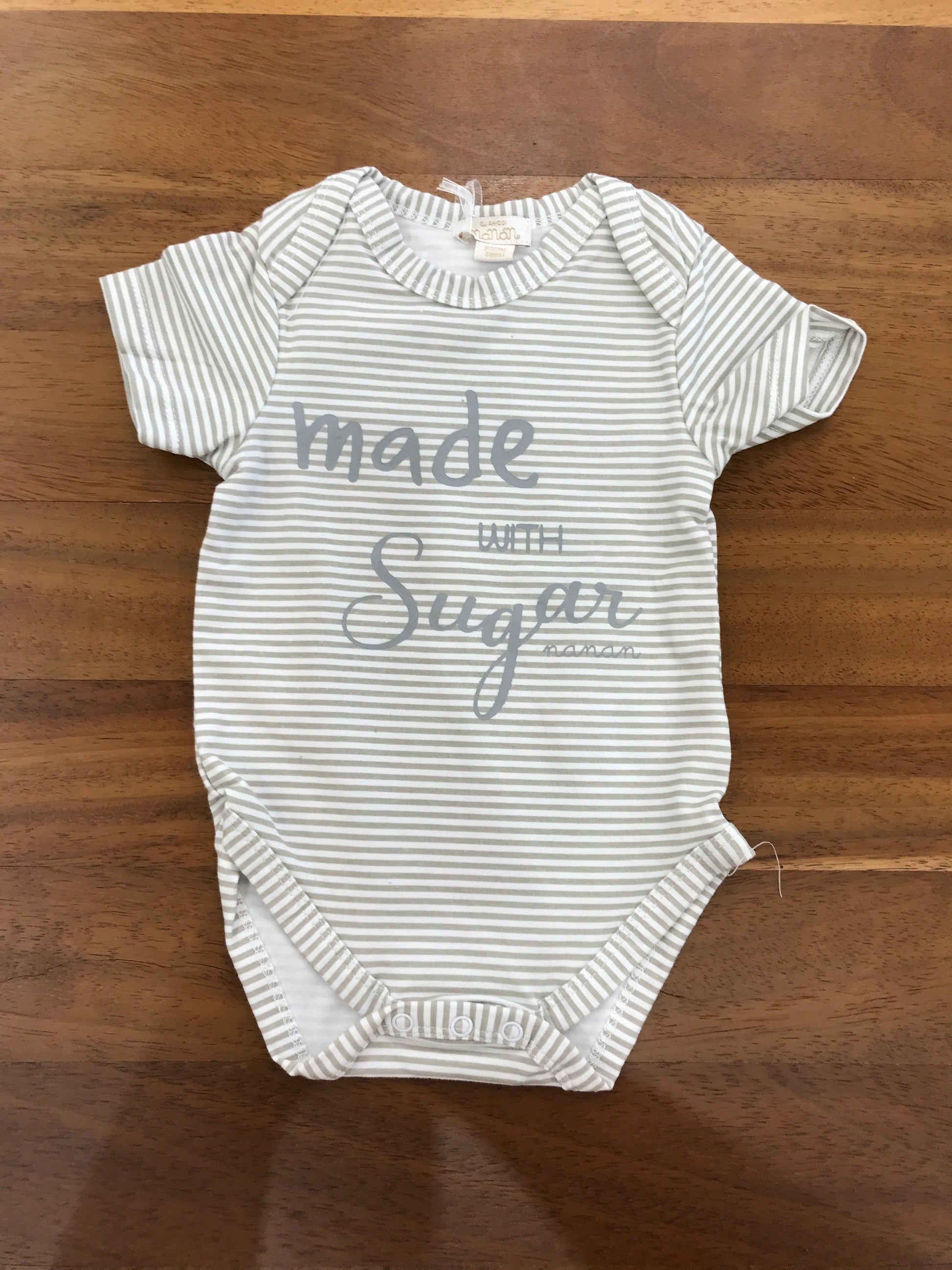 Body intimo realizzato in caldo cotone, con fondo bianco e righe grigie, impreziosito dalla scritta "Made with Sugar". Un capo più lungo per un comfort ottimale e una vestibilità avvolgente.