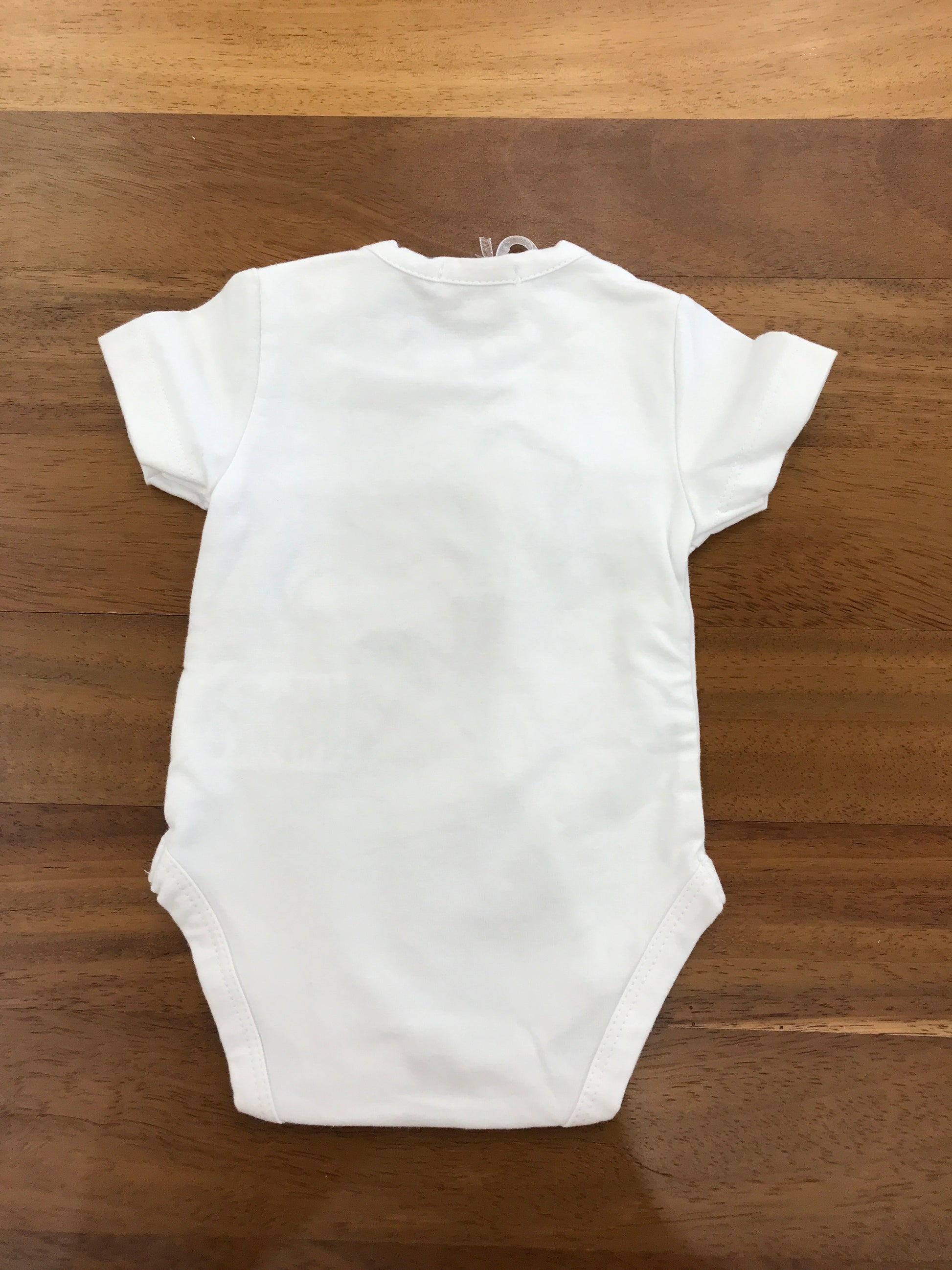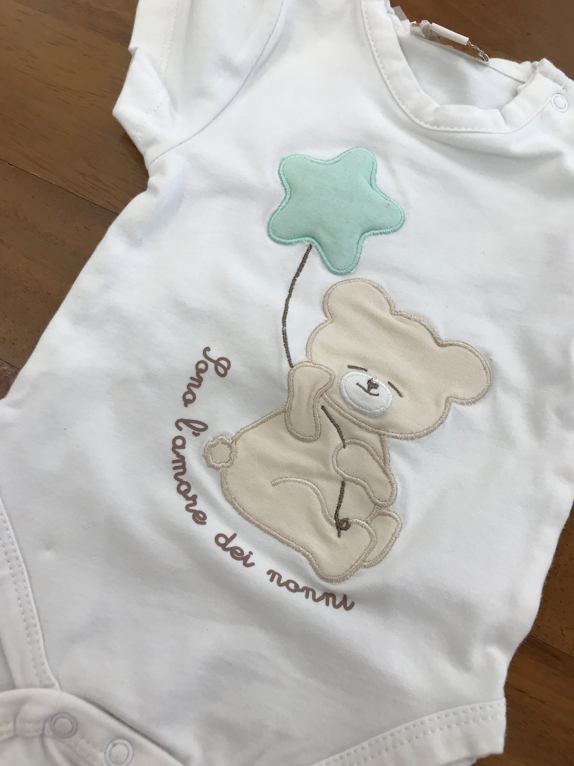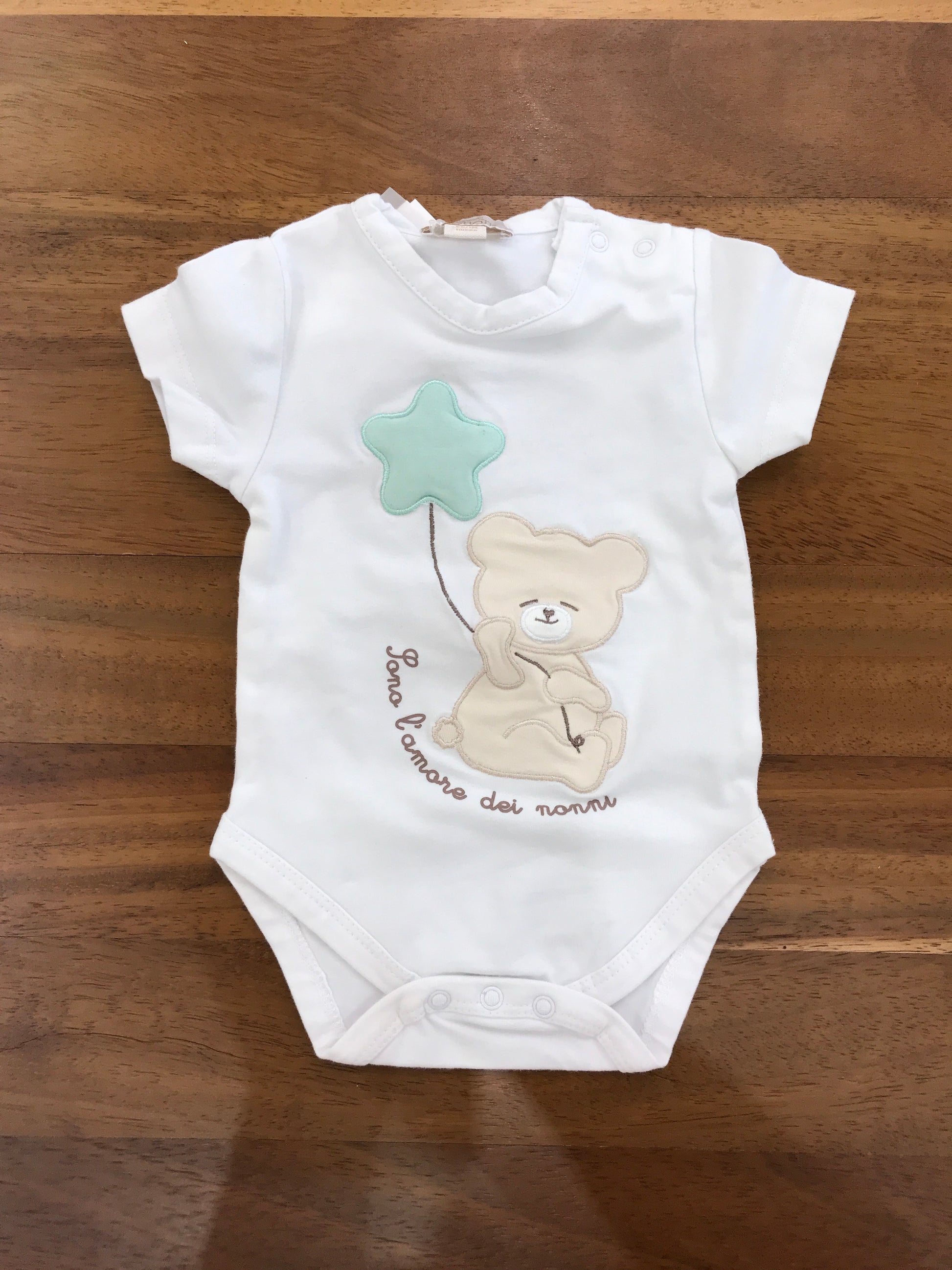 Questo body bianco è caratterizzato dalla presenza di un delicato orsetto stampato sul davanti, il quale tiene un palloncino a forma di stella, conferendo al capo un tocco dolce e giocoso ideale per i più piccoli. Realizzato con materiali di alta qualità, unisce comfort e stile in un unico indumento.