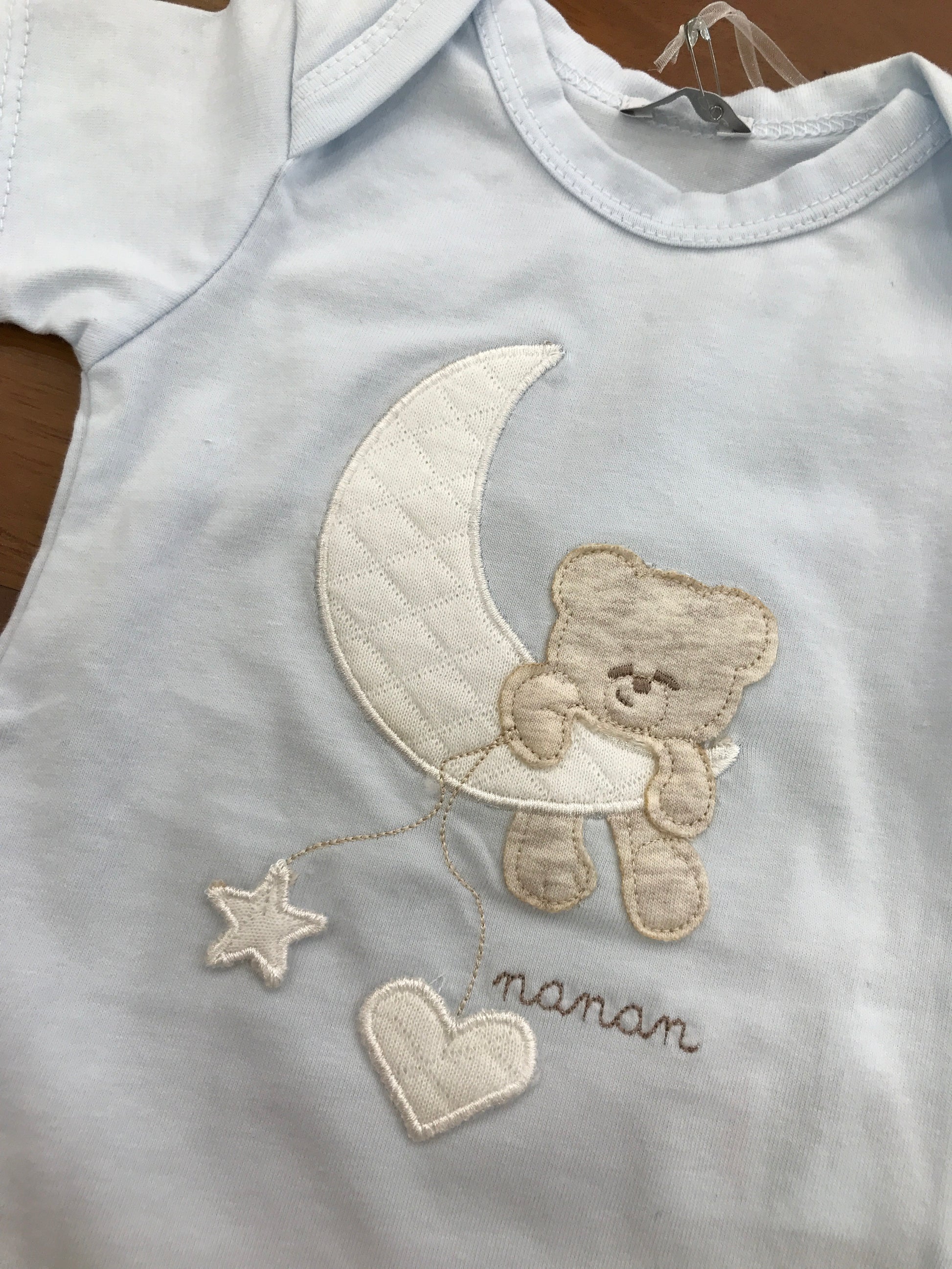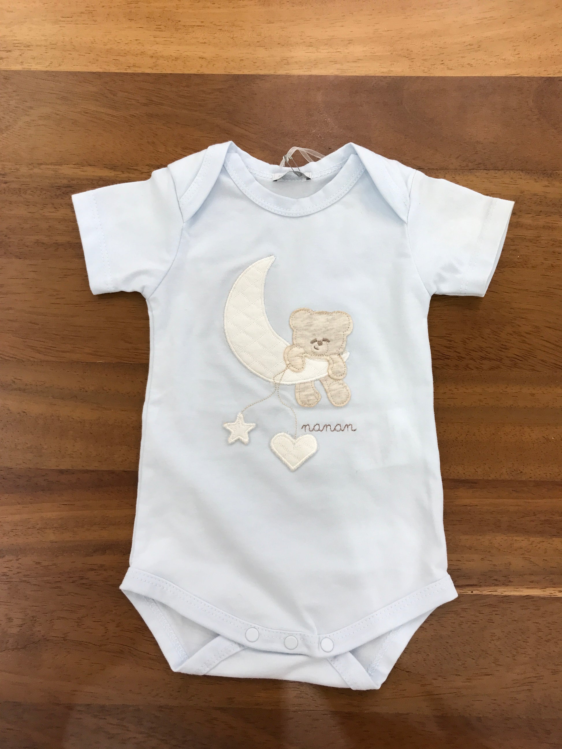 Body intimo in una delicata tonalità celeste, arricchito da un design in rilievo che raffigura un orsetto con la luna, per un tocco di dolcezza e comfort unico.