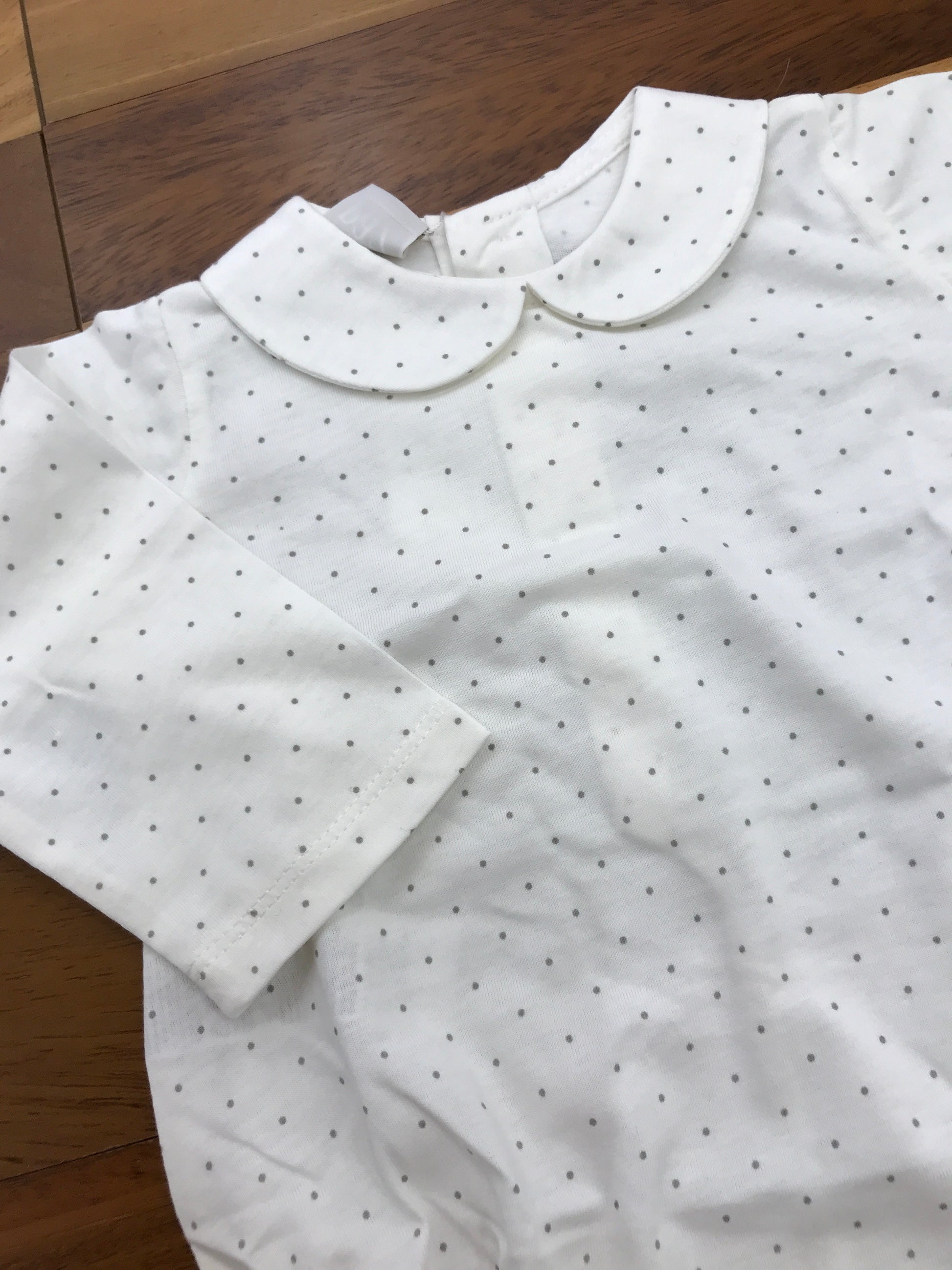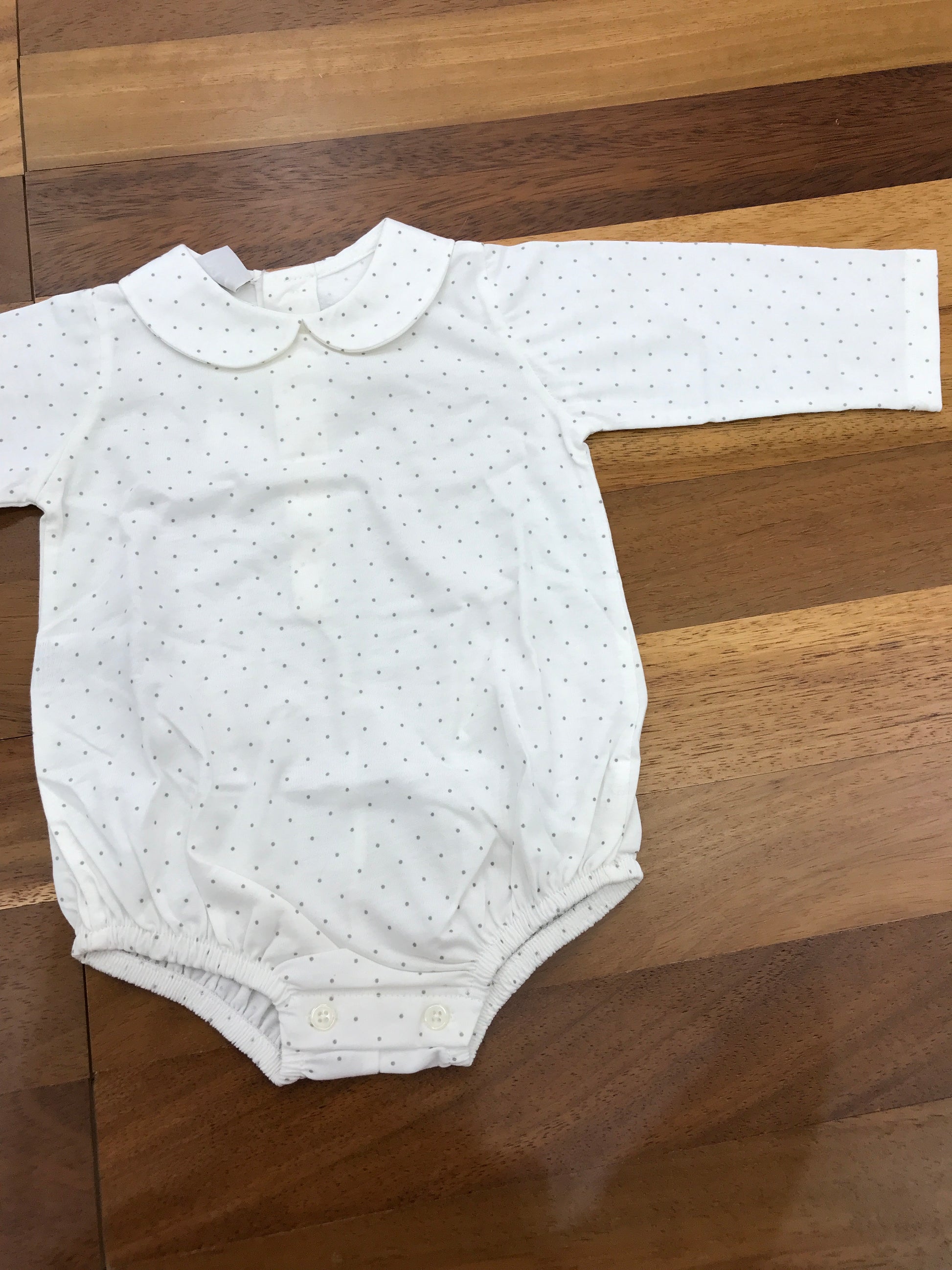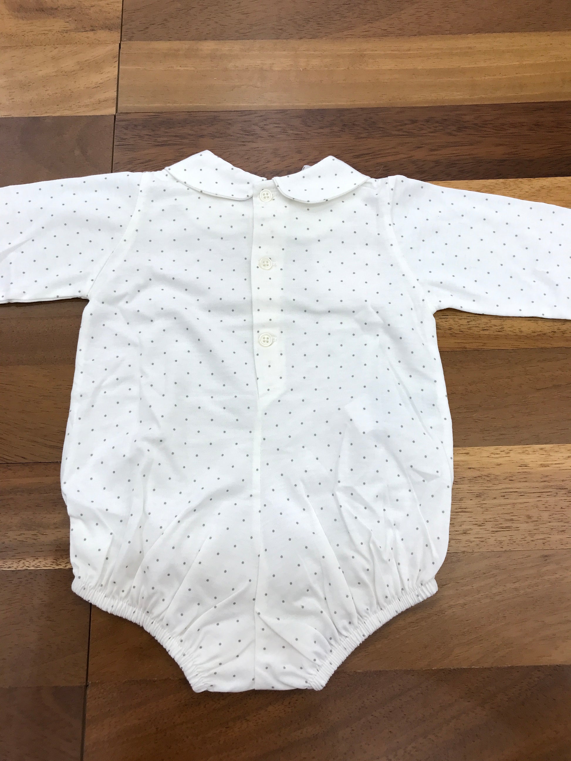 Realizzato in caldo cotone, questo body a maniche lunghe dispone di un colletto e di elastico sulle gambine, arricchito da numerosi piccoli pois grigi che ne impreziosiscono il design.