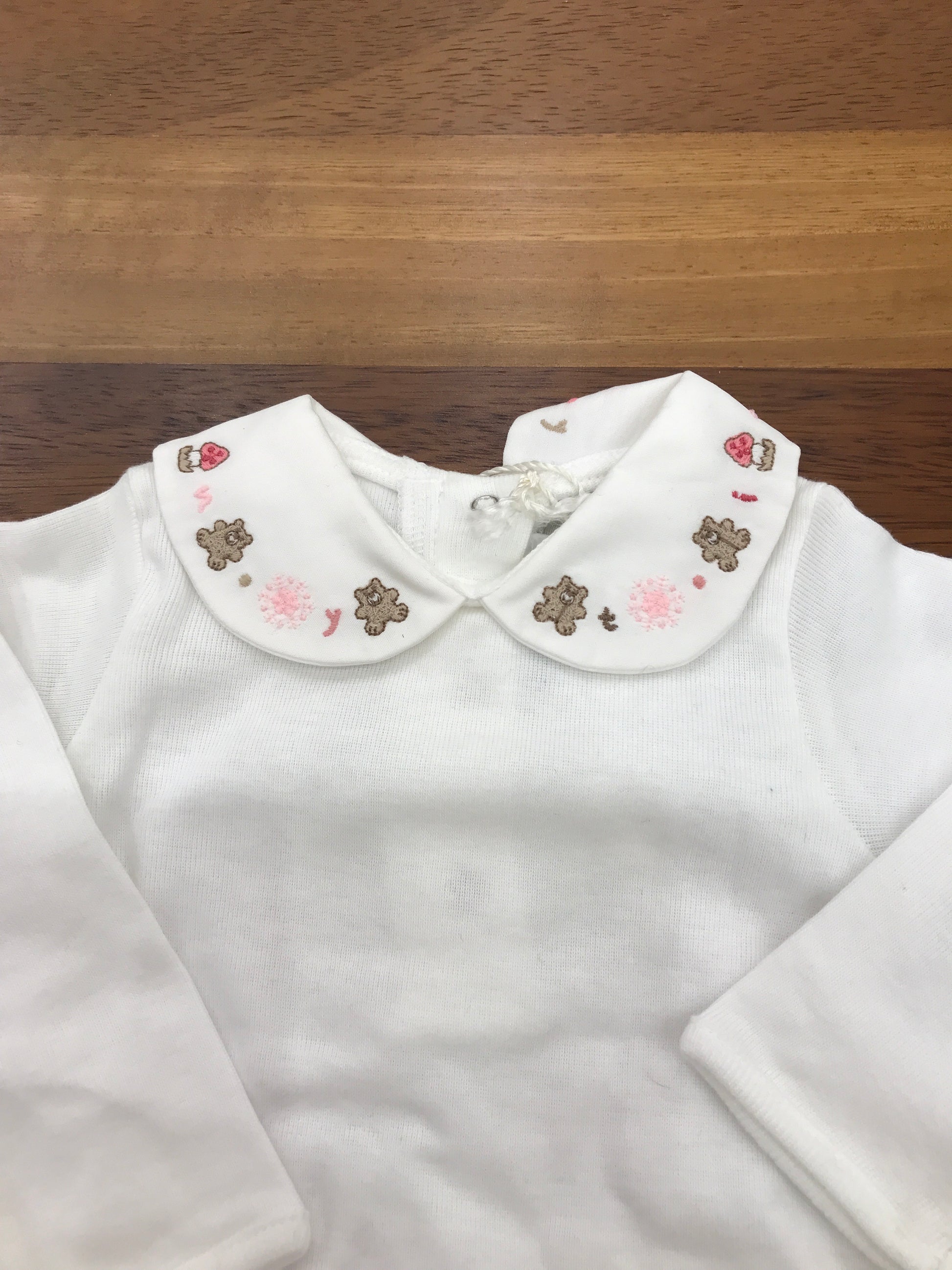 Body realizzato in caldo cotone con maniche lunghe, dotato di colletto decorato da ricami di orsetto e funghetto rosa, accompagnati da ulteriori dettagli ricamati in rosa.
