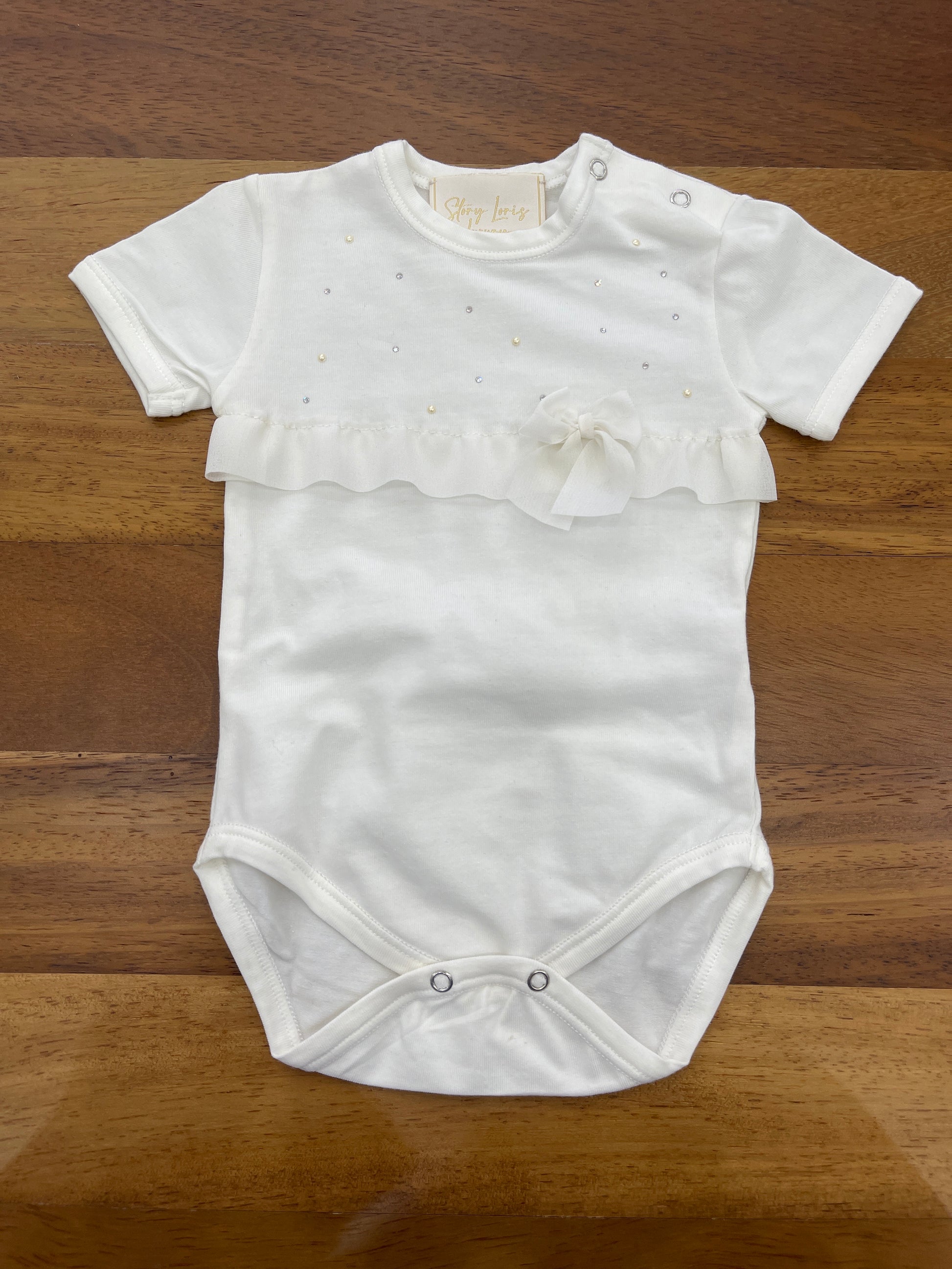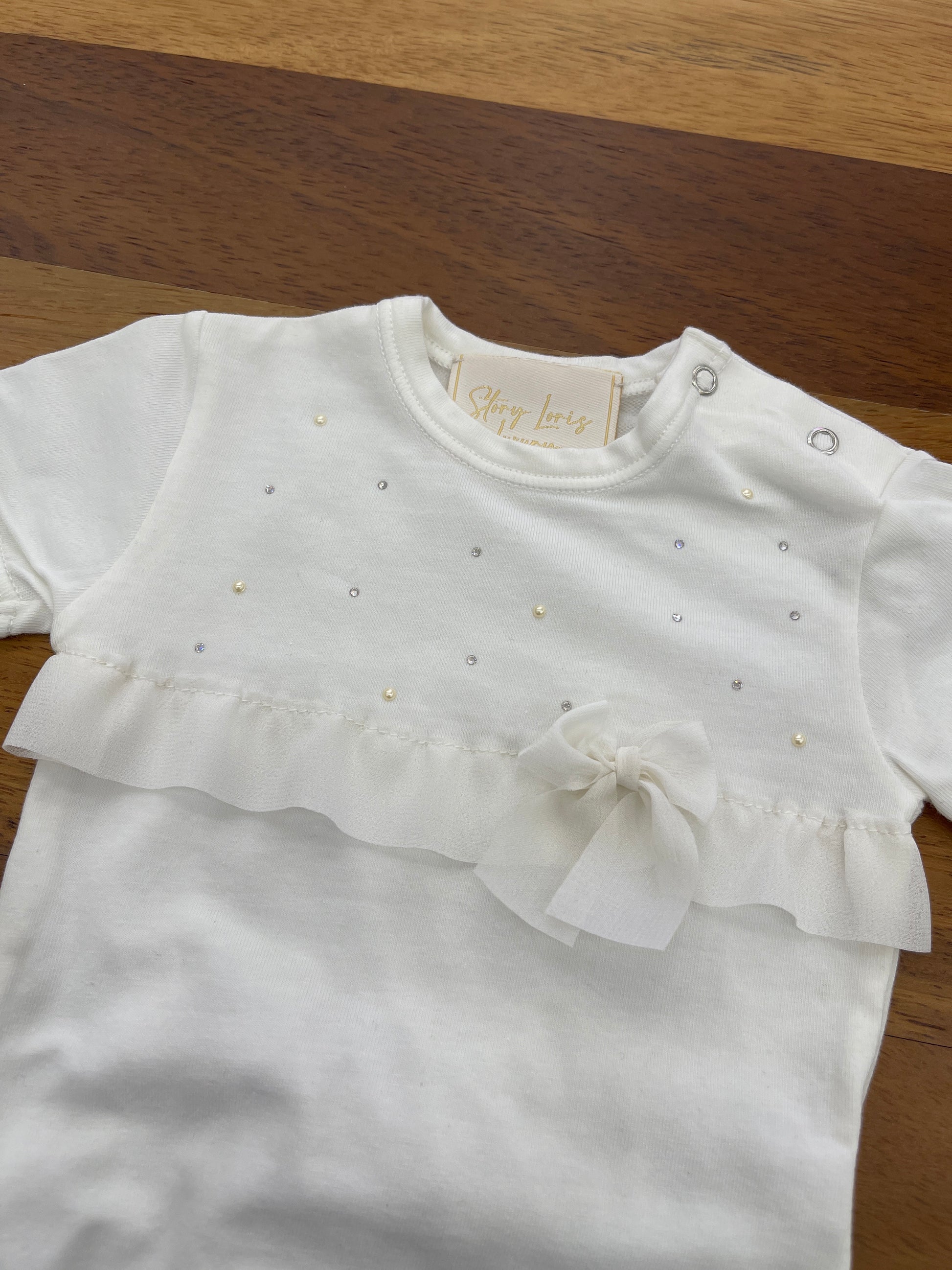 Body di cotone di lusso con dettagli di Swarovski e perle su corpetto a mezza manica. Con roush di organza e un elegante fiocco, questo body è perfetto per un look raffinato e di tendenza. Comodo e chic, ti farà sentire al top in ogni occasione.