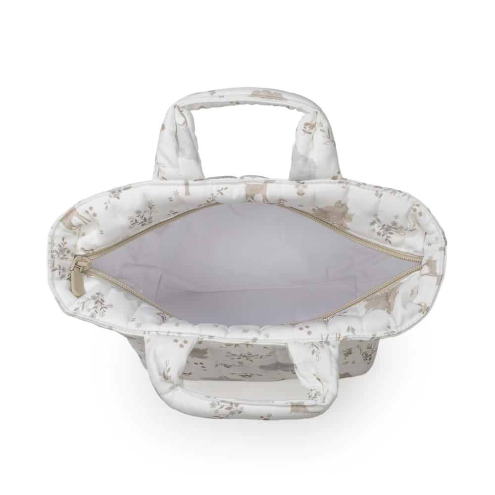 Il beauty case per bebé Nara di Pasito a Pasito, realizzato in 100% cotone con una delicata stampa di cervi e alberi in tonalità neutre, è una piccola borsa pensata appositamente per trasportare tutti i prodotti per la cura del bambino quando si è fuori casa. È un modello unico, dallo stile raffinato, progettato per adattarsi perfettamente alle esigenze quotidiane. Il suo design semplice, elegante e pratico offre uno spazio compatto ma ben organizzato, ideale per contenere gli elementi essenziali per l’igiene del bebé, come pettini, lozioni e altri piccoli oggetti che spesso si perdono all’interno della borsa maternità. Dispone di una chiusura con zip per un’apertura facile e veloce.
