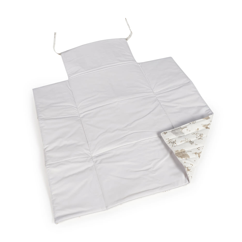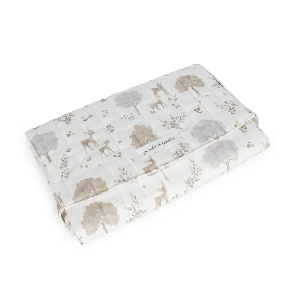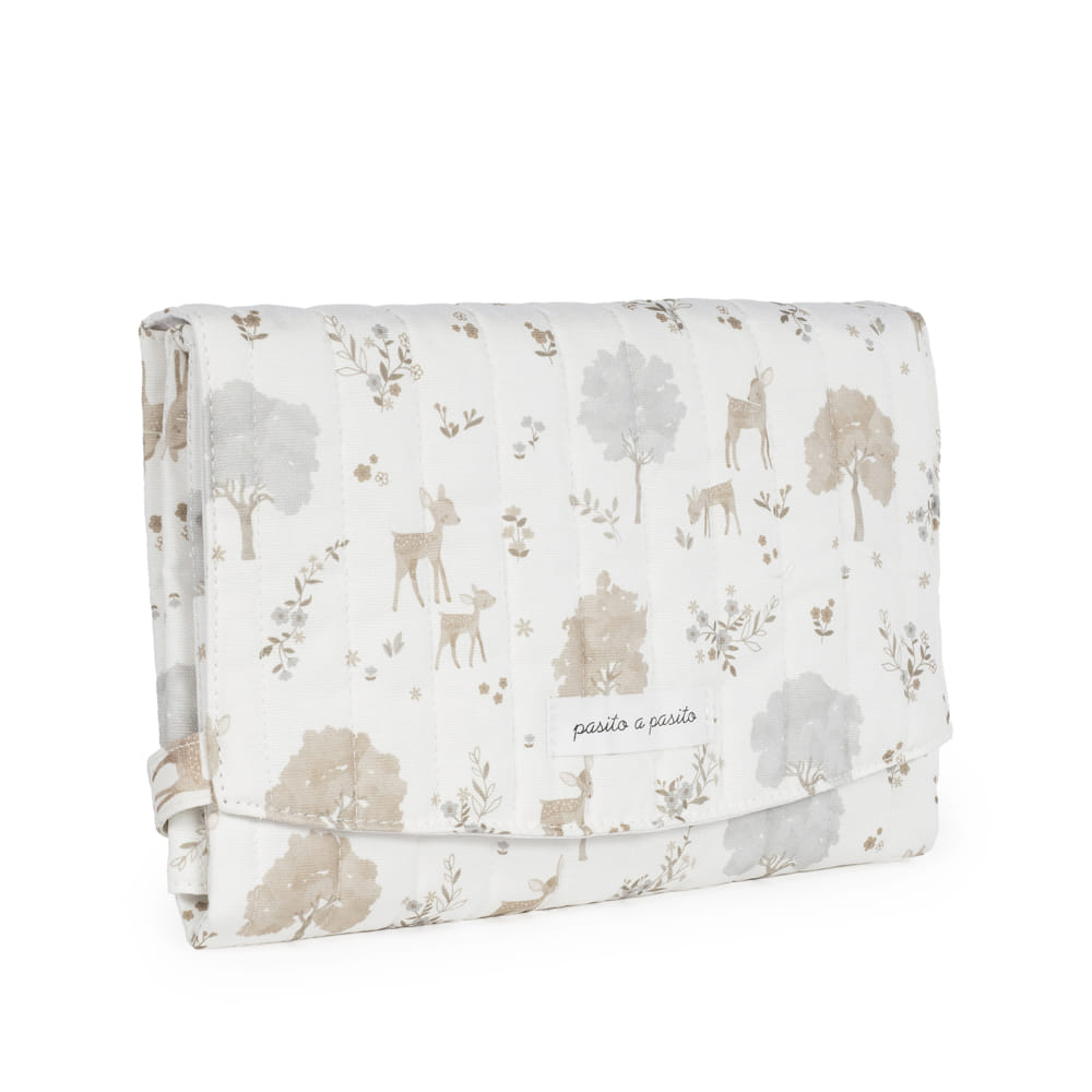 Il fasciatoio per bebé Nara di Pasito a Pasito, realizzato in 100% cotone con una delicata stampa di cervi e alberi in tonalità neutre, è un modello estremamente comodo, pratico e facile da trasportare. Il suo design è stato studiato appositamente per offrire una soluzione funzionale e raffinata quando è necessario cambiare il bambino. È pieghevole, il che lo rende facilmente trasportabile ovunque. Grazie al suo formato compatto, si chiude su se stesso diventando un accessorio portatile ed elegante. Dispone di cinghie di chiusura che lo mantengono ben fermo, riducendone l’ingombro e permettendo di riporlo facilmente all’interno della borsa maternità.