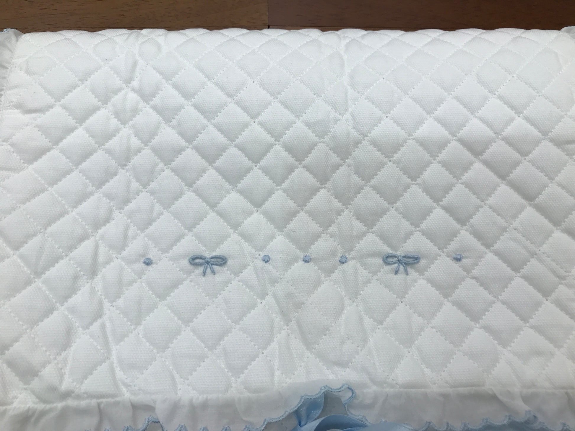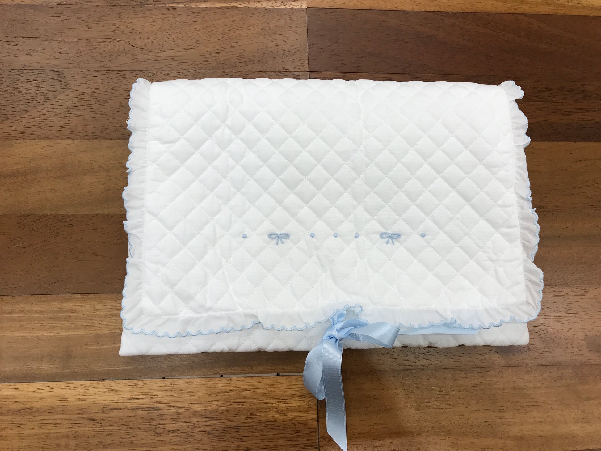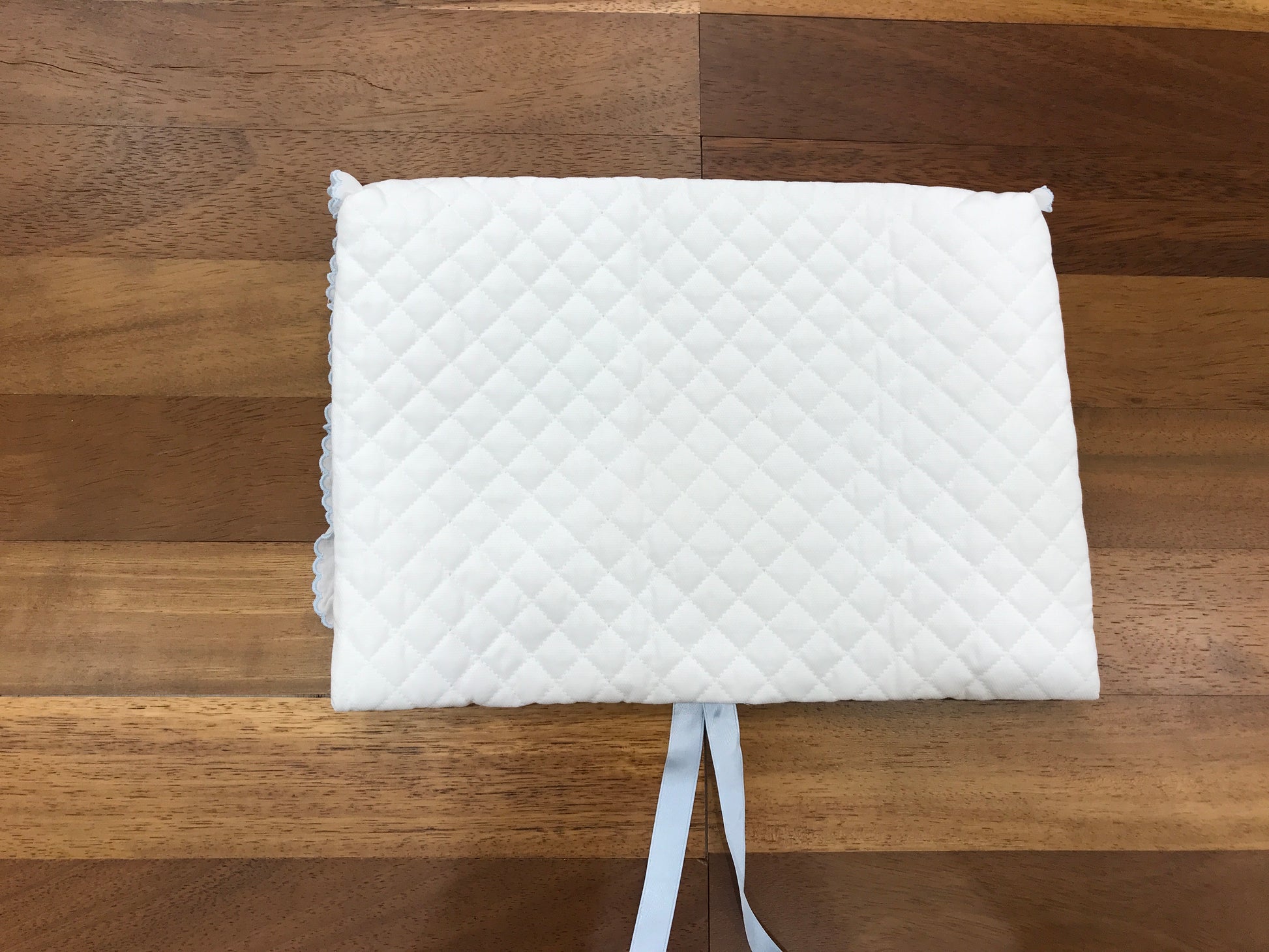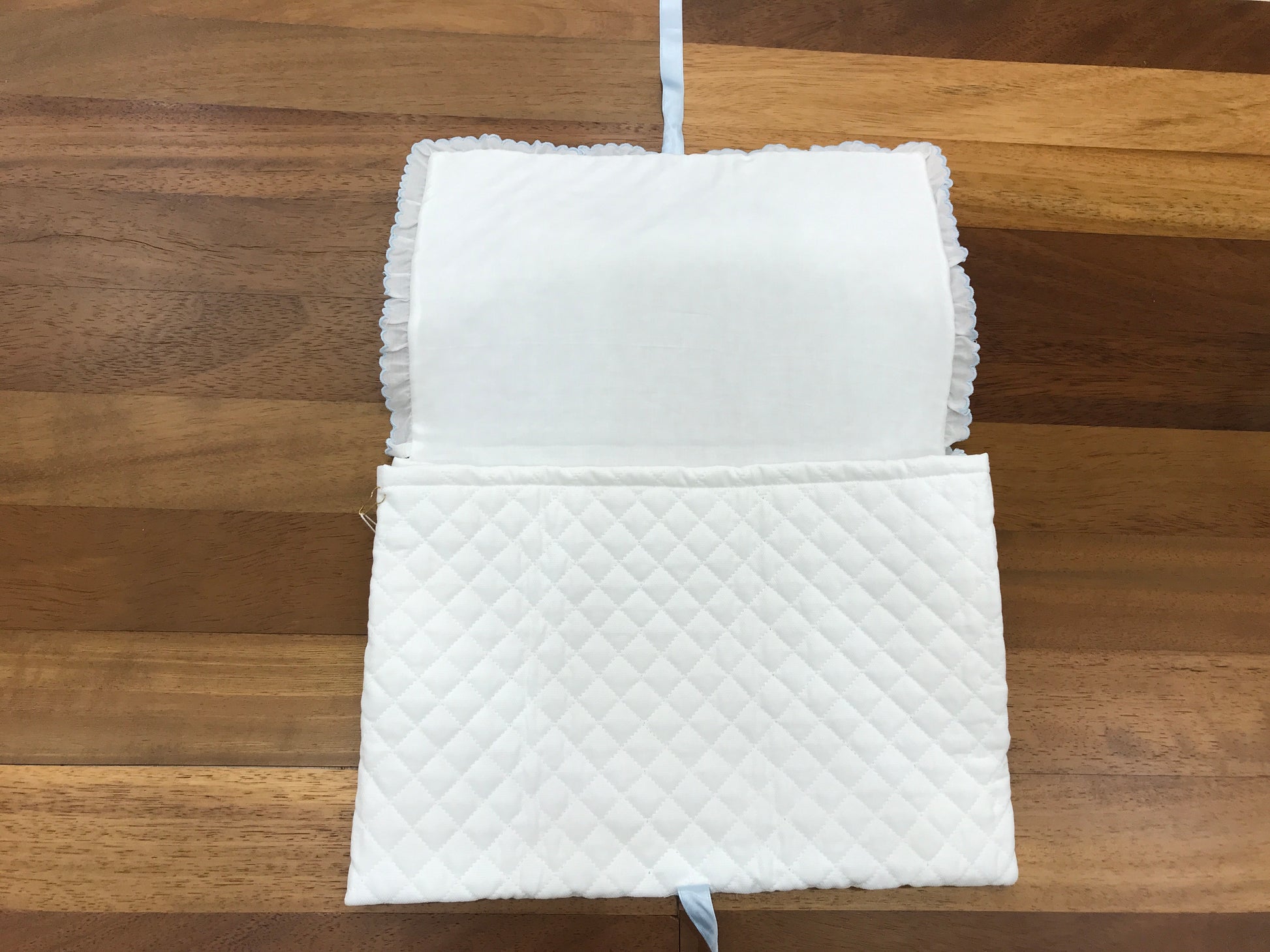 La busta cambio presenta un elegante colore bianco e viene arricchita da un delicato nastro celeste. Inoltre, è impreziosita da raffinati dettagli artigianali, come fiocchetti ricamate a mano in celeste, che conferiscono un tocco di sofisticata eleganza e cura nel design.