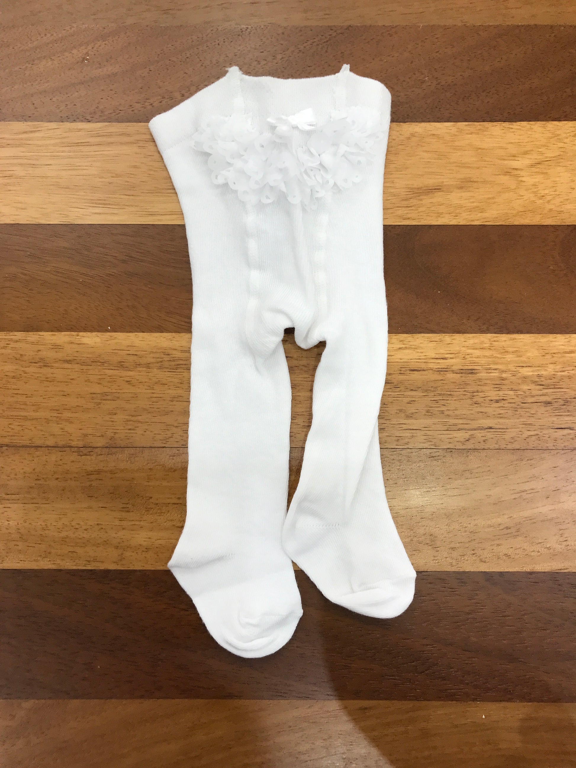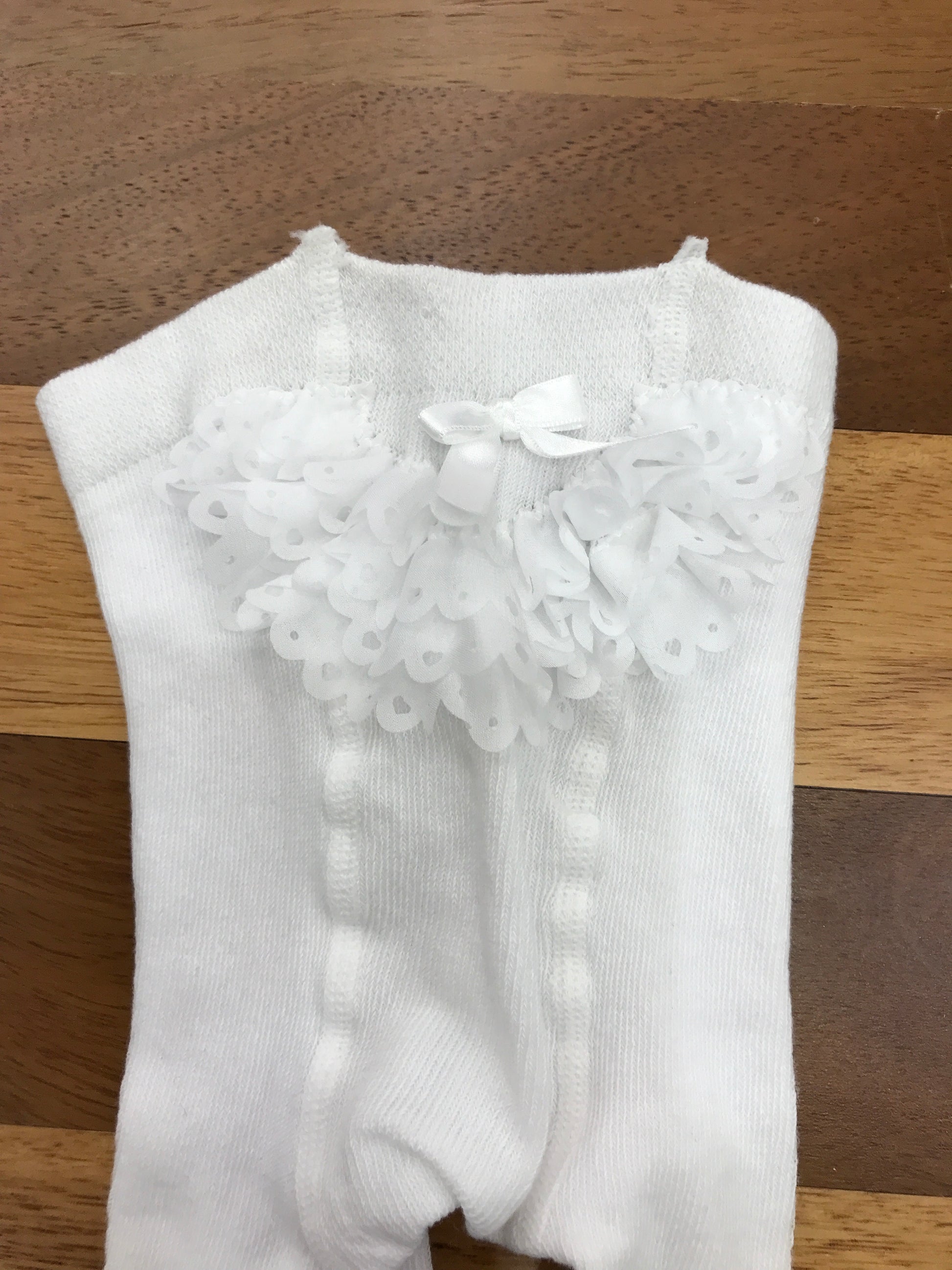 Calza in pura lana bianca, caratterizzata da un delicato riccetto sul retro coordinato e da un elegante fiocchetto decorativo. Un capo essenziale che unisce comfort e raffinatezza, ideale per completare l'outfit dei più piccoli con stile e calore.