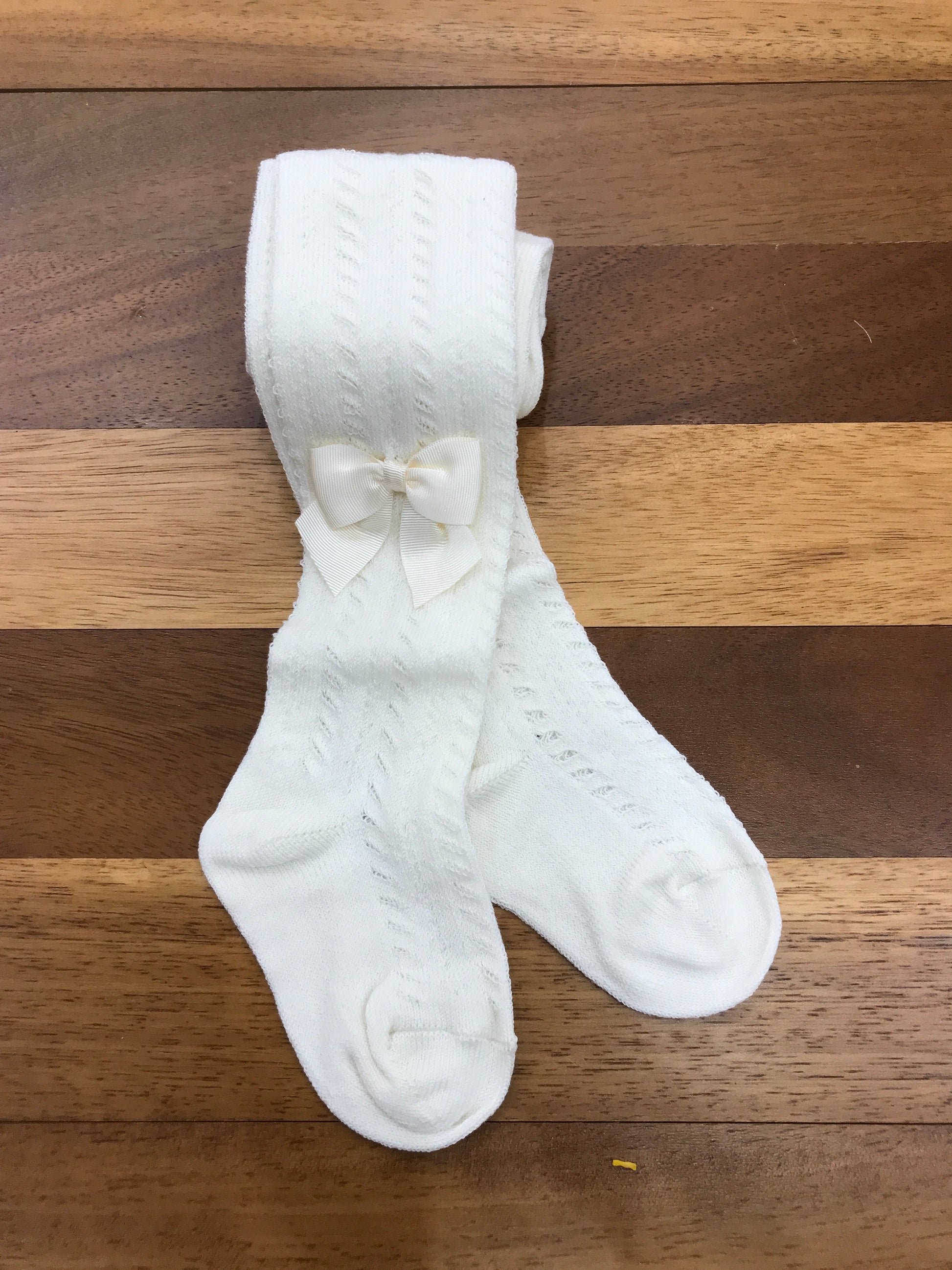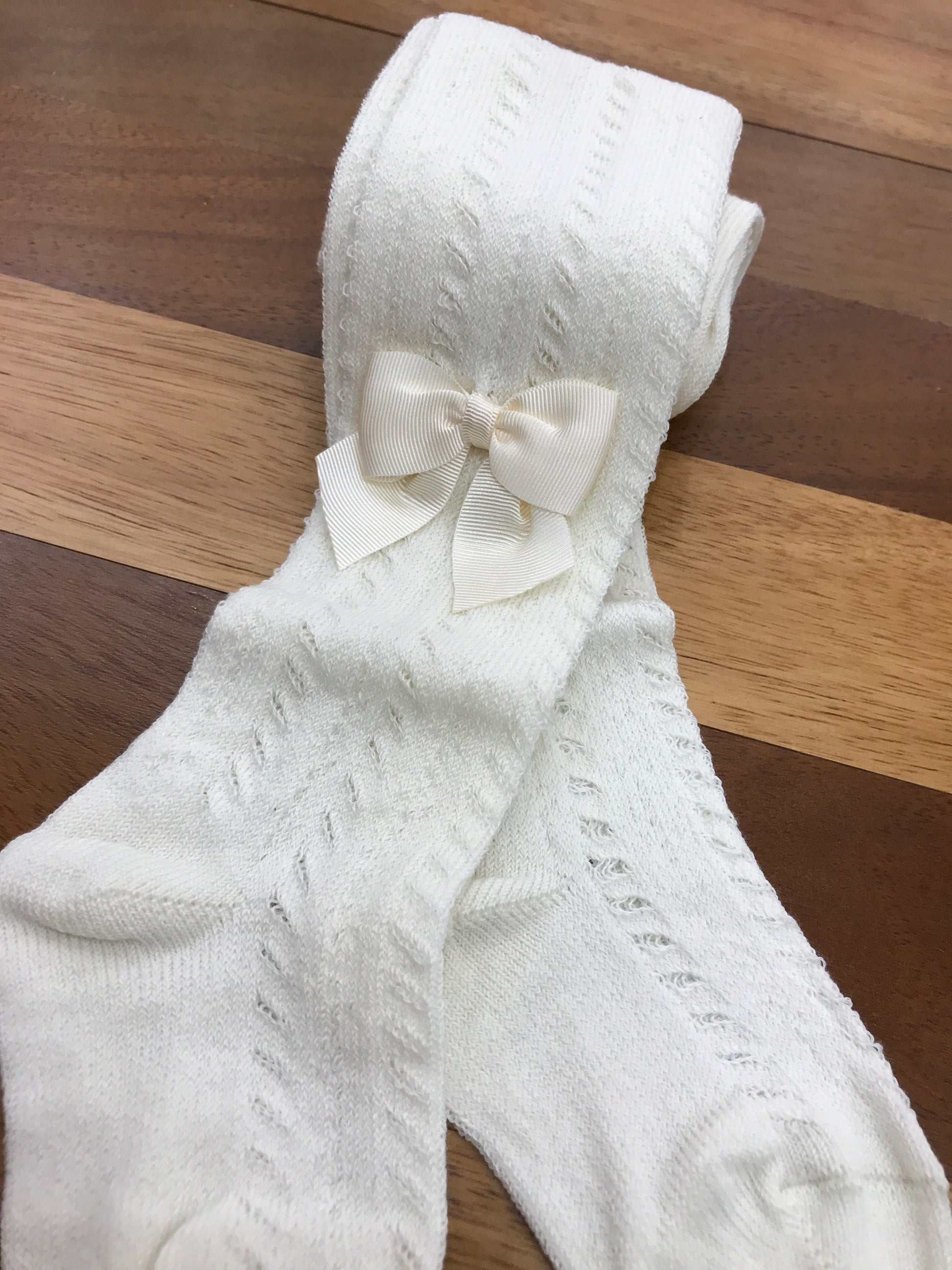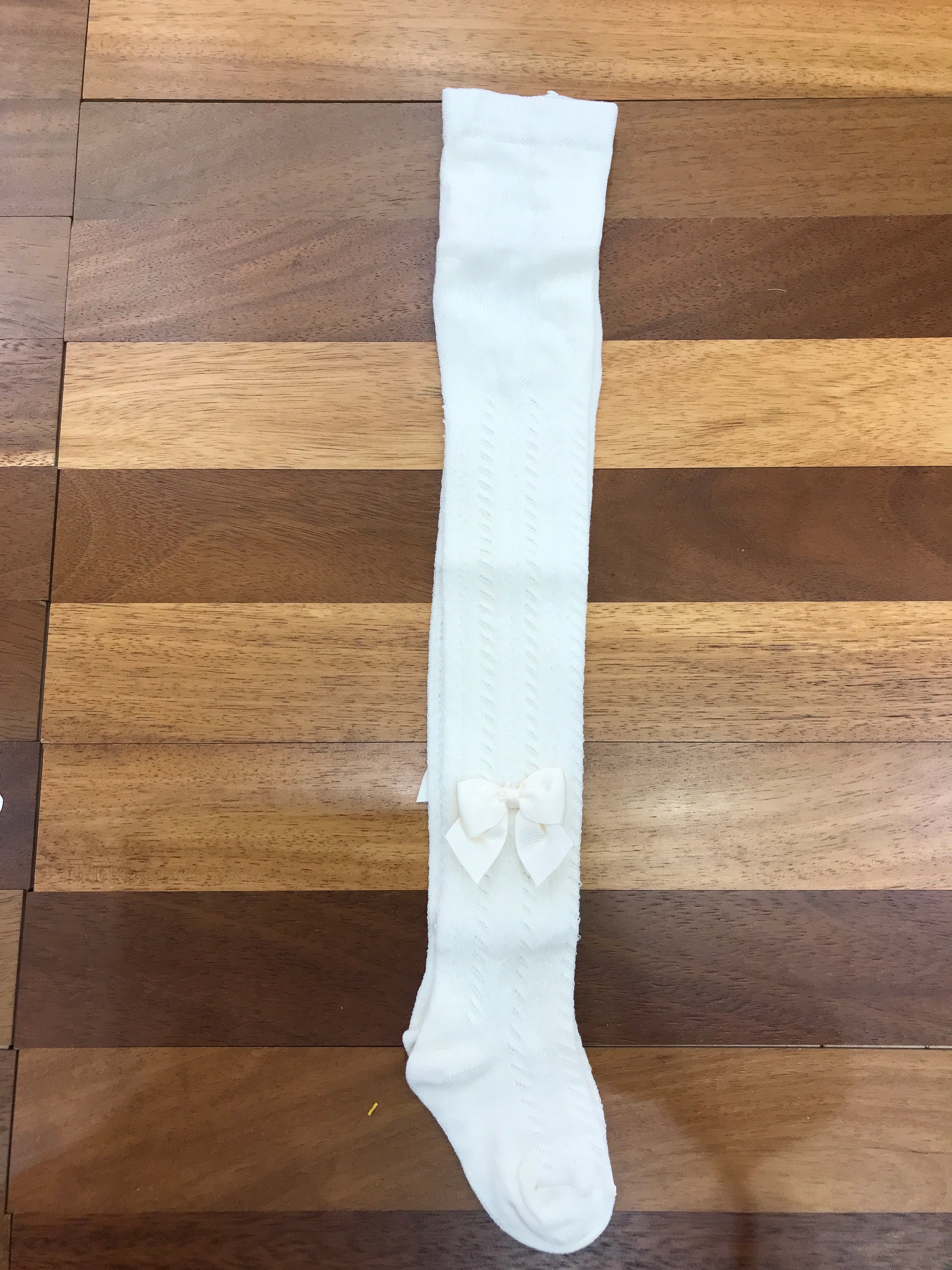 Calza in pura lana panna con lavorazione traforata che crea un effetto elegante e raffinato. Caratterizzata da un delicato fiocchetto laterale alle gambine, rappresenta una scelta sofisticata per chi ricerca dettagli curati e qualità superiore. Ideale per occasioni speciali, combina comfort termico con un design distintivo.