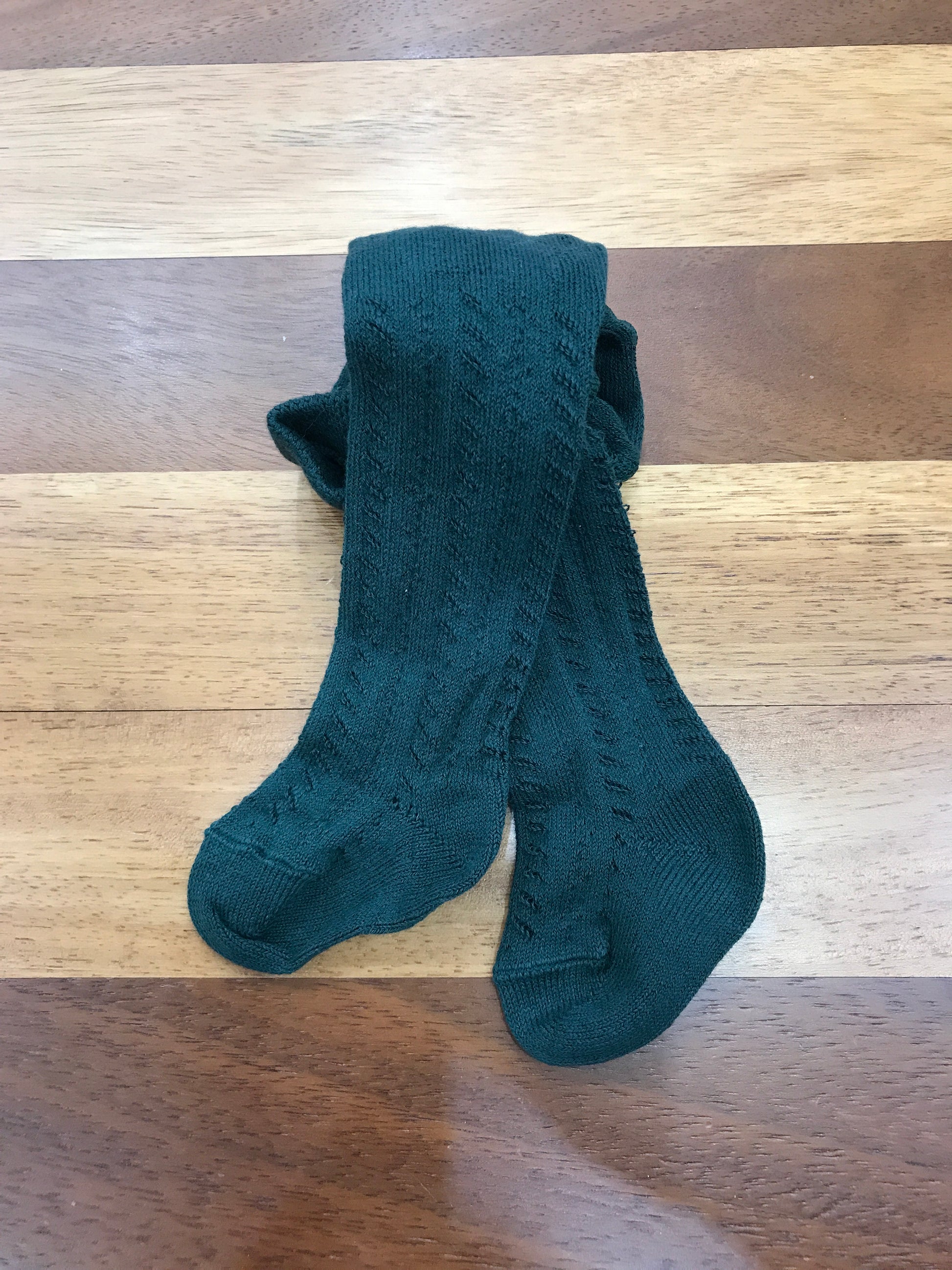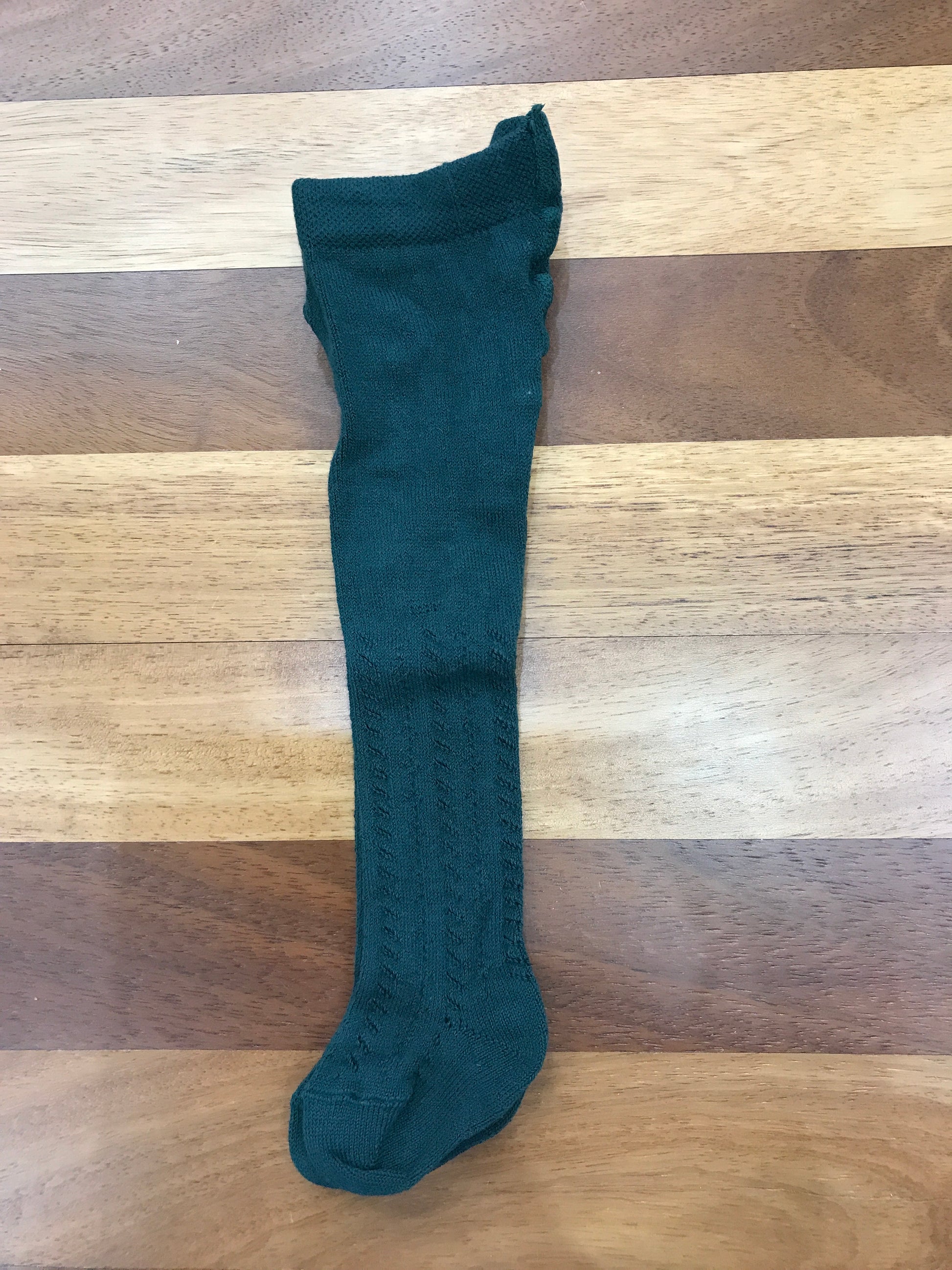 Calza realizzata in pregiata lana, caratterizzata da una trama traforata che ne esalta l'eleganza. La tonalità verde bottiglia conferisce un tocco sofisticato e versatile, perfetta per completare look raffinati con stile consapevole.