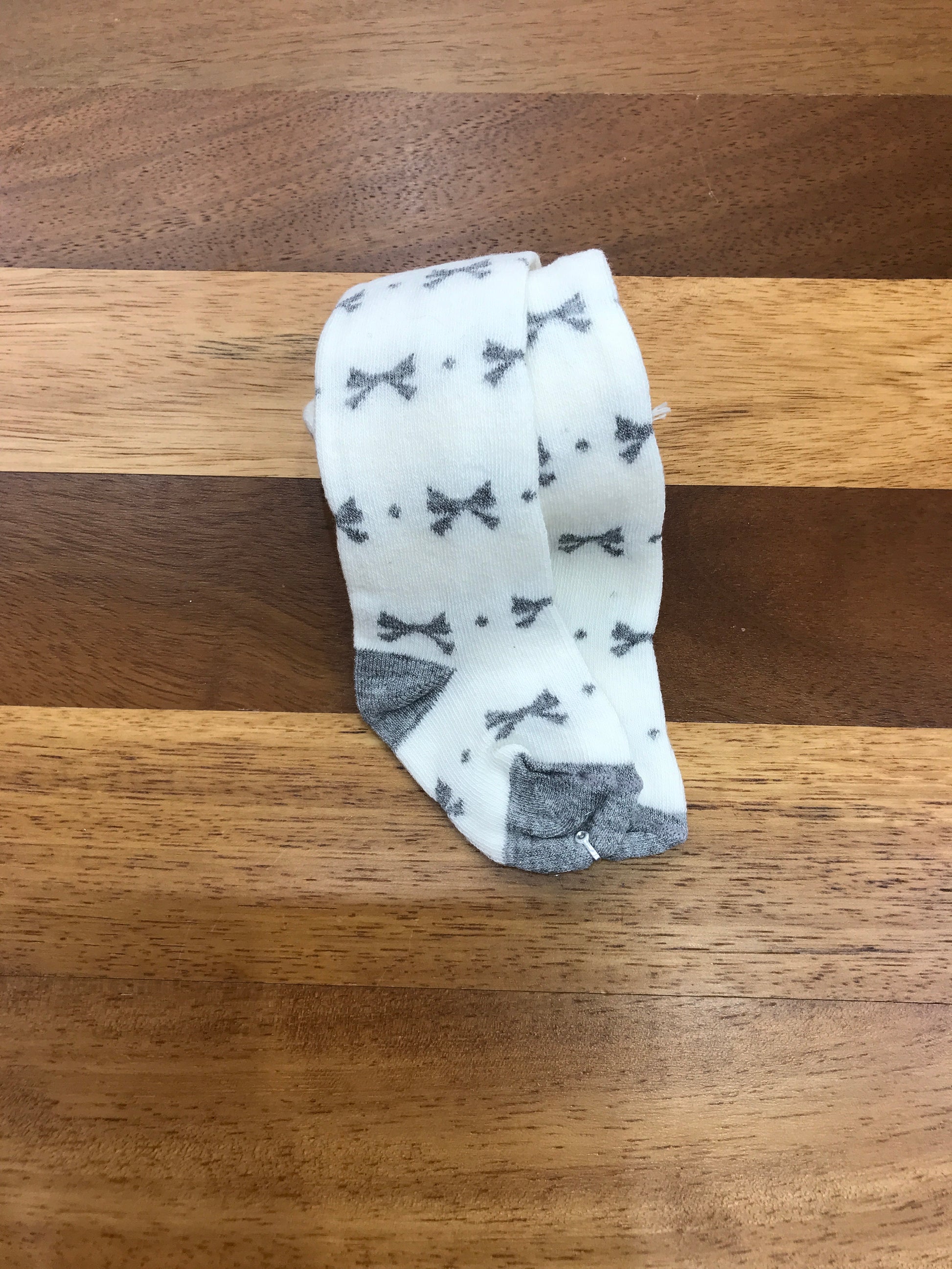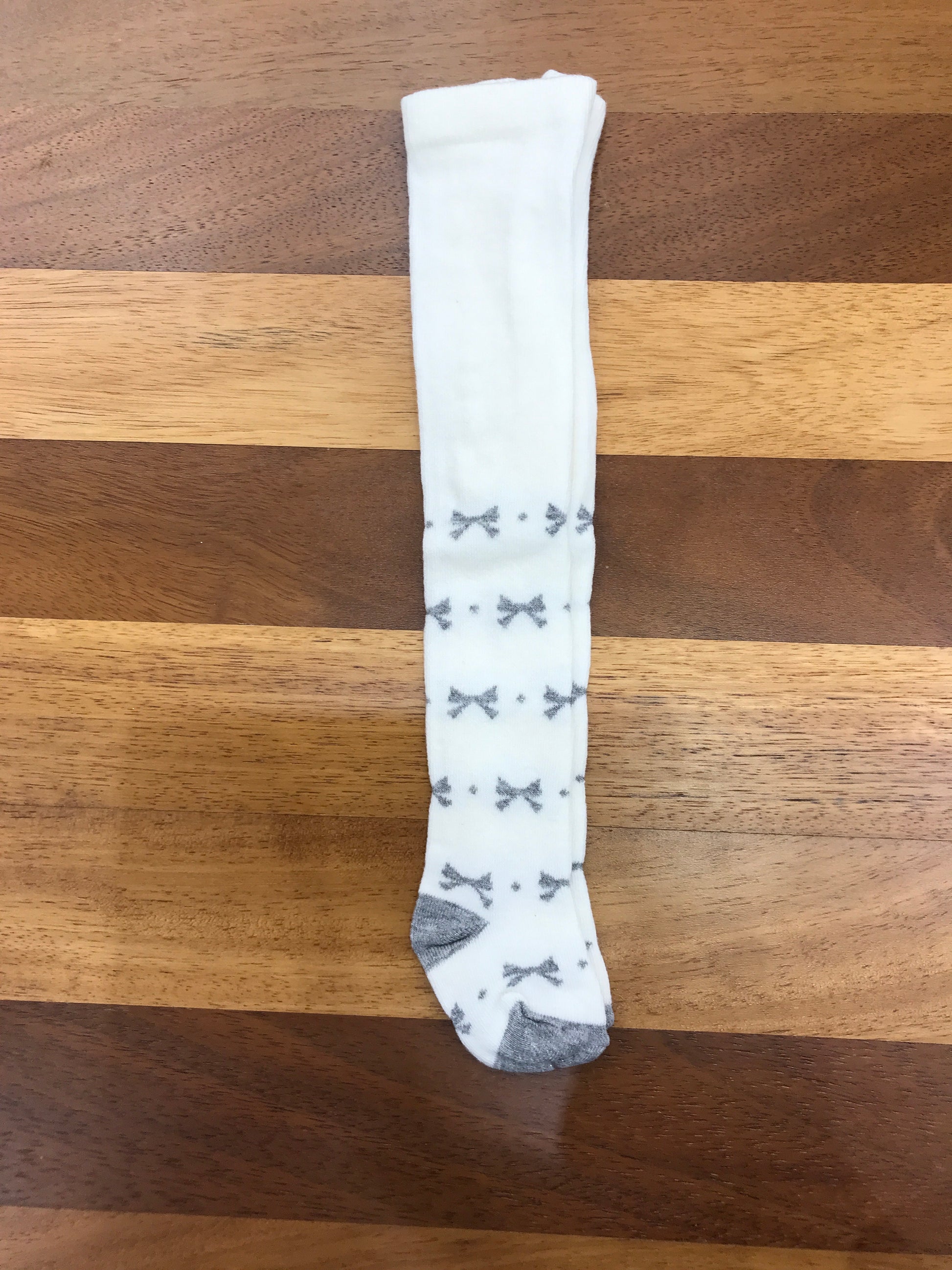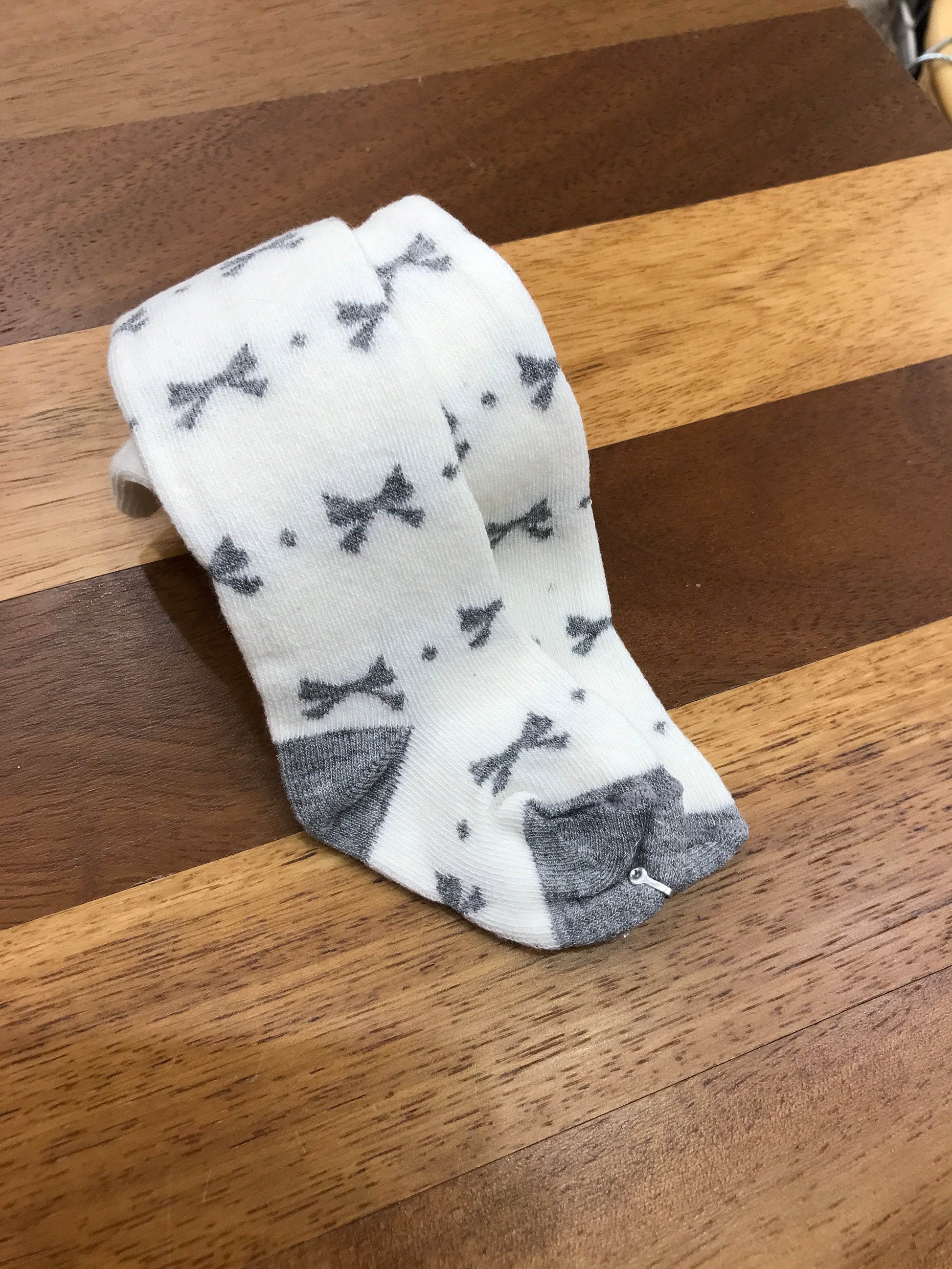 Delicata calza in tonalità panna impreziosita da eleganti fiocchetti grigi distribuiti lungo tutta la lunghezza. Un accessorio raffinato che combina semplicità e dettagli decorativi, perfetto per aggiungere un tocco di stile sofisticato al guardaroba della piccola. La combinazione cromatica neutrale la rende versatile e facile da abbinare con qualsiasi outfit.