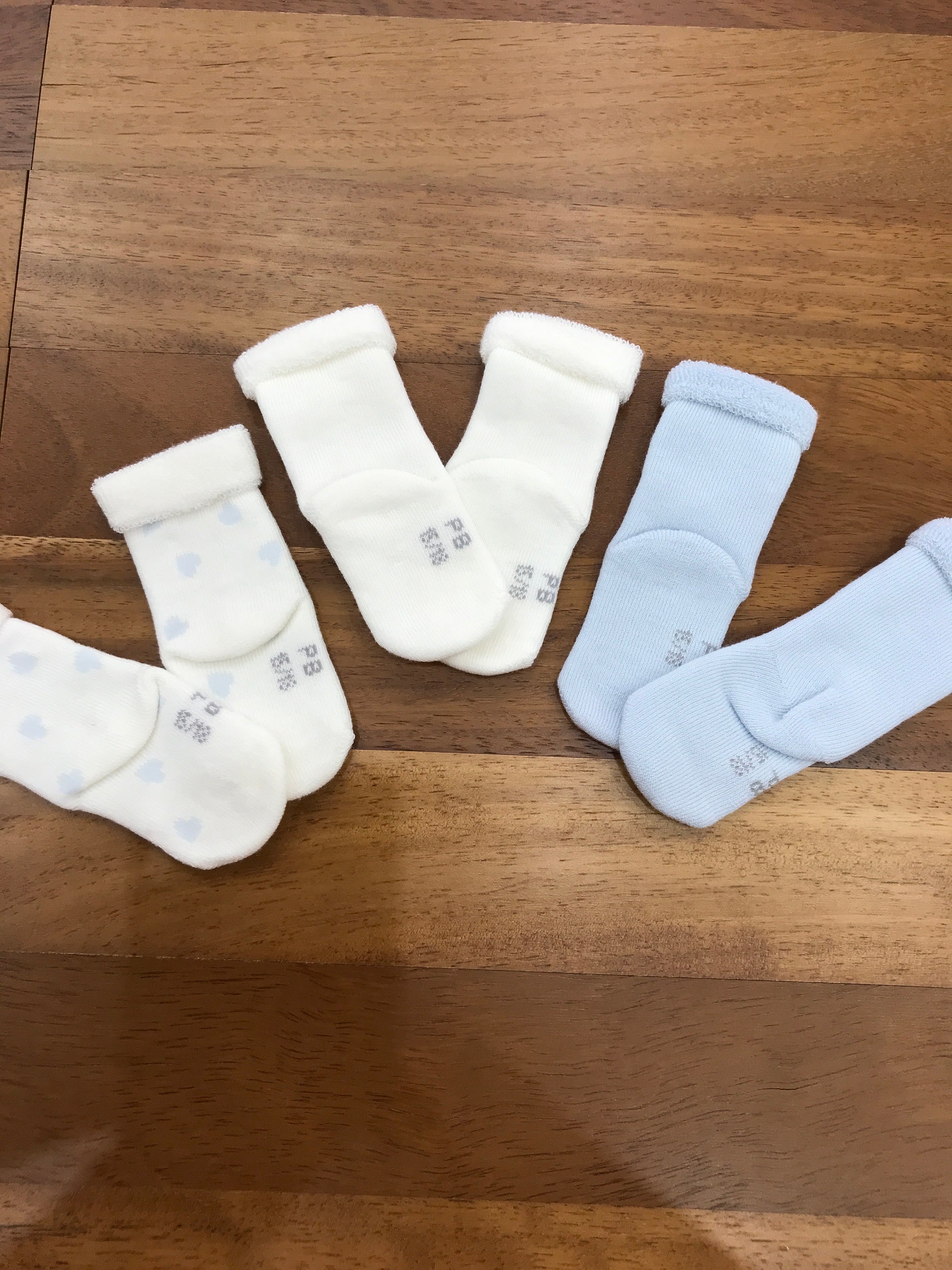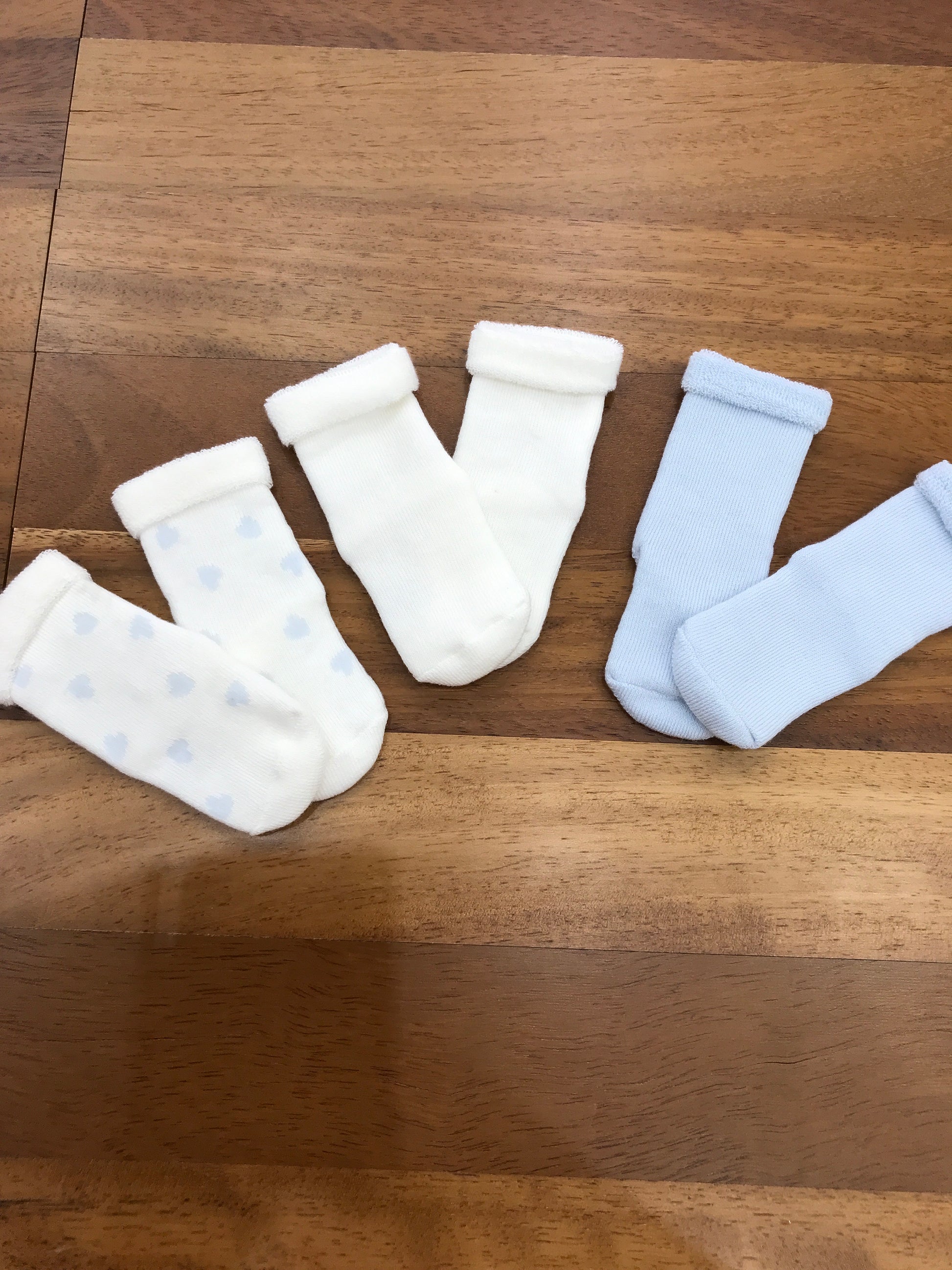 Set di tre calzini con risvolto piccolo: uno celeste semplice, uno bianco semplice e uno bianco decorato con cuoricini azzurri.