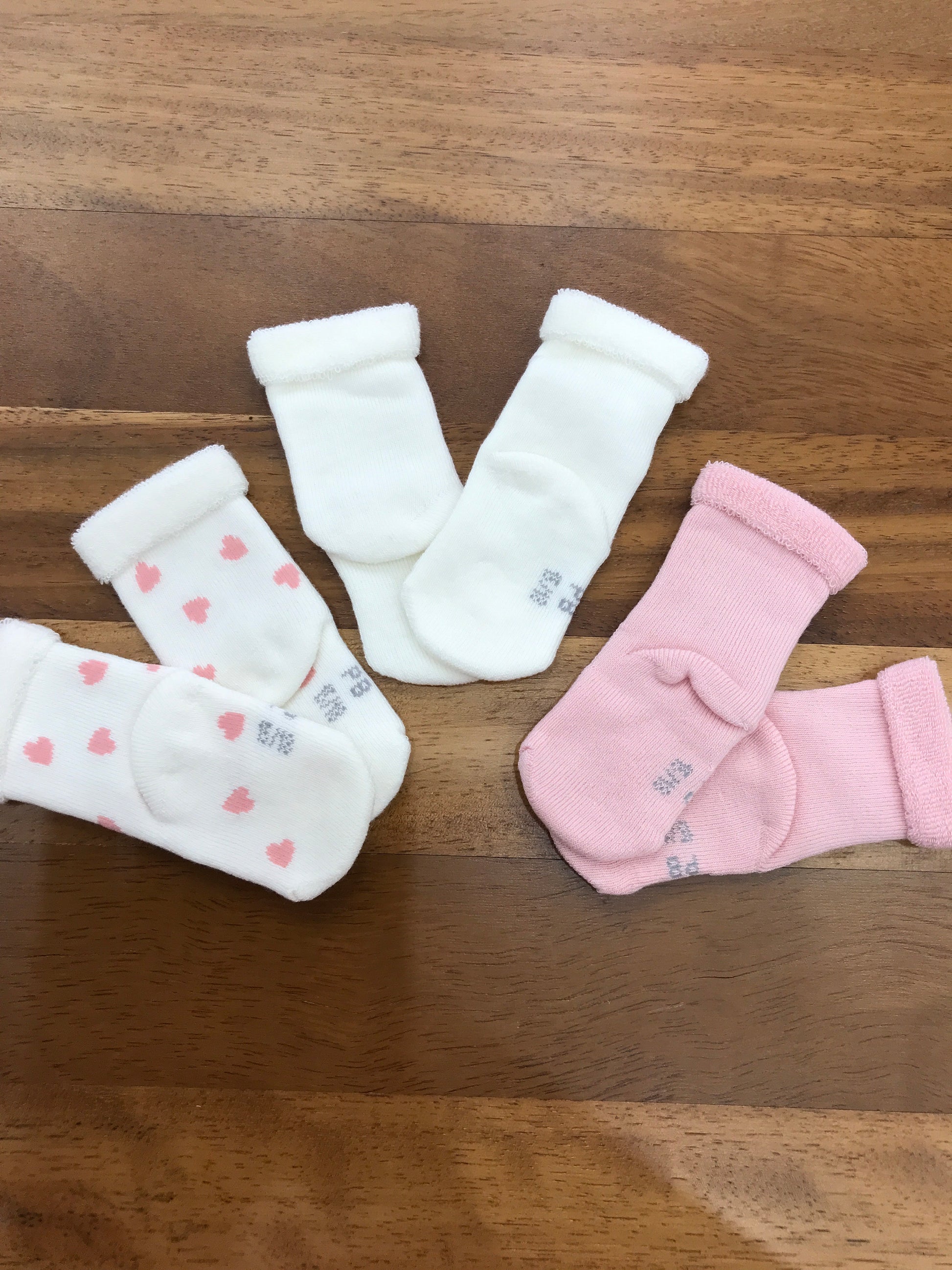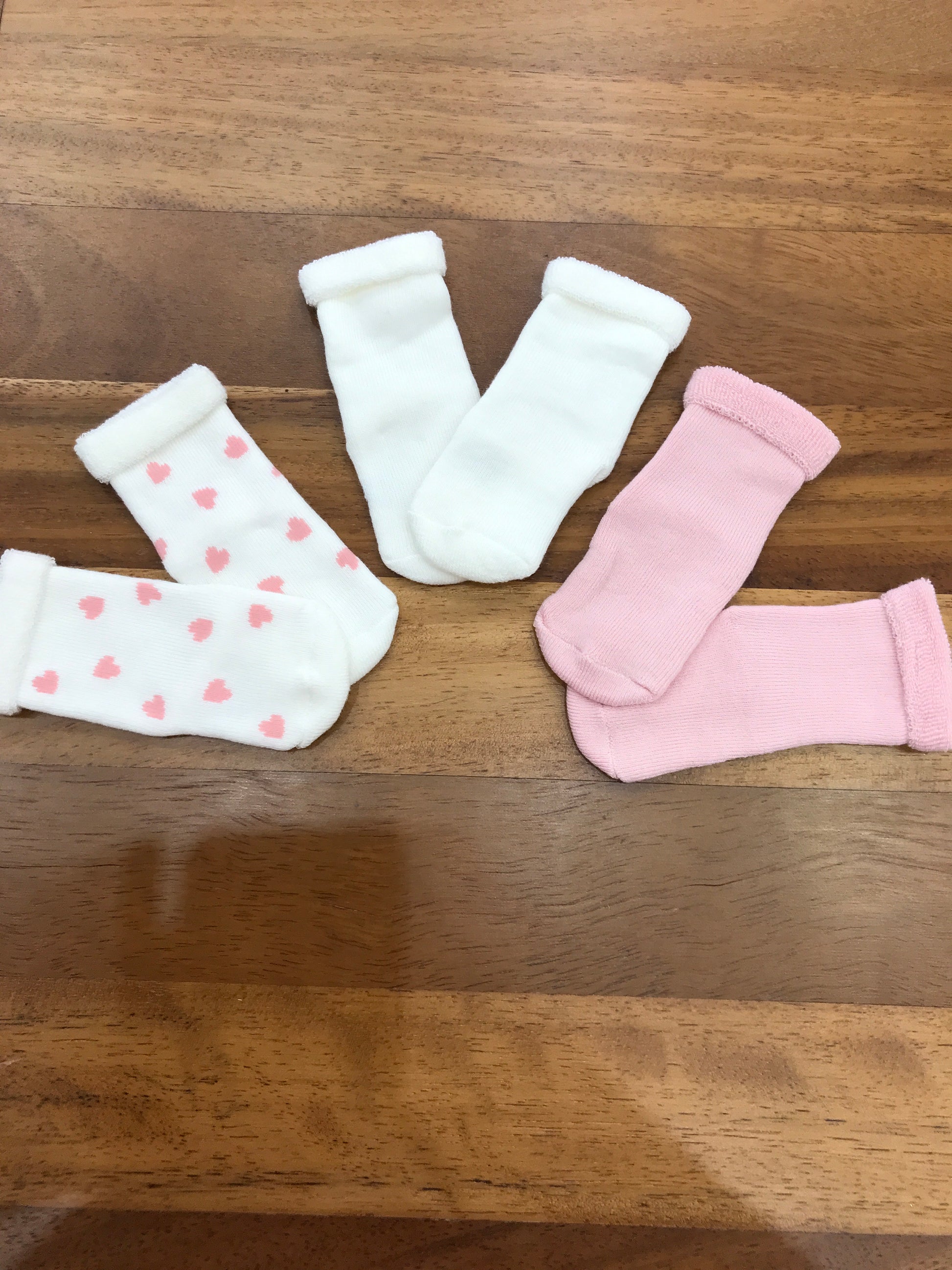 Set composto da tre paia di calzini con risvolto: uno rosa semplice, uno bianco semplice e uno bianco decorato con piccoli cuoricini rosa.