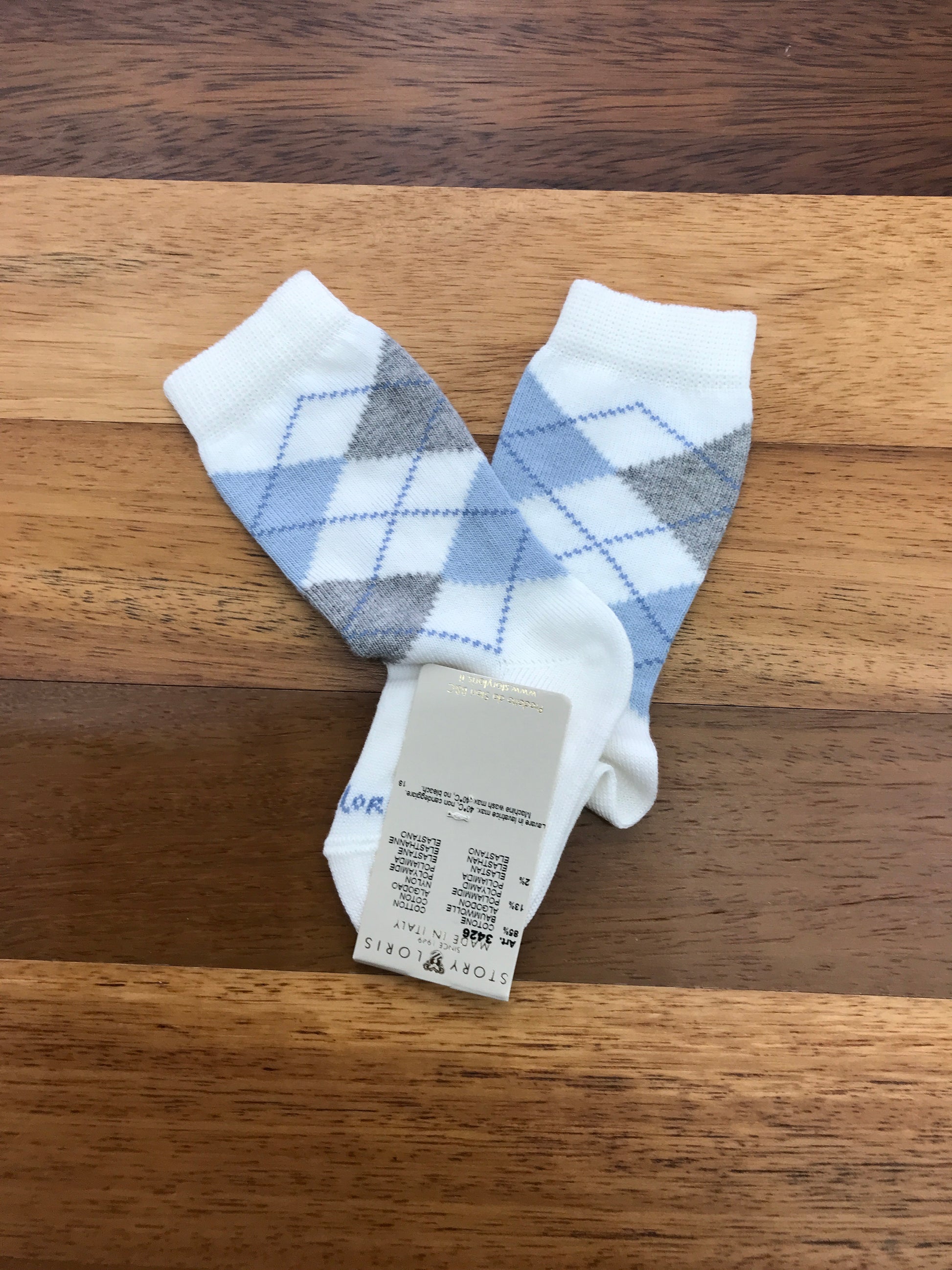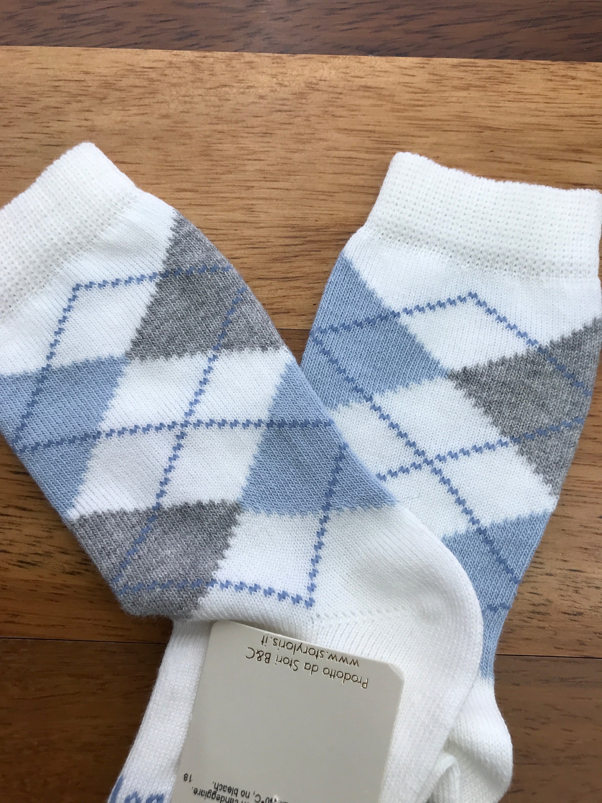 Calzini realizzati in lana di colore bianco e azzurro, caratterizzati da una decorazione a rombi.