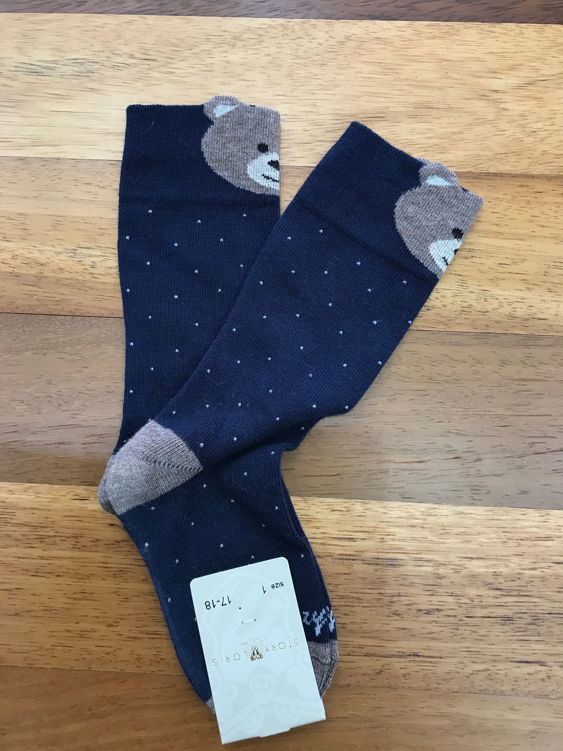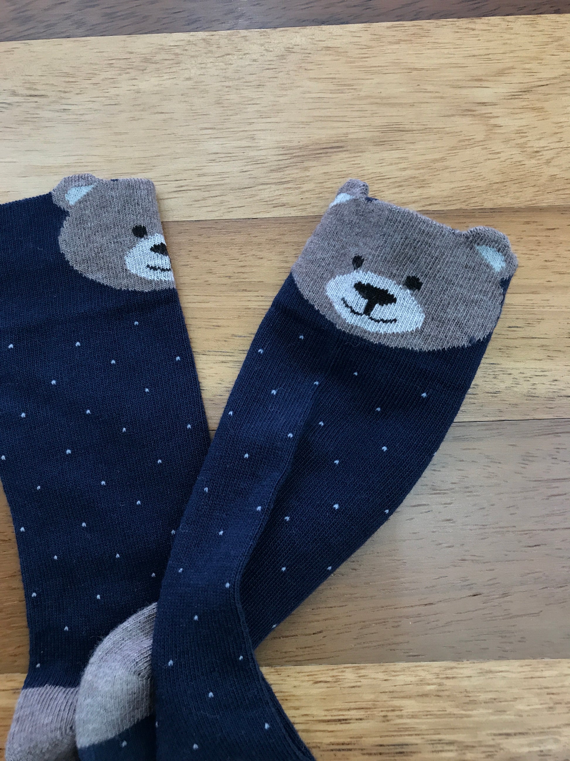 Calzini in lana di colore blu intenso, arricchiti da una fantasia a pois e caratterizzati dalla presenza di un orsetto sulla parte superiore del calzino.