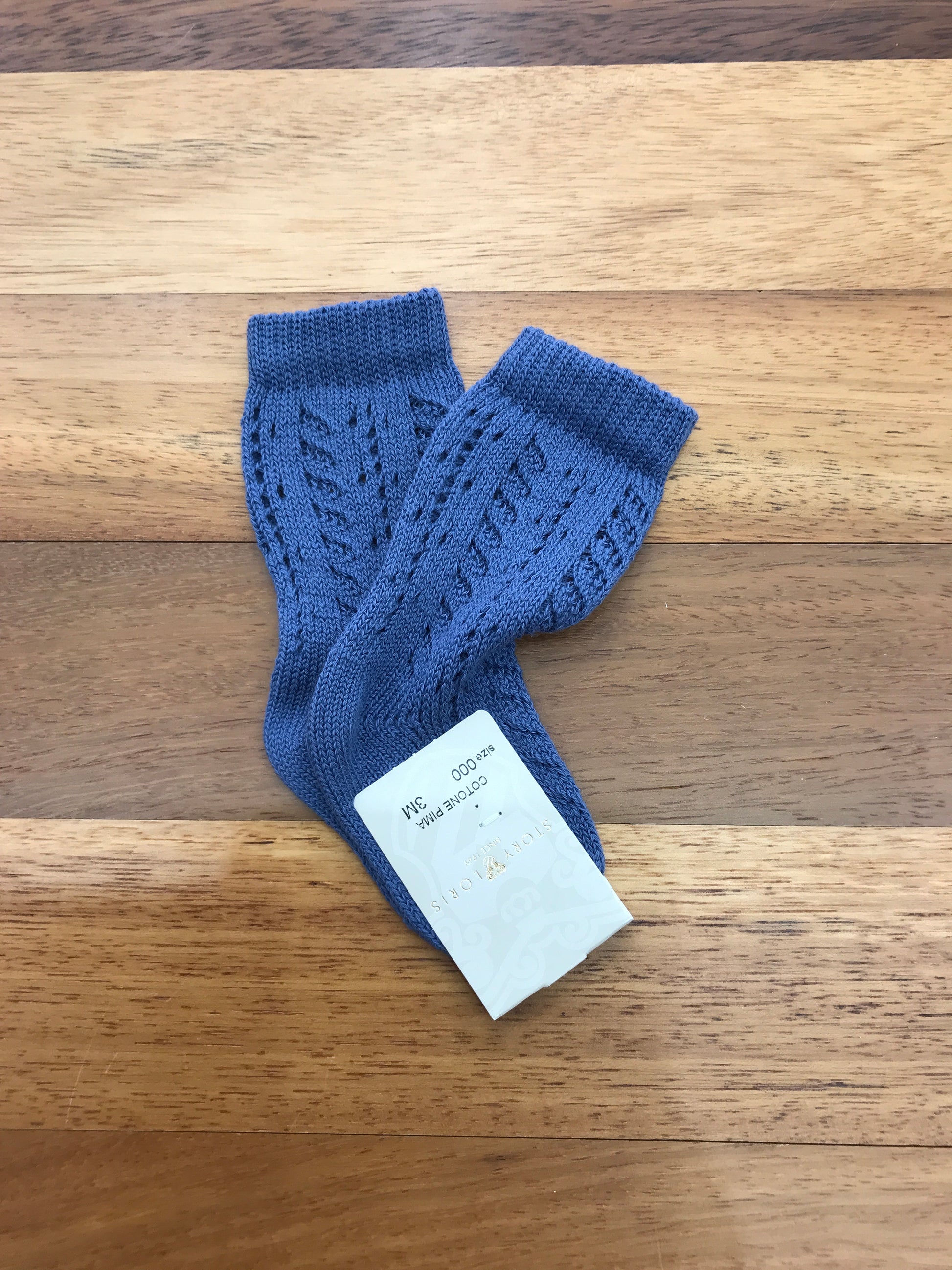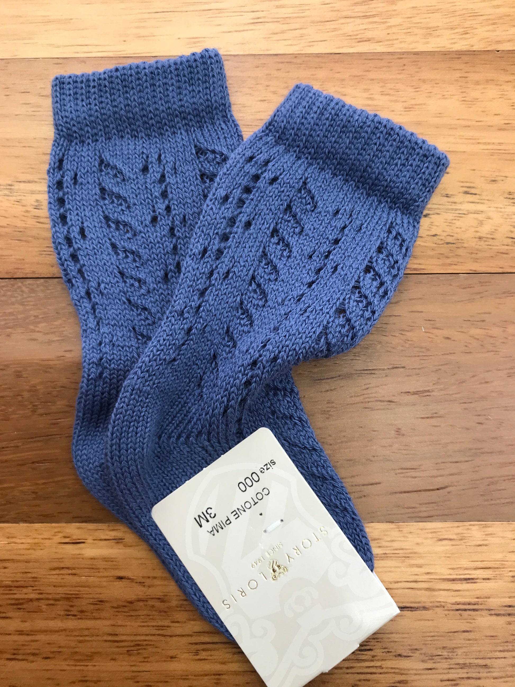 Calzini in lana blu traforata, con vestibilità che arriva fino a metà polpaccio.