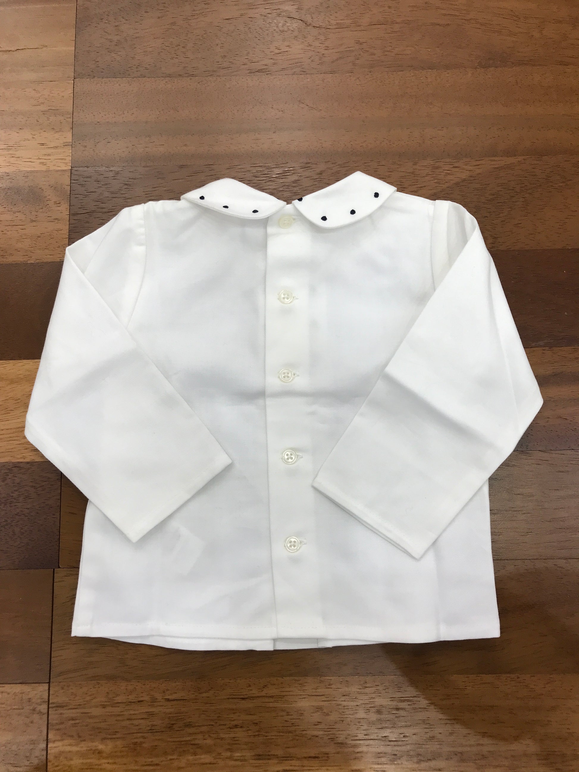 Elegante camicetta bianca impreziosita da delicati pois blu ricamati che decorano il colletto tondo e i bottoni superiori. Un dettaglio raffinato che conferisce carattere e sofisticatezza al capo, perfetto per chi apprezza i particolari curati e lo stile classico con un tocco di personalità.