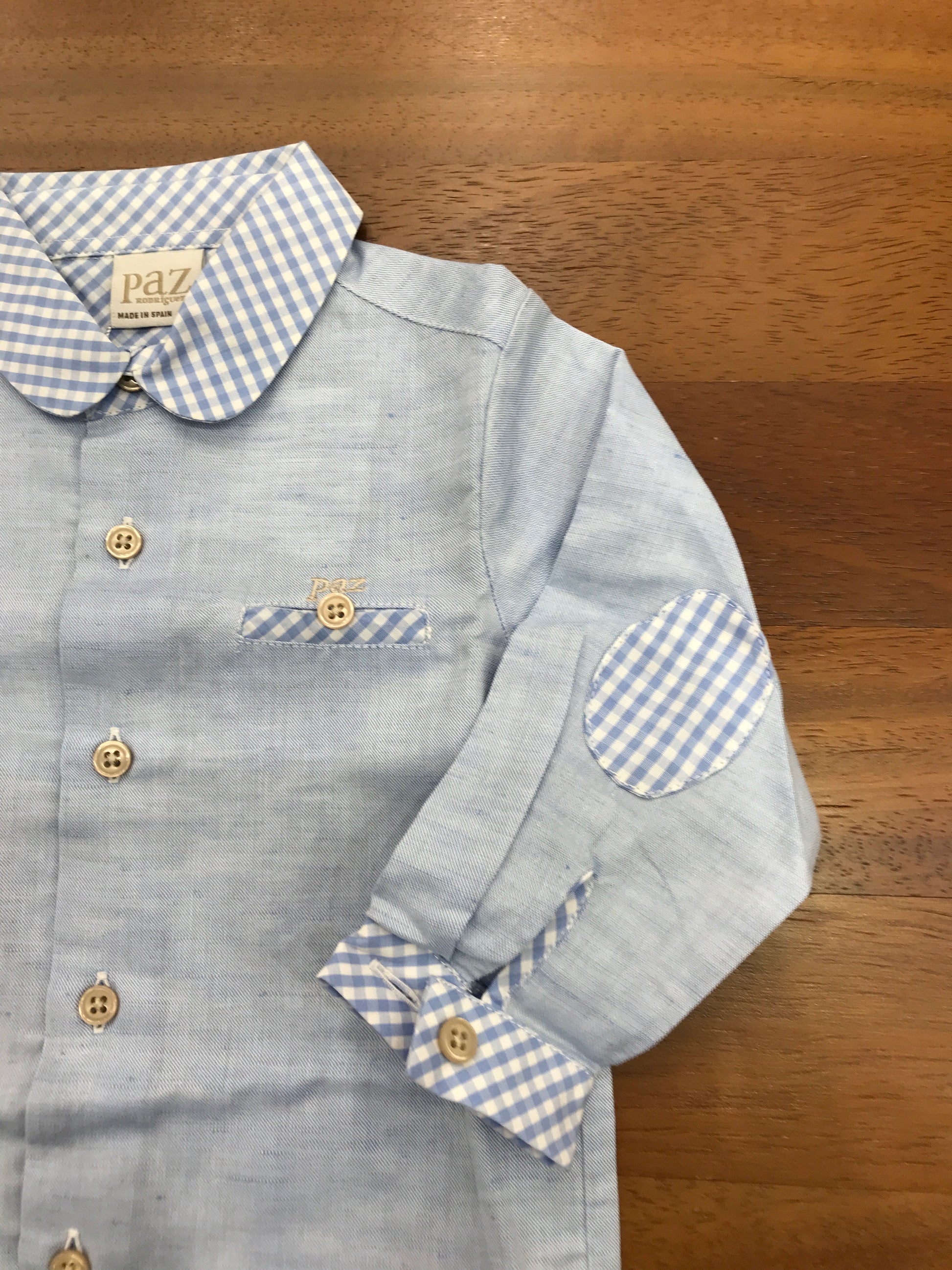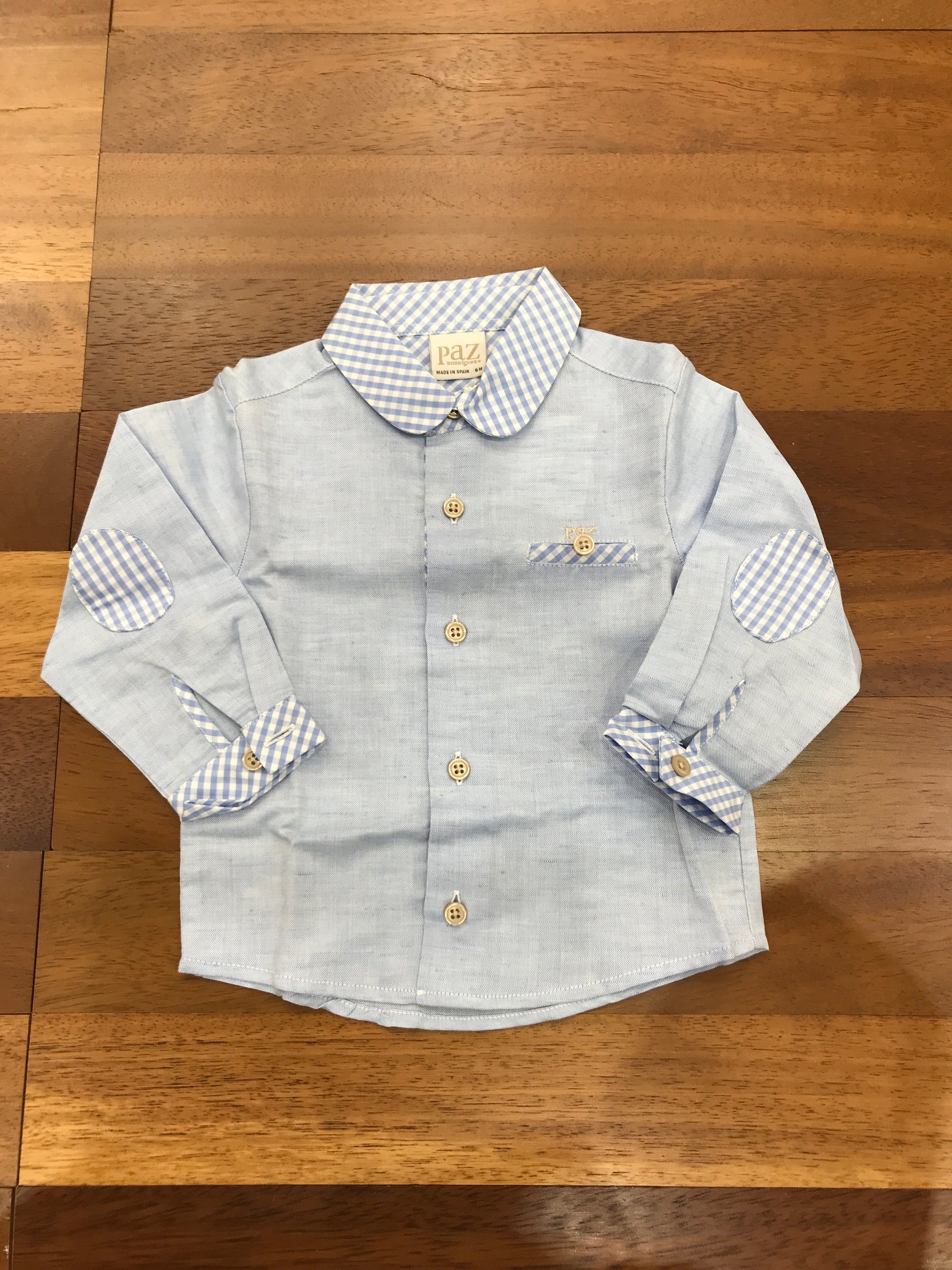 Elegante camicetta in puro cotone dalle tonalità azzurrate, caratterizzata da un raffinato colletto a quadretti bicolore in bianco e celeste. Dettagli costruttivi di pregio includono rinforzi al gomito sul retro e polsini rifiniti con cura, elementi che garantiscono durabilità e comfort durante l'uso quotidiano.