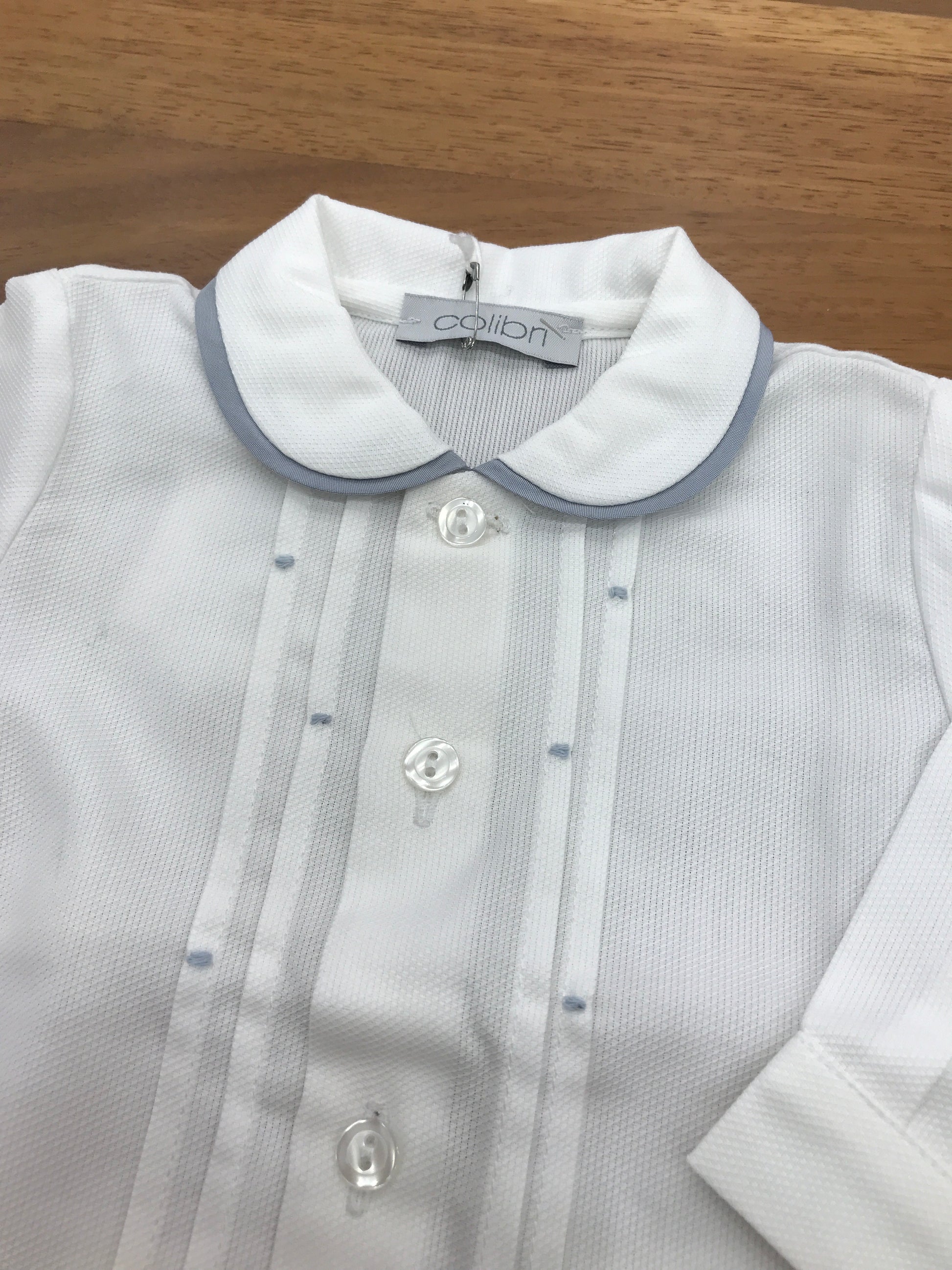 Camicia a maniche lunghe in tinta bianca con bordo celeste, decorata con pois ricamati sul davanti e rifinita con piccoli bottoncini per la chiusura.