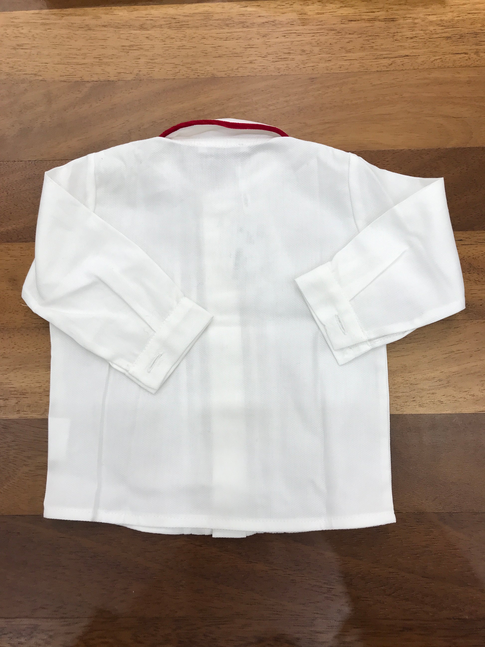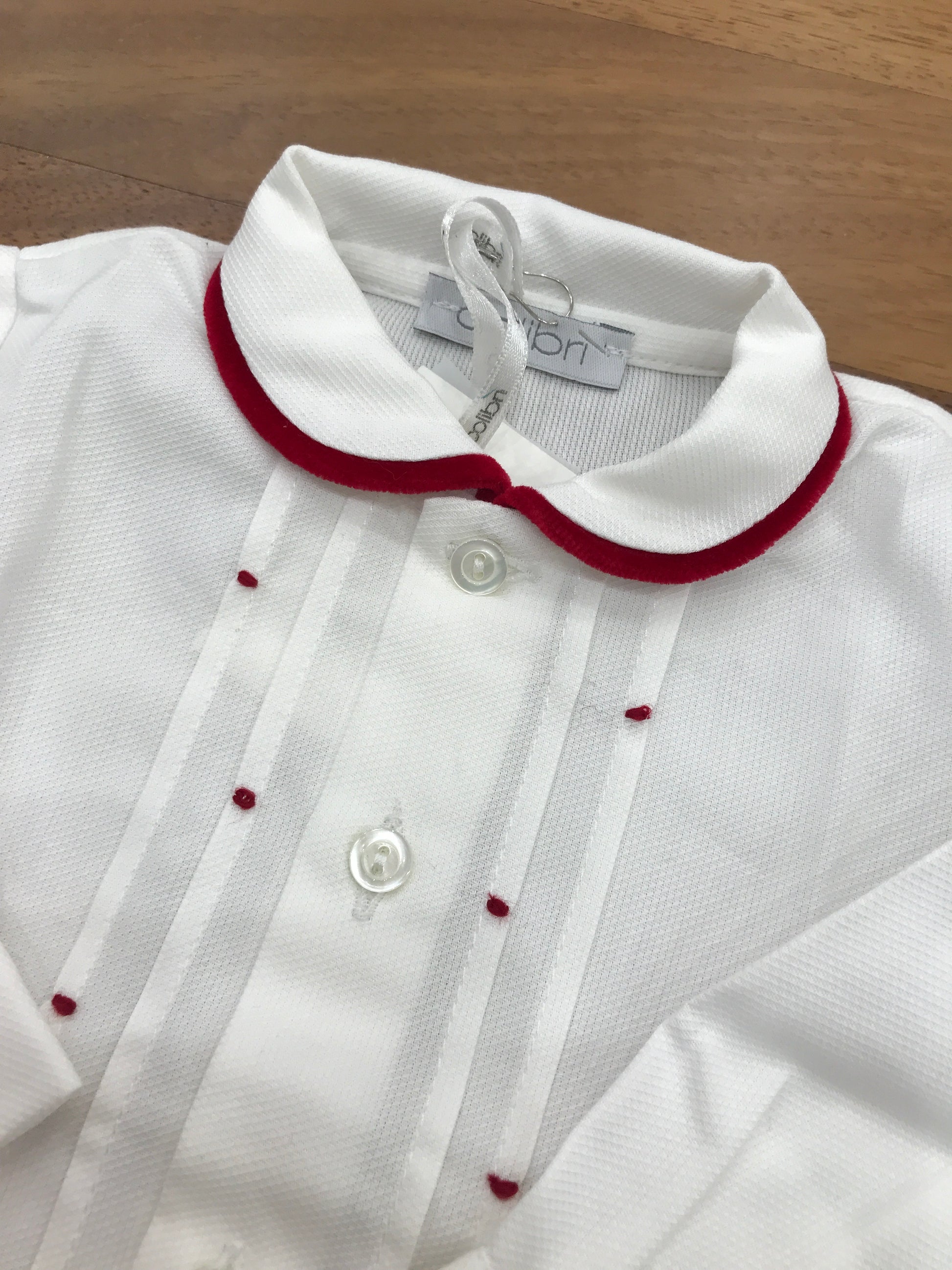 Camicia a maniche lunghe caratterizzata da un colletto in velluto con profilo rosso e dettagli di pois in velluto ricamati sul petto.