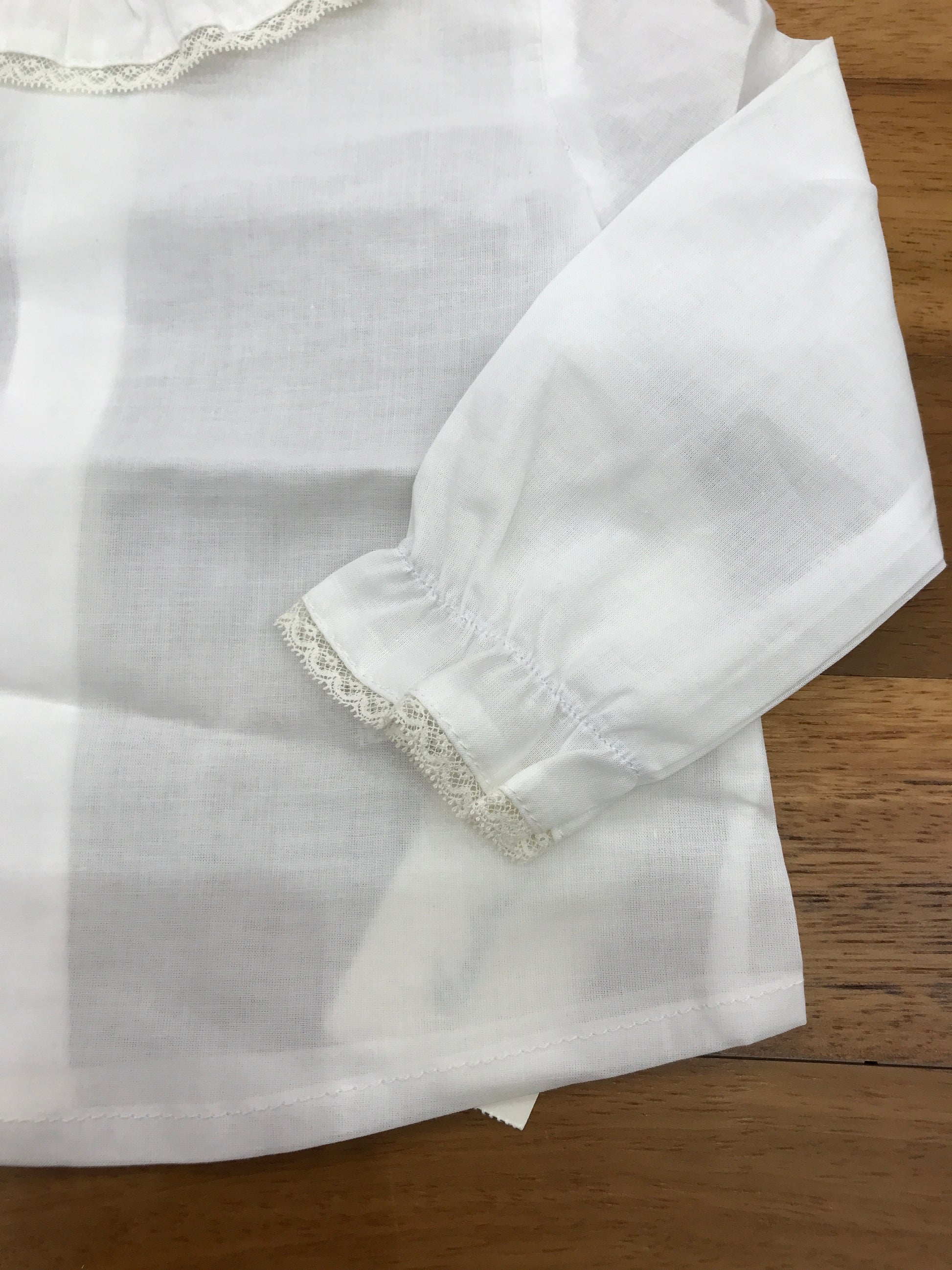 Camicia in cotone a maniche lunghe, con polsini arricciati, colletto decorato da volant e rifinito con pizzo ricamato.