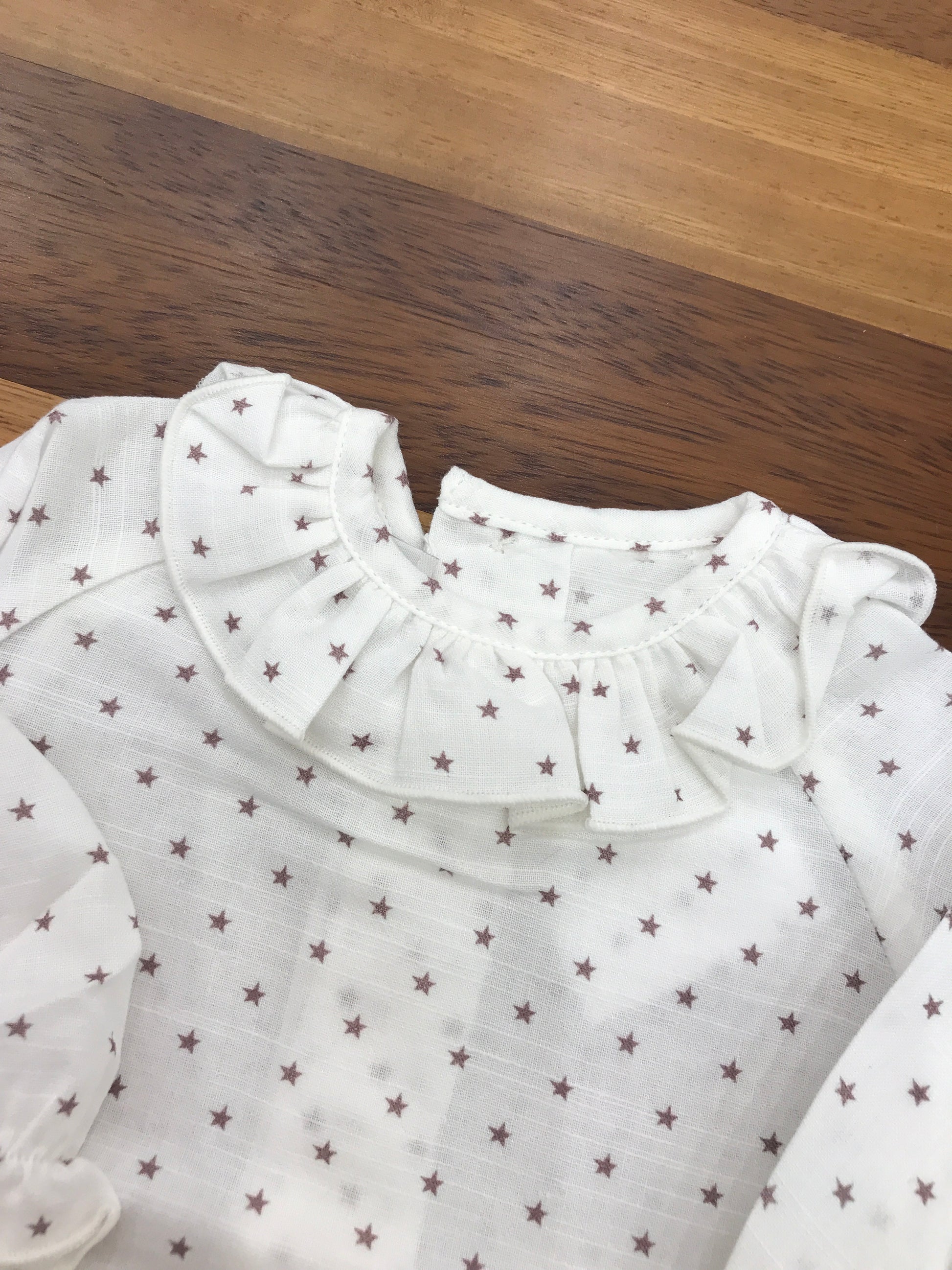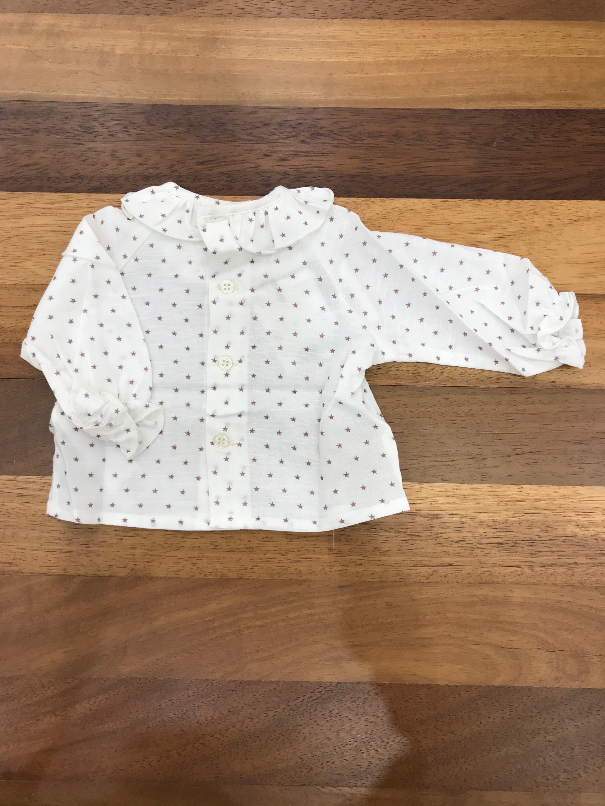 Camicia in cotone dotata di colletto con volant e maniche rifinite con riccetto, arricchita da una decorazione di stelle in un delicato rosa antico.