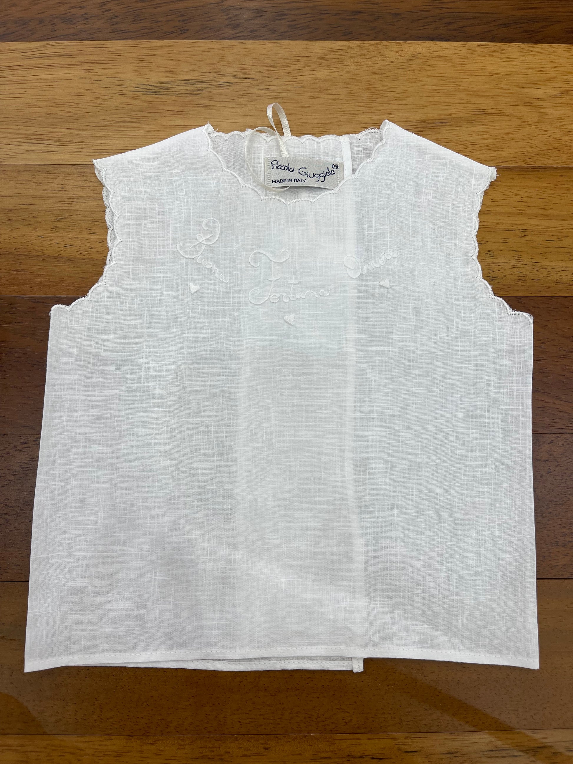 Questo camicino smanicato in puro lino è perfetto per chi cerca qualcosa di leggero e stiloso. Il ricamo fatto a mano "buona fortuna amore" mostra attenzione ai dettagli e aggiunge un tocco di personalità. Indossalo per portare fortuna e amore nella tua vita.