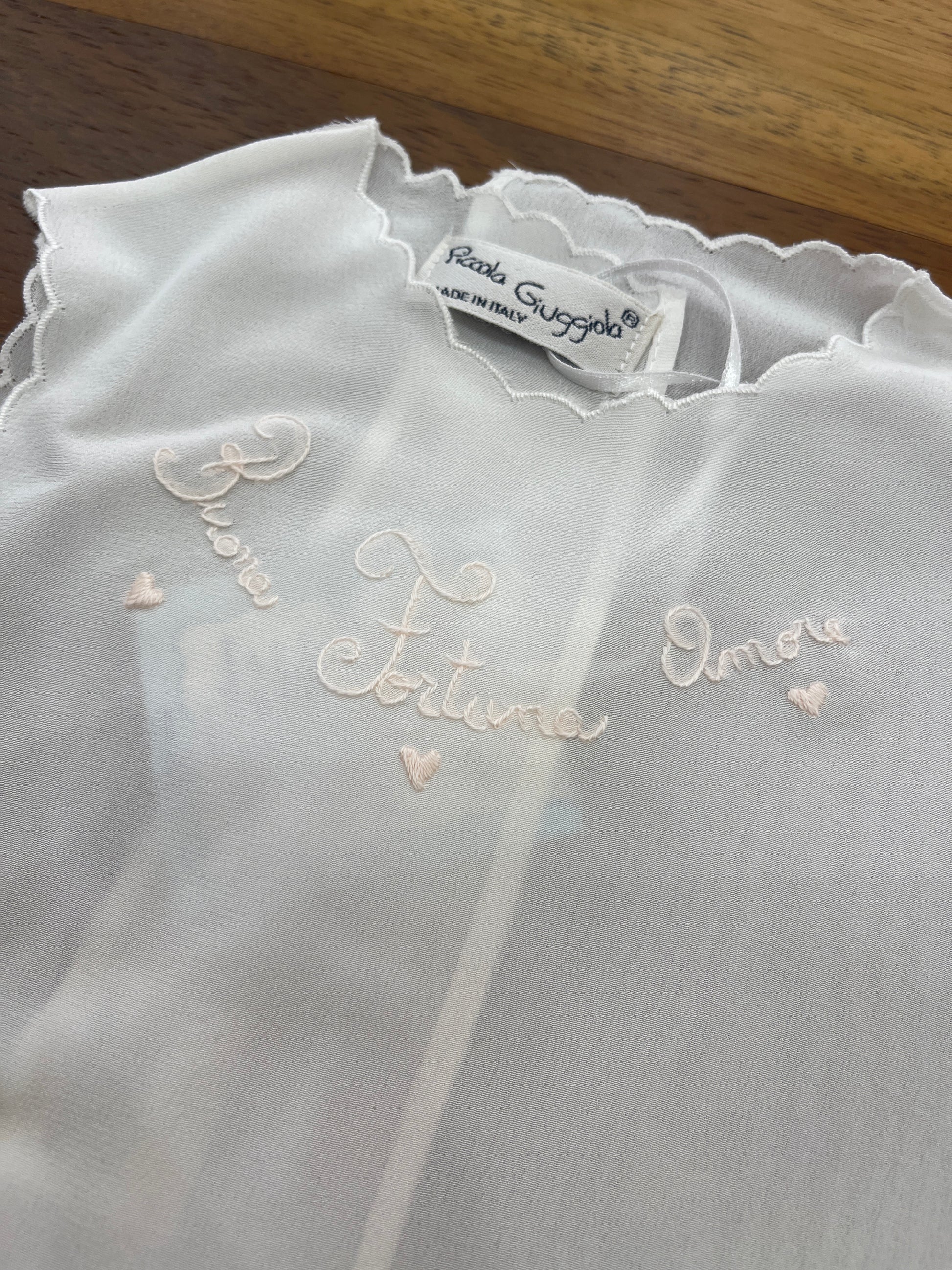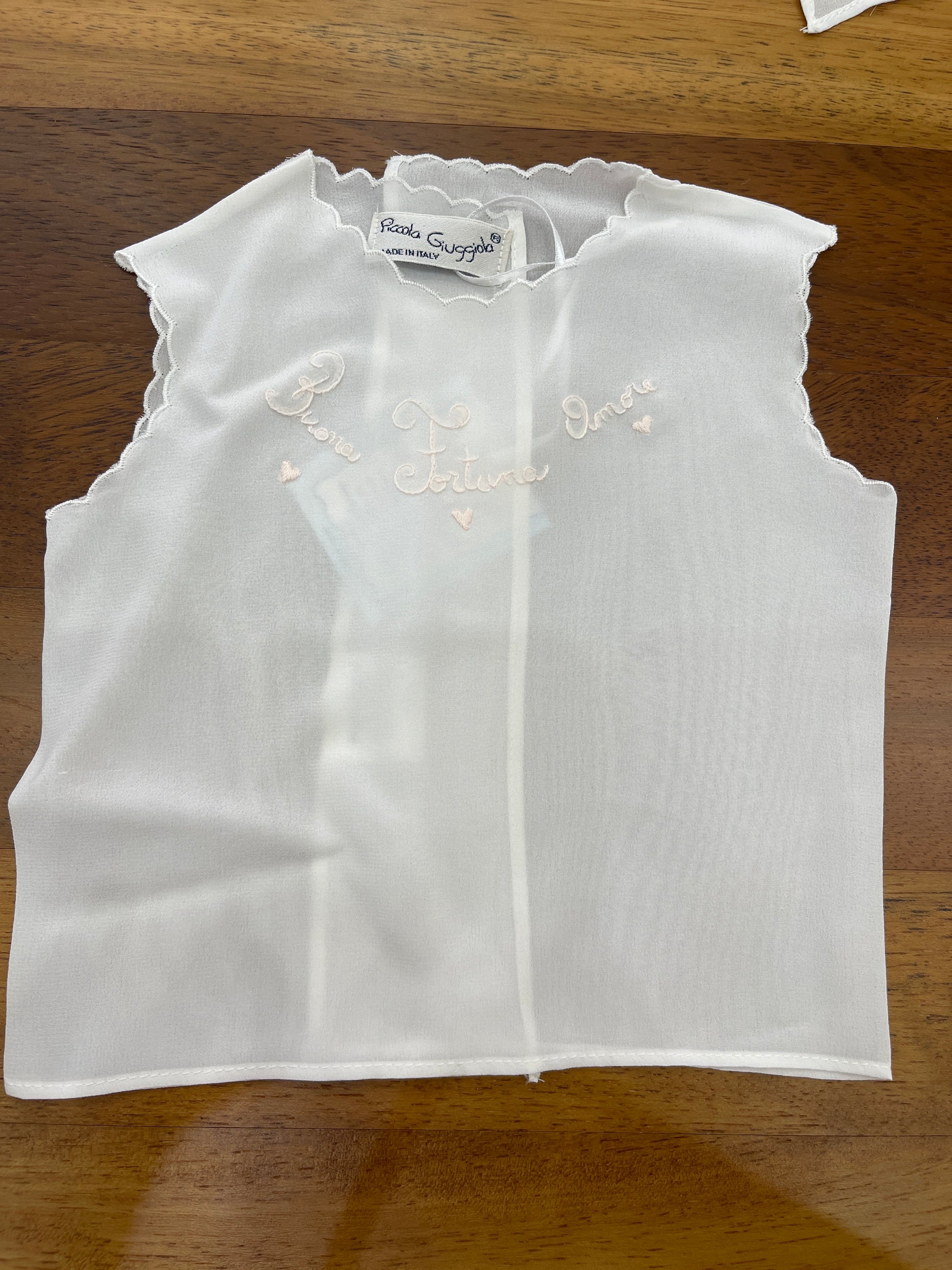 Questo camicino smanicato in pura seta è perfetto per chi cerca qualcosa di leggero e stiloso. Il ricamo fatto a mano "buona fortuna amore" mostra attenzione ai dettagli e aggiunge un tocco di personalità. Indossalo per portare fortuna e amore nella tua vita.