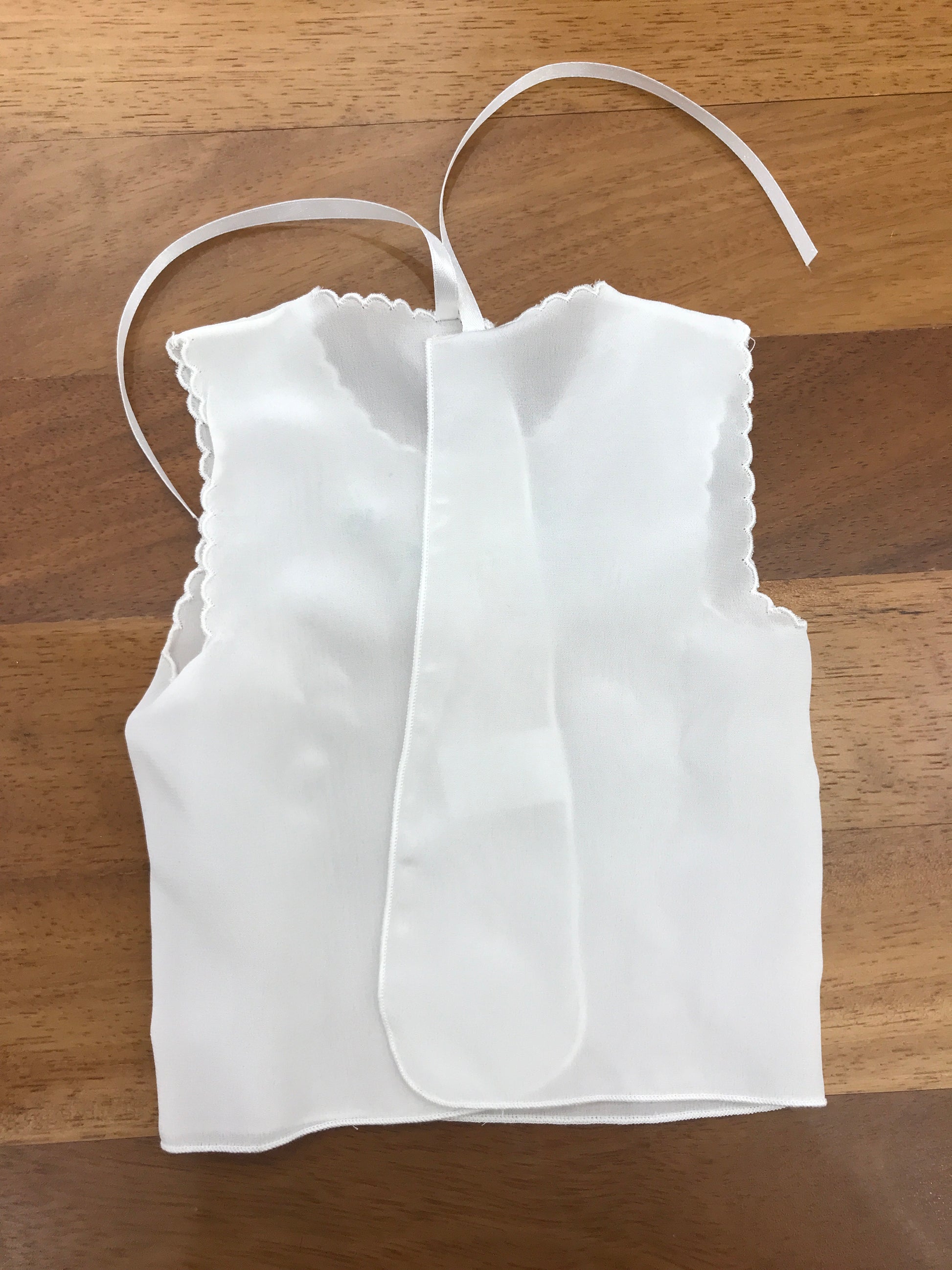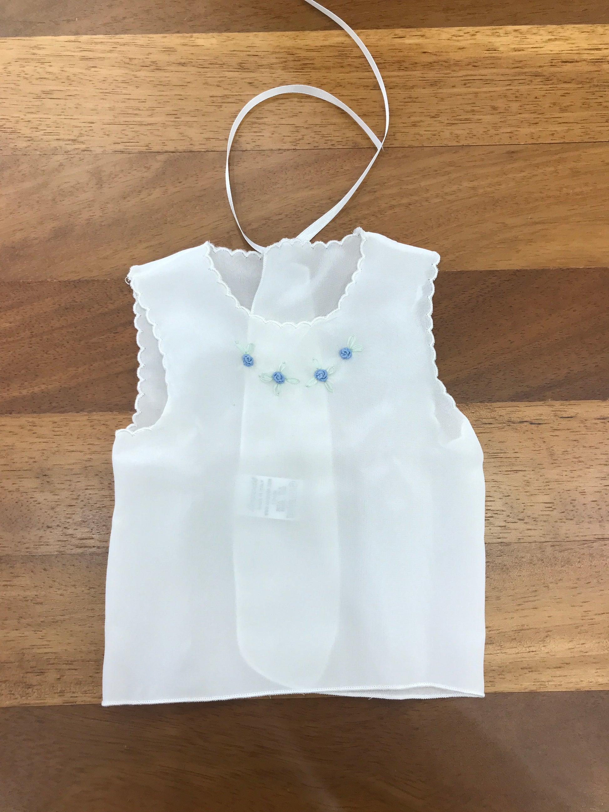 Camicino in seta impreziosito da rose blu ricamate a mano sul davanti, con delicati laccetti sul retro per una chiusura raffinata.