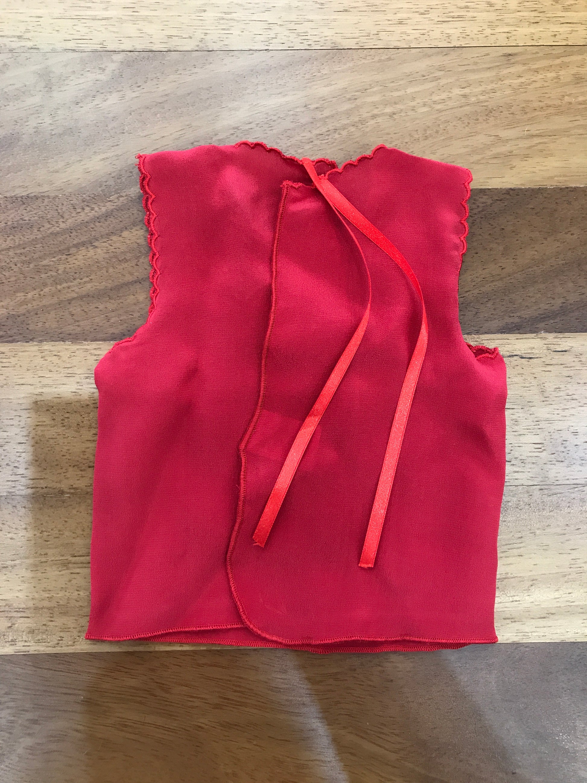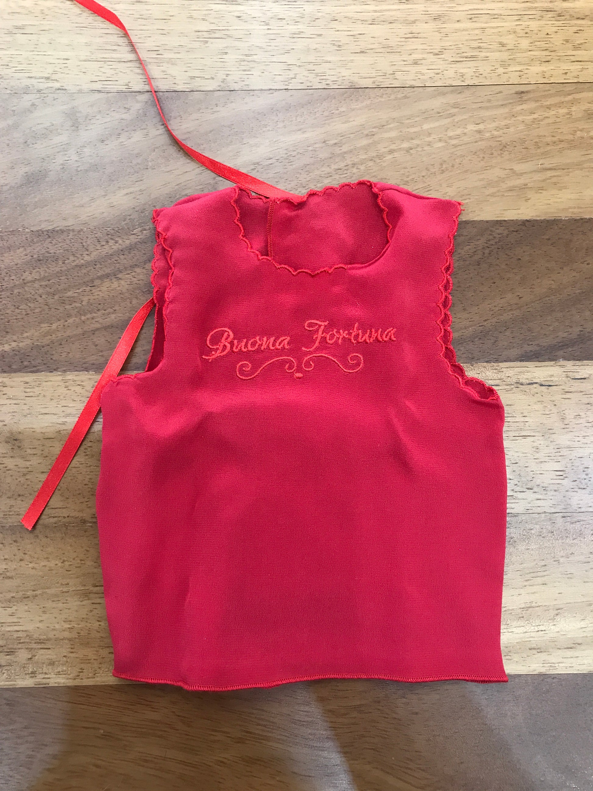 Camicino in seta color rosso intenso, caratterizzato da lacci delicati sul retro per la chiusura. Sul davanti è impreziosito da un ricamo artigianale con la scritta "buona fortuna".