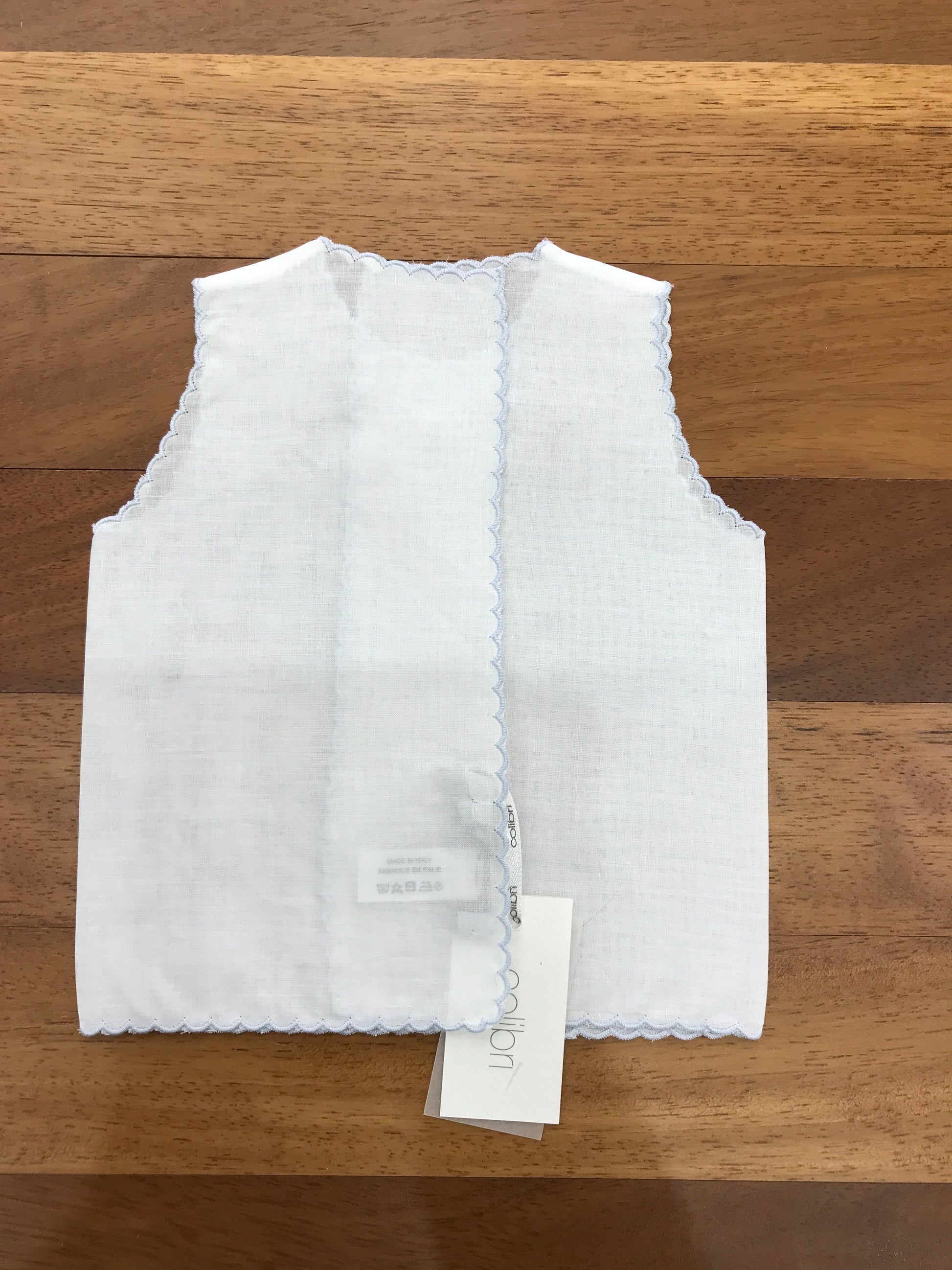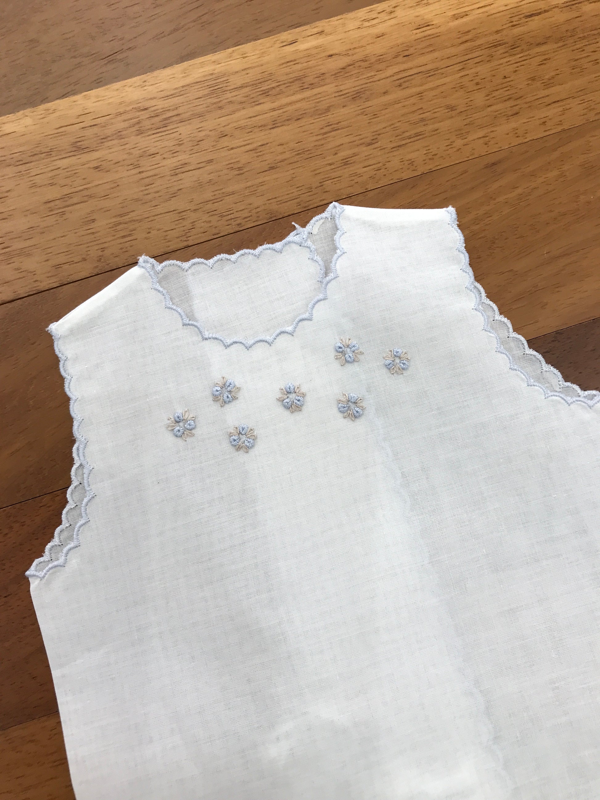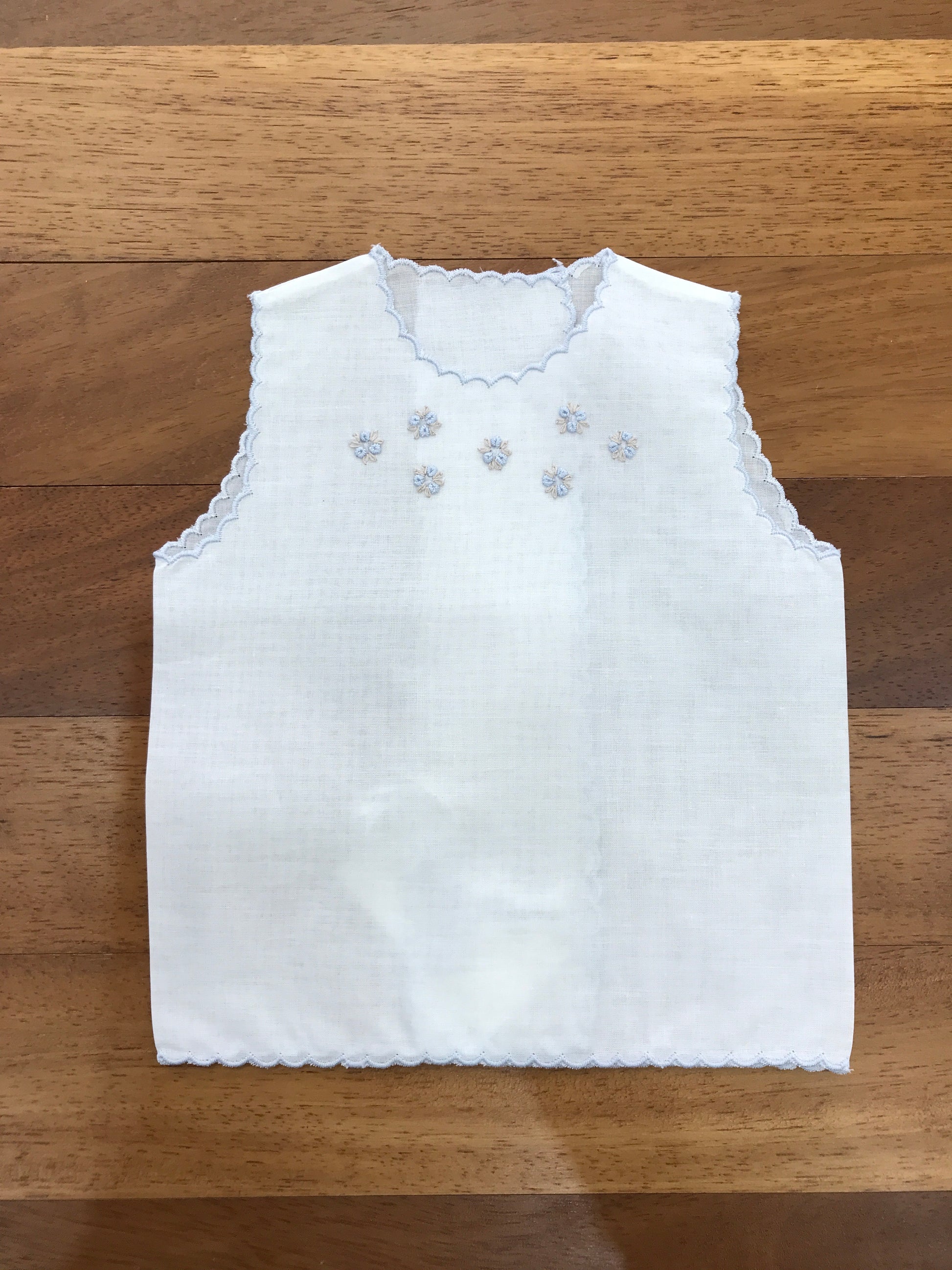 Camicino in lino bianco, senza maniche, rifinito con bordi celeste e decorato con ricami floreali nei toni celeste e beige.