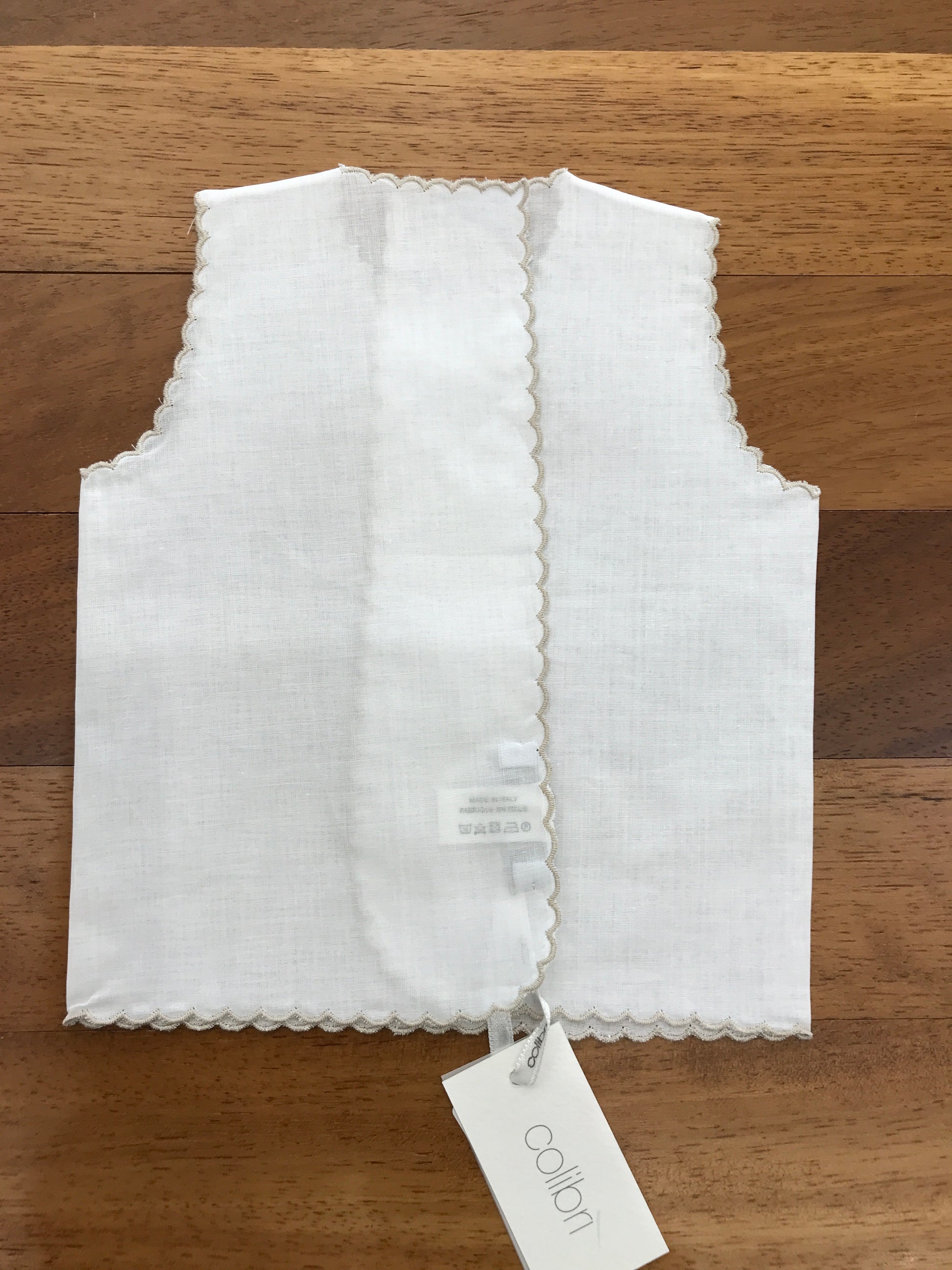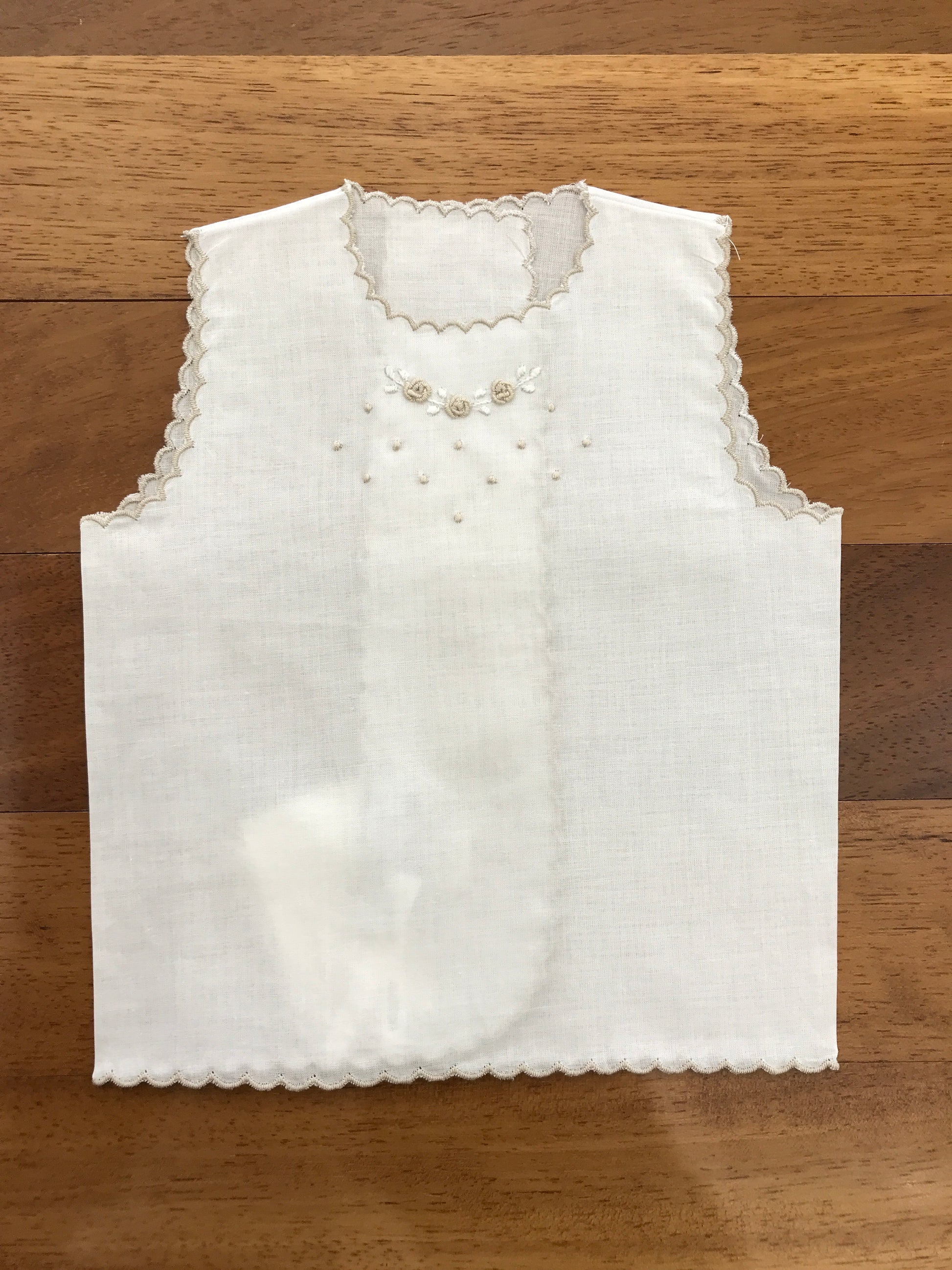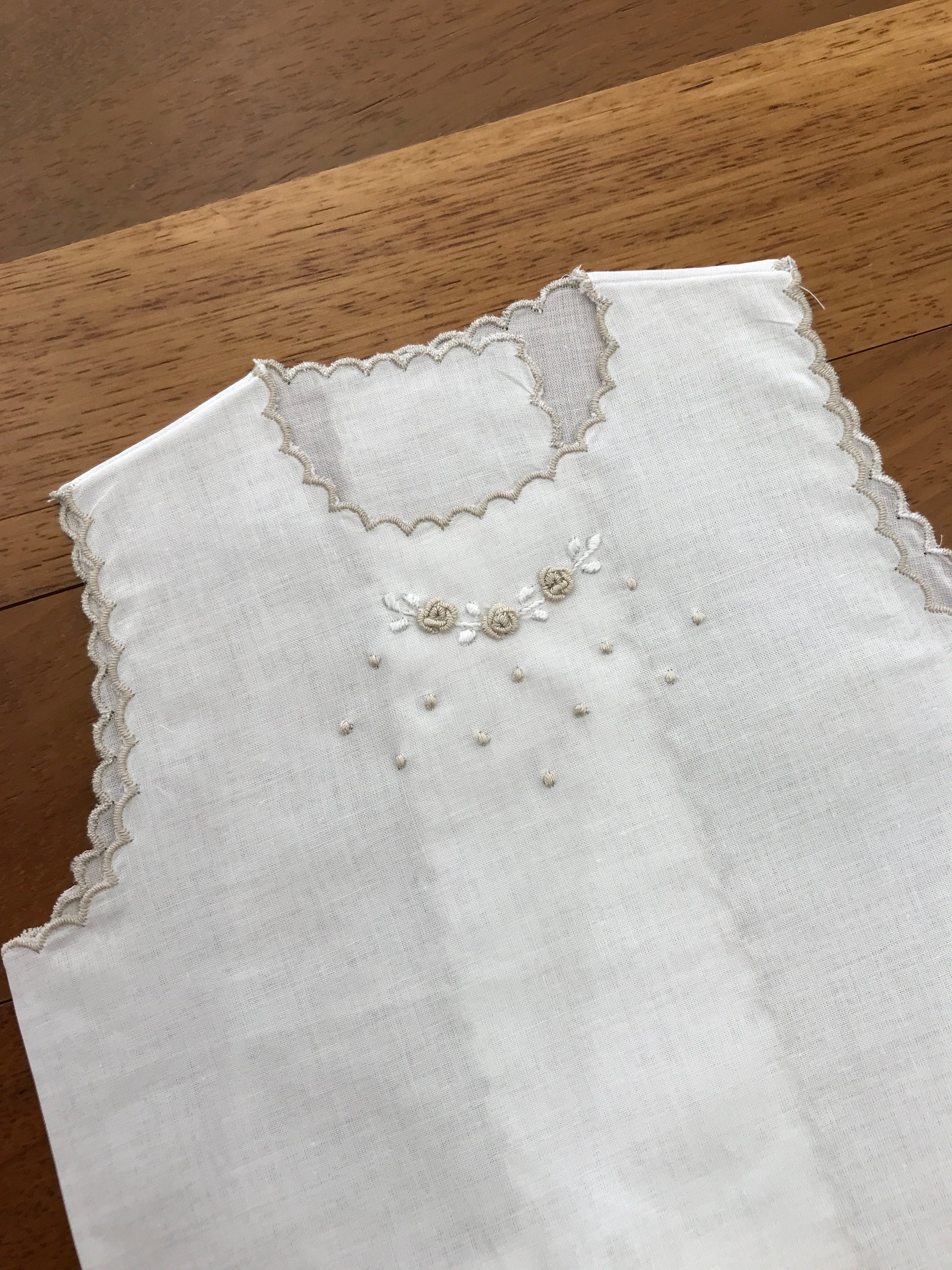 Camicino in lino bianco senza maniche, rifinito con bordi tortora. Sul davanti presenta ricami di pois e rose sul petto.