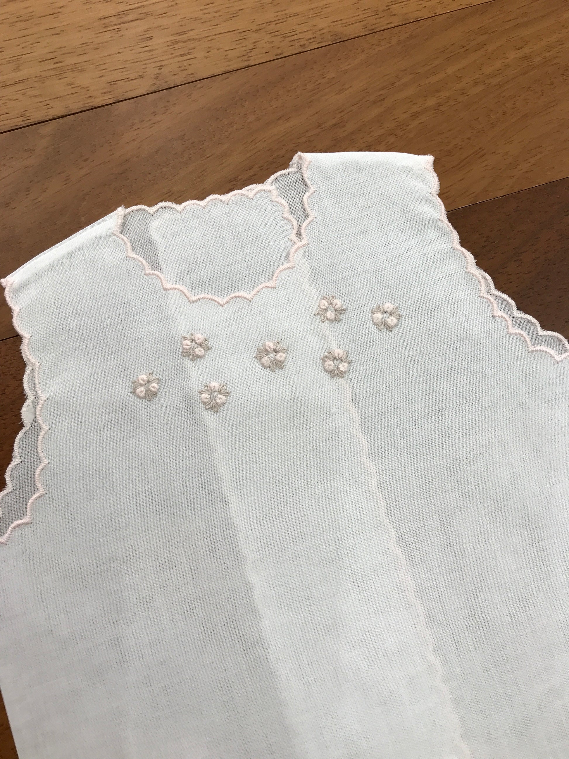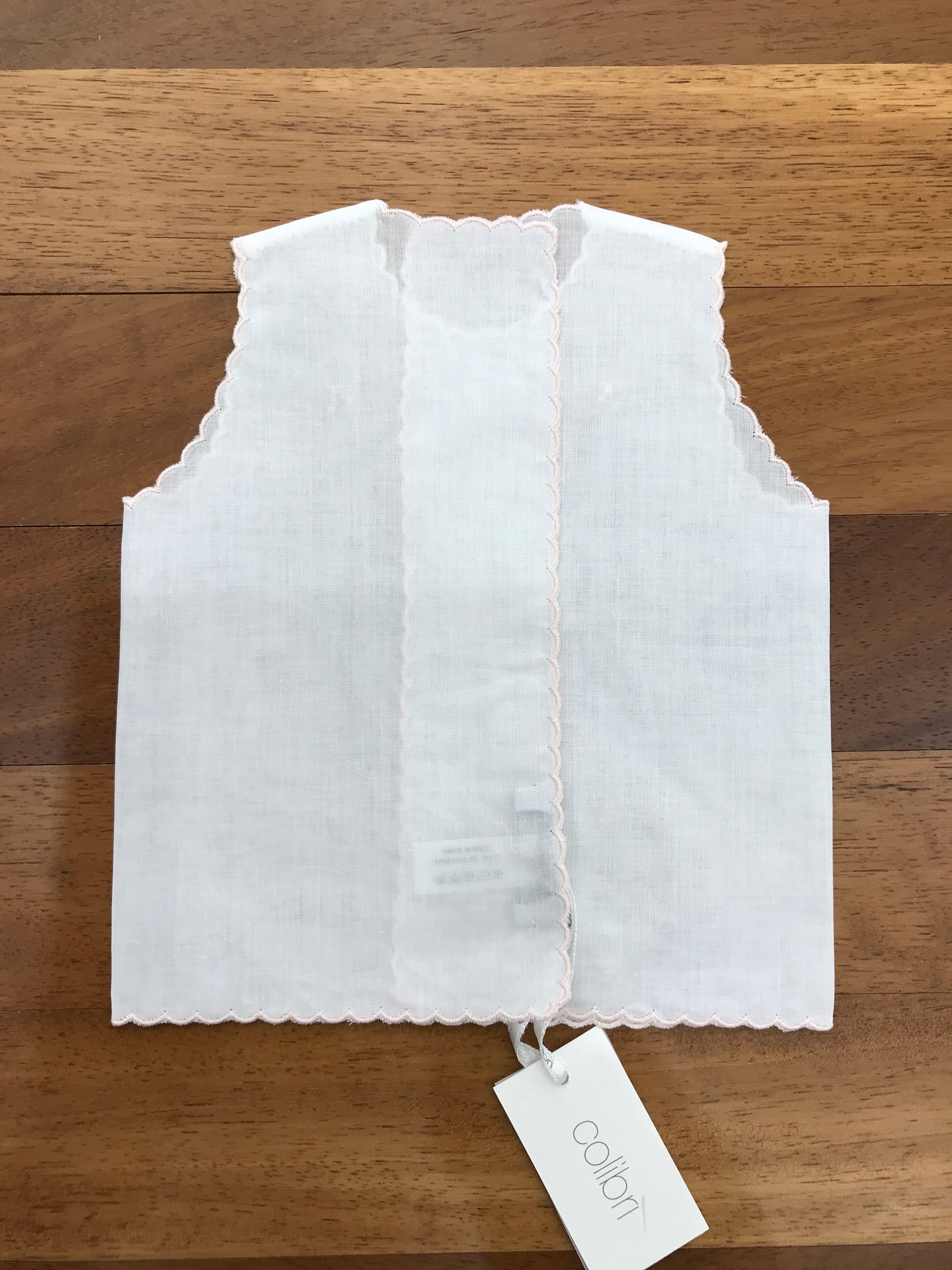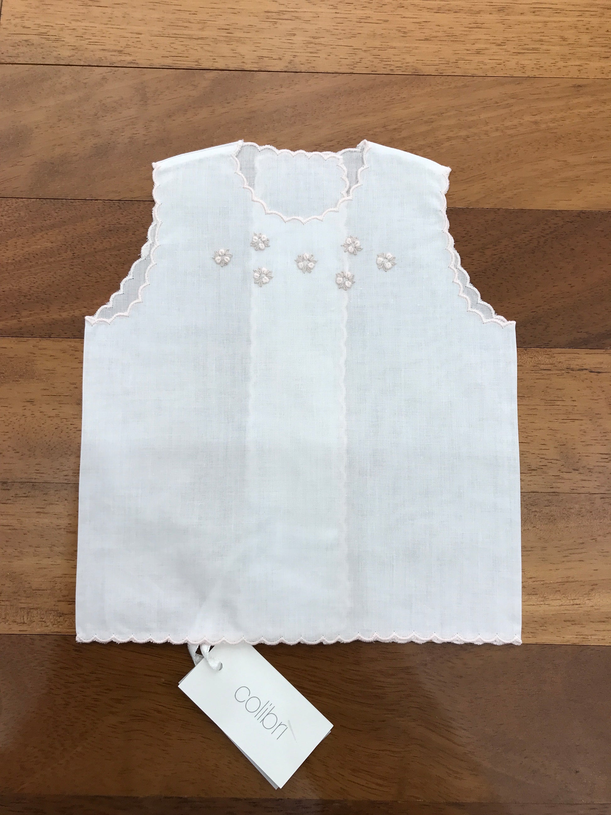 Camicino in lino bianco senza maniche, rifinito con bordi rosa, decorato al centro sul petto da delicati fiori ricamati a mano.