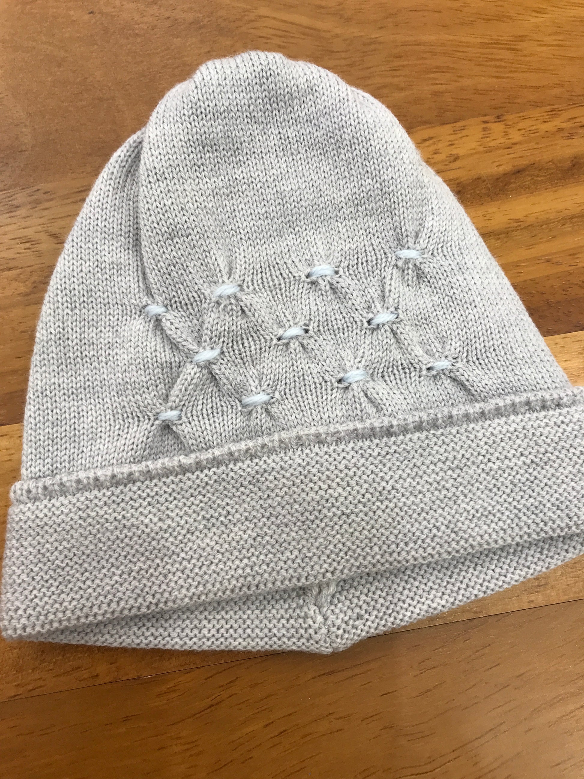 Questo cappellino in lana presenta un risvolto e una raffinata lavorazione a punto smok bicolore, ideale per garantire comfort e stile ai più piccoli.