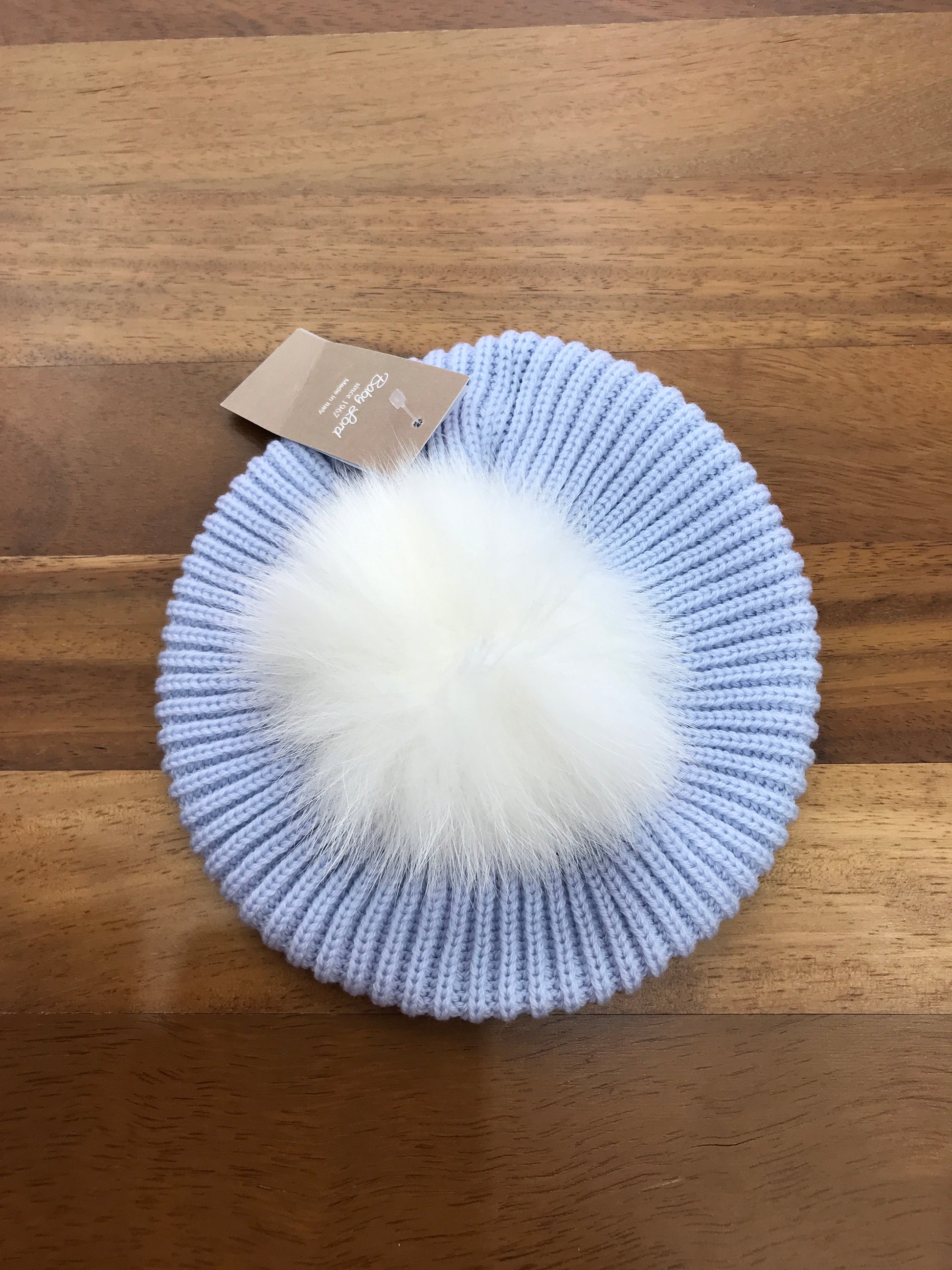 Cappellino in tonalità celeste cielo, arricchito da un grande pon pon bianco e soffice posizionato al centro della testa.