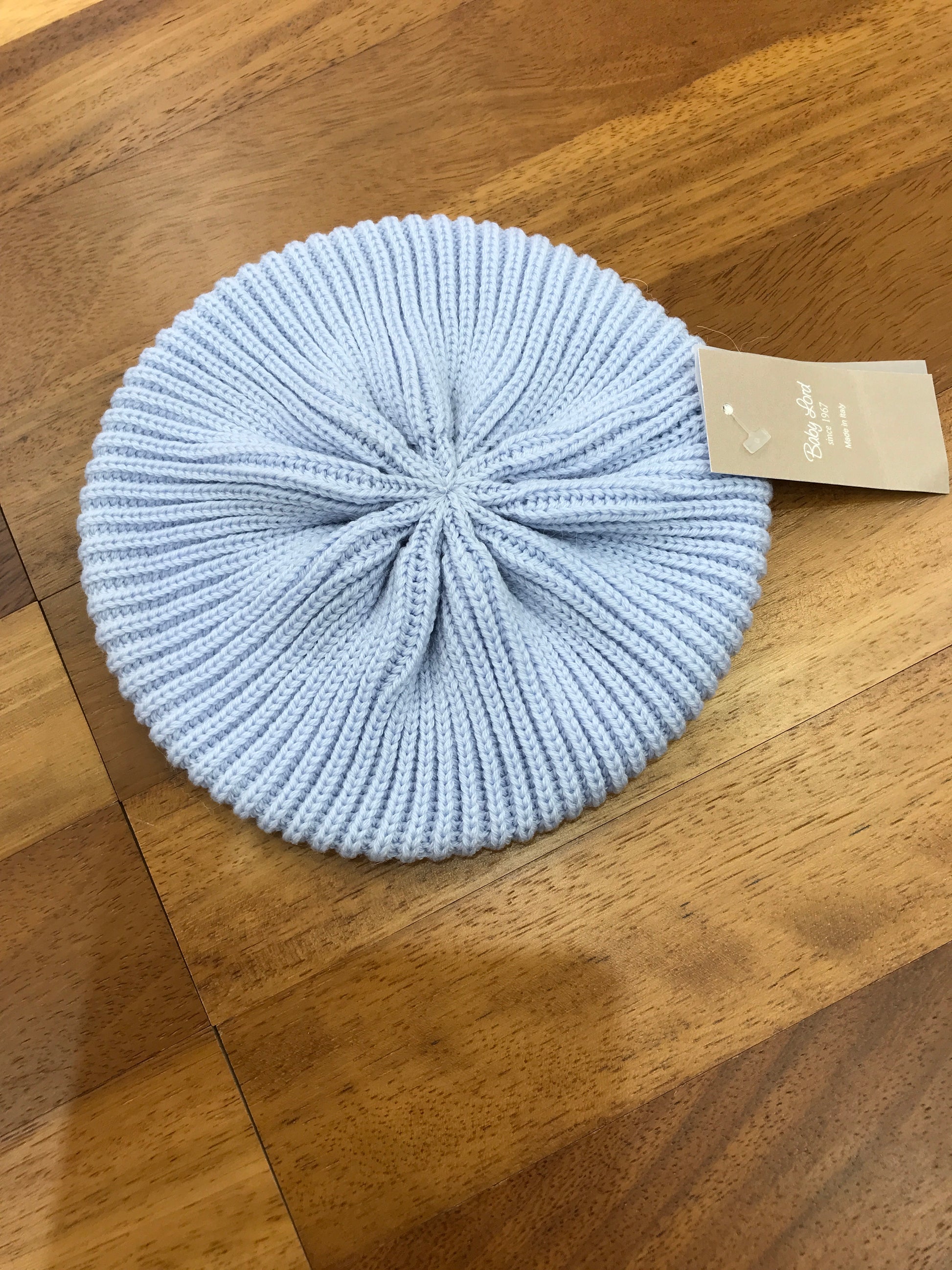 Questo cappellino in lana, di colore azzurro, presenta un design semplice e senza decorazioni, caratterizzato da una tinta unita.
